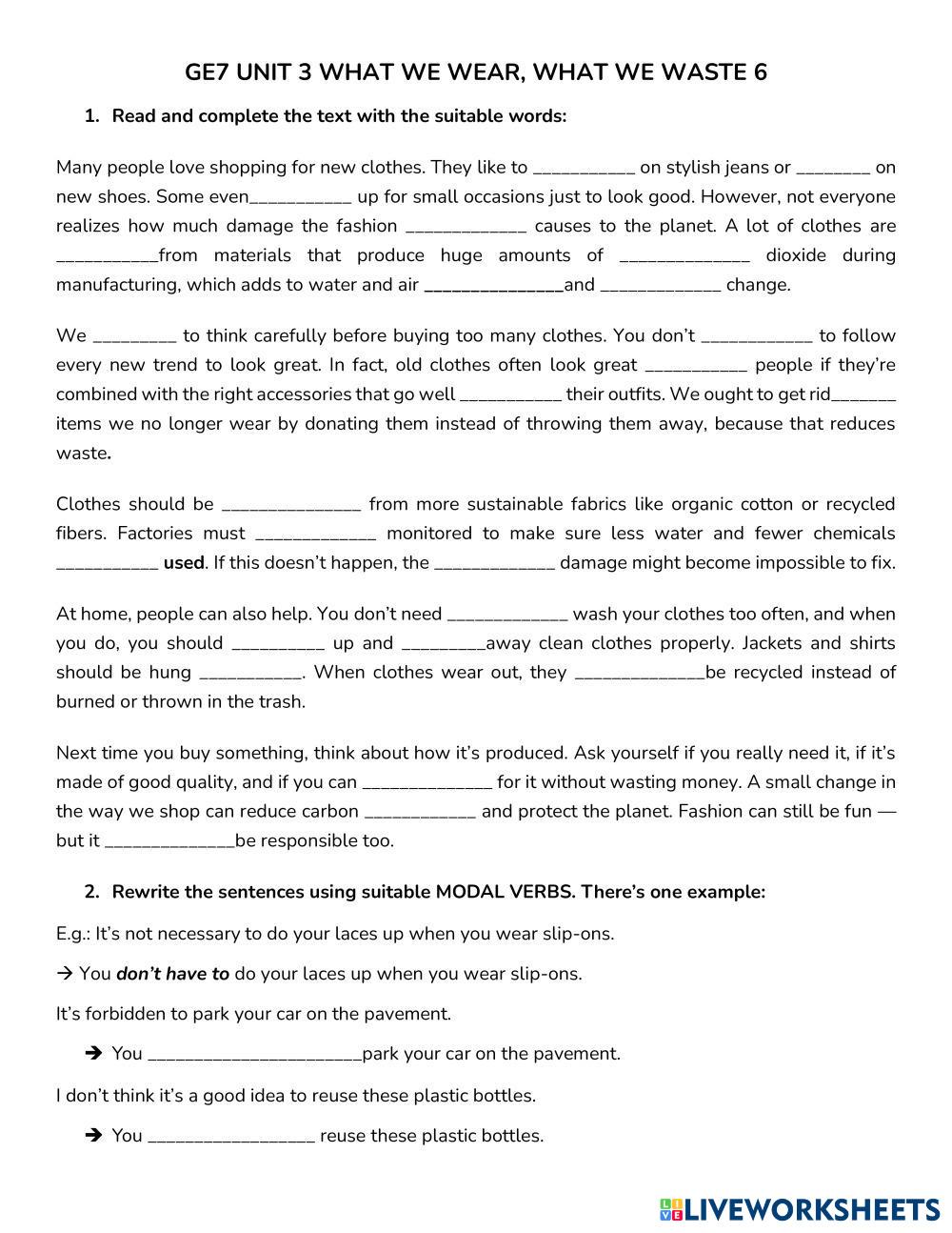 Created by Brie12 ESL English B1-Intermediate Grammar English Author's Instructions GE7 U3 REVISION My Google Classroom Courses × 0 classes selected (0 students total) Quick Access Select all classes (0 classes) All Classes Loading courses... Cancel Share Share to selected Course __COURSE_NAME__ __STUDENT_NAME__ (__STUDENT_EMAIL__) GE7 UNIT 3 FASHION INDUSTRY 6A Download Worksheet Validation Check my answers Emails my answers to my teacher Full name Group/level School subject Teacher's email or key code Close Submit Validating worksheet... (12) Your answers have been sent to your teacher. Good luck! OK We encountered an error submitting your answers. Please try again. OK Advertisement | Go Ad Free Created by Brie12 ESL English B1-Intermediate Grammar English Author's Instructions GE7 U3 REVISION Explore Worksheets G6 - MULTIPLE CHOICE - U2 - PART - II ESL B1-Intermediate G6 - MULTIPLE CHOICE - U2 - PART - II Grammar - ESL MULTIPLE CHOICE Present simple vs present continuous ESL B1-Intermediate Present simple vs present continuous Grammar - ESL English as a second language Present simple vs continuous grammar exercises Main content: Present simple and present continuous Present Simple Tense ESL B1-Intermediate Present Simple Tense Grammar - ESL Write the correct answer. English as a Second Language Main content: Present Simple Other contents: Subject verb agreement reported speech ESL B1-Intermediate reported speech Grammar - ESL speech