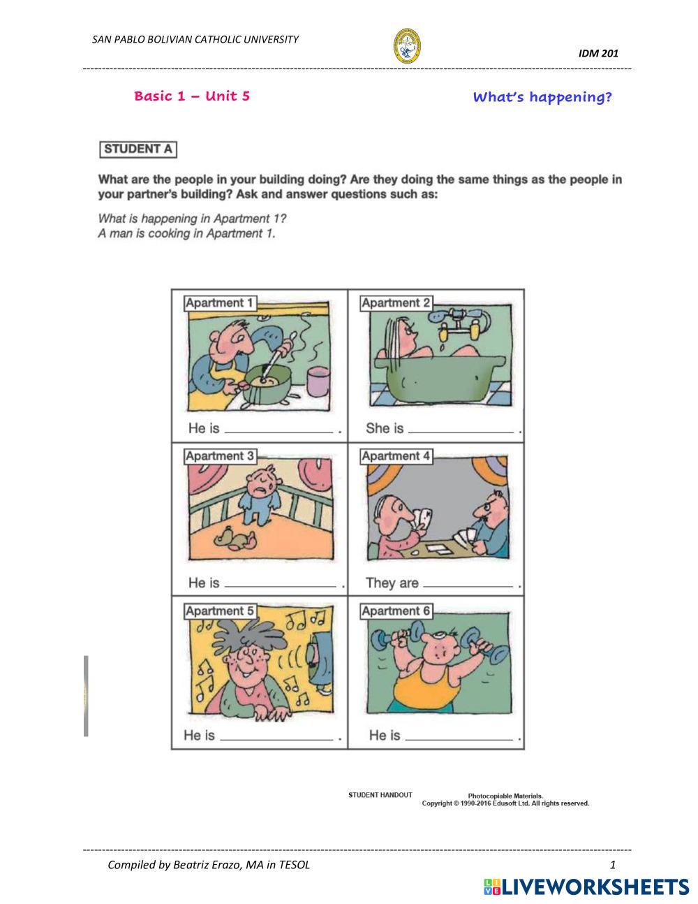 Created byBeatriz Erazo ESL English A1 Grammar English Author's Instructions Students complete the task in pairs. My Google Classroom Courses × 0 classes selected (0 students total) Quick Access Select all classes (0 classes) All Classes Loading courses... Cancel Share Share to selected Course __COURSE_NAME__ __STUDENT_NAME__ (__STUDENT_EMAIL__) UCB IDM 201 - Basic 1 - Unit 5 - What's happening A Download Worksheet Validation Check my answers Emails my answers to my teacher Full name Group/level School subject Teacher's email or key code Close Submit Validating worksheet... (12) Your answers have been sent to your teacher. Good luck! OK We encountered an error submitting your answers. Please try again. OK Advertisement | Go Ad Free Created byBeatriz Erazo ESL English A1 Grammar English Author's Instructions Students complete the task in pairs. Explore Worksheets modals ESL A1 modals Grammar - ESL answer 5.3. TEST ESL A1 5.3. TEST Grammar - ESL Listen and write the genre. Look and choose. Look and complete. Read and match. Answer the question for you. 5.3. READING ESL A1 5.3. READING Grammar - ESL Read and write the names. Read and tick ✔ the true sentences. 5.3. LISTENING ESL A1 5.3. LISTENING Grammar - ESL Listen and complete. Listen and match.