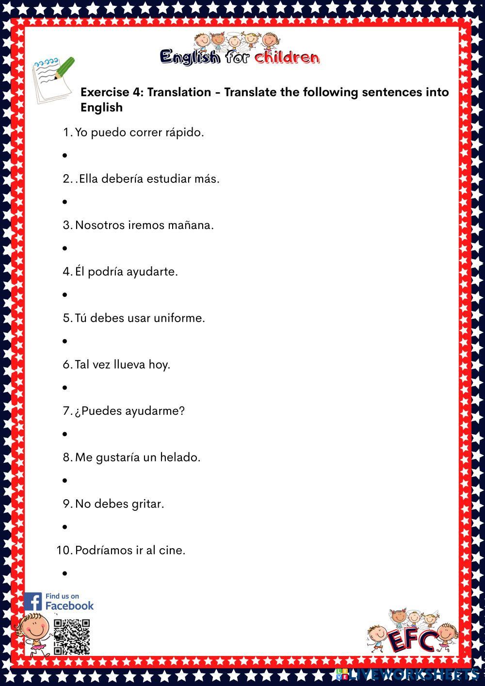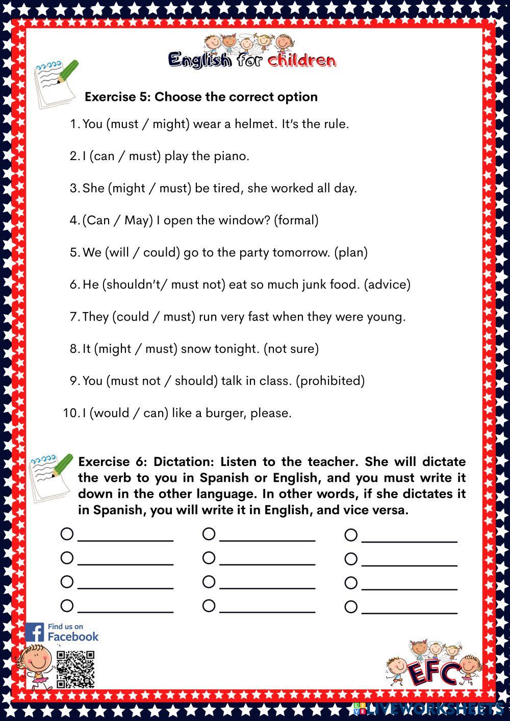 Created byEnglish for children ESL B1 Grammar English Author's Instructions READ AND FOLLOW THE INSTRUCTIONS My Google Classroom Courses × 0 classes selected (0 students total) Quick Access Select all classes (0 classes) All Classes Loading courses... Cancel Share Share to selected Course __COURSE_NAME__ __STUDENT_NAME__ (__STUDENT_EMAIL__) MODAL VERBS BY EFC Download Worksheet Validation Check my answers Emails my answers to my teacher Full name Group/level School subject Teacher's email or key code Close Submit Validating worksheet... (12) Your answers have been sent to your teacher. Good luck! OK We encountered an error submitting your answers. Please try again. OK Advertisement | Go Ad Free Created byEnglish for children ESL B1 Grammar English Author's Instructions READ AND FOLLOW THE INSTRUCTIONS Explore Worksheets I1 - Lesson 08 - Reported Speech (Future tenses) ESL B1 I1 - Lesson 08 - Reported Speech (Future tenses) Grammar - ESL Reported Speech (Future tenses: Simple Future, Future Continuous, Future Perfect) Present Simple Tense ESL B1 Present Simple Tense Grammar - ESL Write the correct answer. English as a Second Language Main content: Present Simple Other contents: Subject verb agreement Grammar Worksheet 1 ESL B1 Grammar Worksheet 1 Grammar - ESL Complete the worksheet Present simple vs present continuous ESL B1 Present simple vs present continuous Grammar - ESL English as a second language Present simple vs continuous grammar exercises Main content: Present simple and present continuous