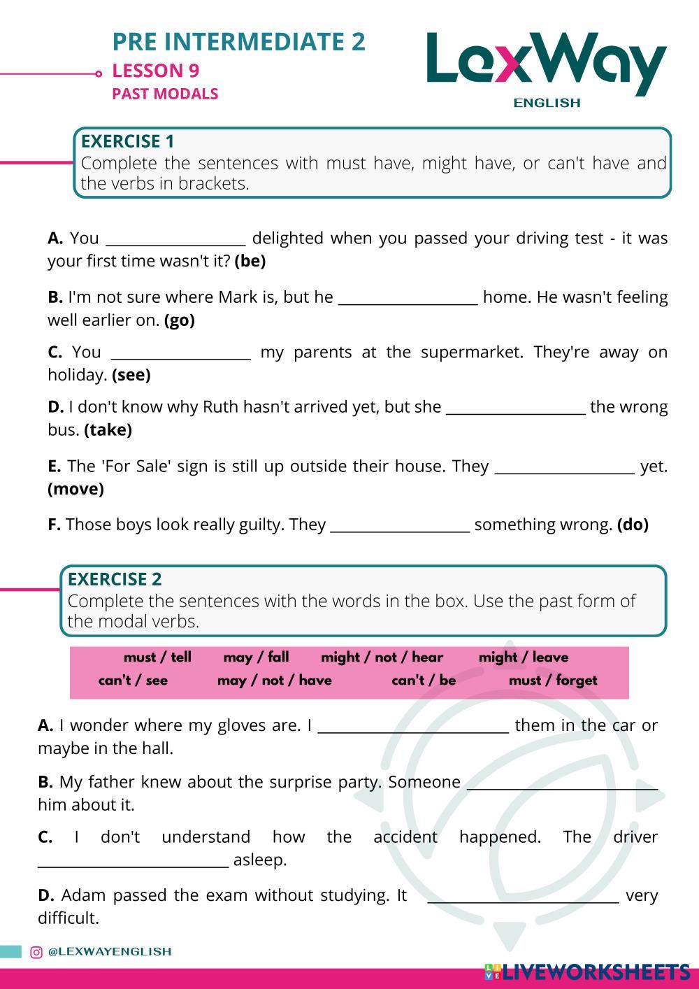 Created byLexWay English ESL English B1 Grammar English Author's Instructions Students will practice Past Modals My Google Classroom Courses × 0 classes selected (0 students total) Quick Access Select all classes (0 classes) All Classes Loading courses... Cancel Share Share to selected Course __COURSE_NAME__ __STUDENT_NAME__ (__STUDENT_EMAIL__) PI2 - Lesson 09 - Past Modals Download Worksheet Validation Check my answers Emails my answers to my teacher Full name Group/level School subject Teacher's email or key code Close Submit Validating worksheet... (12) Your answers have been sent to your teacher. Good luck! OK We encountered an error submitting your answers. Please try again. OK Advertisement | Go Ad Free Created byLexWay English ESL English B1 Grammar English Author's Instructions Students will practice Past Modals Explore Worksheets Present simple vs present continuous ESL B1 Present simple vs present continuous Grammar - ESL English as a second language Present simple vs continuous grammar exercises Main content: Present simple and present continuous Defining & Non-defining ESL B1 Defining & Non-defining Grammar - ESL . Past Simple vs Present Perfect ESL B1 Past Simple vs Present Perfect Grammar - ESL English as a second language by anmafan Main content: Present perfect or past simple Present Perfect Simple - positive and negative ESL B1 Present Perfect Simple - positive and negative Grammar - ESL English as a second language Worksheet on present perfect simple Main content: Present perfect Other contents: present perfect simple, form, positive, negative