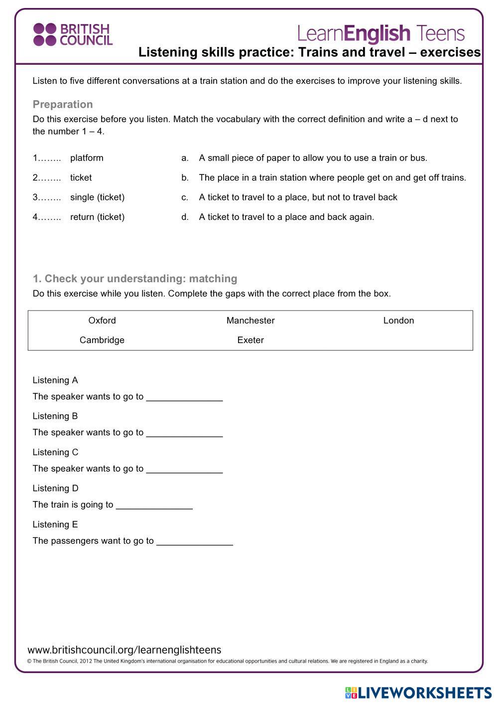 Created byEstefany Ulloa ESL English A1 Grammar English Author's Instructions Students must complete the worksheet based on the listening. My Google Classroom Courses × 0 classes selected (0 students total) Quick Access Select all classes (0 classes) All Classes Loading courses... Cancel Share Share to selected Course __COURSE_NAME__ __STUDENT_NAME__ (__STUDENT_EMAIL__) MEANS OF TRANSPORTATION Download Worksheet Validation Check my answers Emails my answers to my teacher Full name Group/level School subject Teacher's email or key code Close Submit Validating worksheet... (12) Your answers have been sent to your teacher. Good luck! OK We encountered an error submitting your answers. Please try again. OK Advertisement | Go Ad Free Created byEstefany Ulloa ESL English A1 Grammar English Author's Instructions Students must complete the worksheet based on the listening. Explore Worksheets COURSEBOOK UNIT 6 ESL A1 COURSEBOOK UNIT 6 Grammar - ESL Coursebook Unit 6 Was or were ESL A1 Was or were Grammar - ESL English as a second language positive, negative, questions Main content: Past simple Other contents: verb to be Unit 5 - Inventions Life 1 ESL A1 Unit 5 - Inventions Life 1 Grammar - ESL Complete the exercises correctly. “Be Going To” – Future Plans & Predictions Worksheet ESL A1 “Be Going To” – Future Plans & Predictions Worksheet Grammar - ESL Interactive worksheet para practicar el uso de BE GOING TO en inglés. Los estudiantes completan oraciones y hacen predicciones según distintas situaciones.
