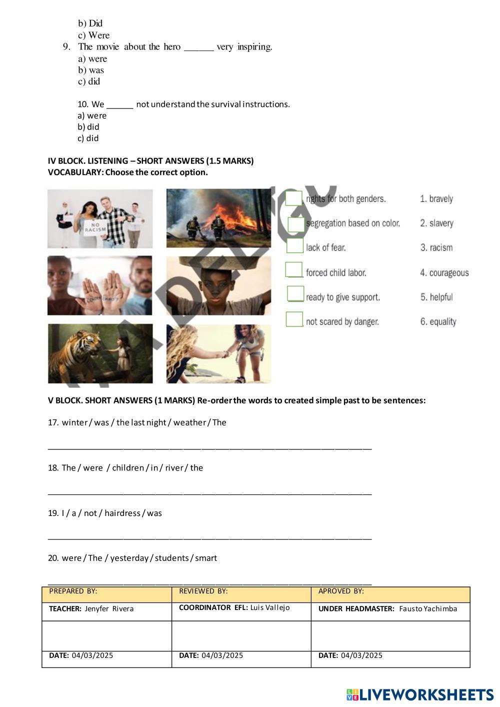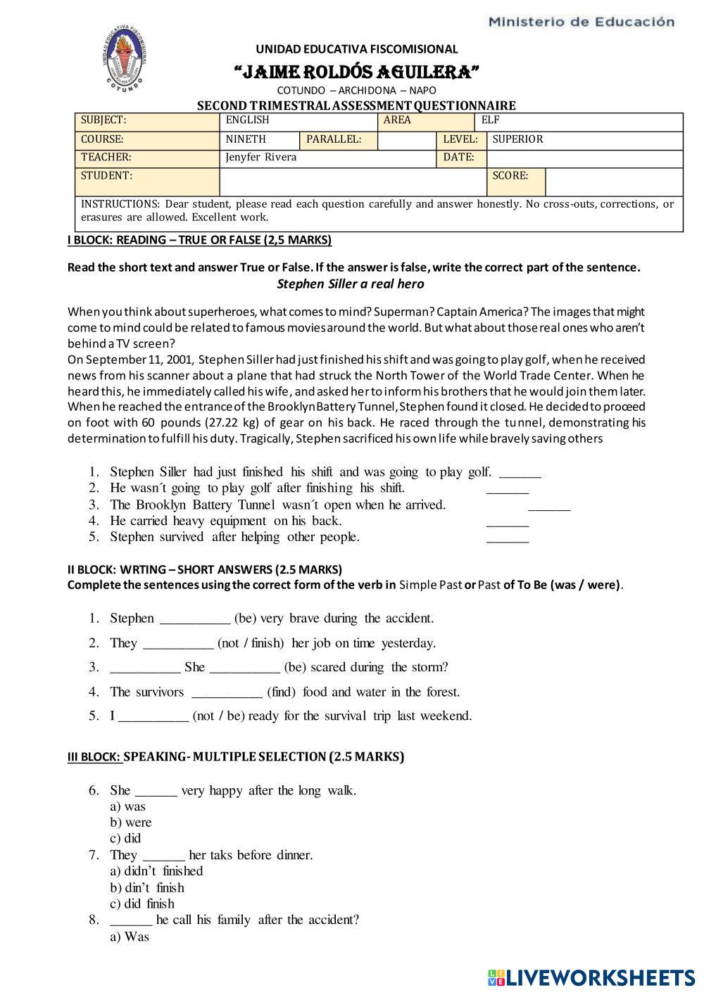 Created byJenyfer Cristina Rivera Vinces ESL English A2 Grammar English Author's Instructions Read carefully each questions My Google Classroom Courses × 0 classes selected (0 students total) Quick Access Select all classes (0 classes) All Classes Loading courses... Cancel Share Share to selected Course __COURSE_NAME__ __STUDENT_NAME__ (__STUDENT_EMAIL__) EVALUATION 9TH A Download Worksheet Validation Check my answers Emails my answers to my teacher Full name Group/level School subject Teacher's email or key code Close Submit Validating worksheet... (12) Your answers have been sent to your teacher. Good luck! OK We encountered an error submitting your answers. Please try again. OK Advertisement | Go Ad Free Created byJenyfer Cristina Rivera Vinces ESL English A2 Grammar English Author's Instructions Read carefully each questions Explore Worksheets Present Simple vs Present Continuous ESL A2 Present Simple vs Present Continuous Grammar - ESL English as a second language Present simple and present continuous: Choose the correct verb form Foreign Teacher_S5_W29_U9_Vocabulary 2 & KET Speaking ESL A2 Foreign Teacher_S5_W29_U9_Vocabulary 2 & KET Speaking Grammar - ESL Foreign Teacher_S5_W29_U9_Vocabulary 2 & KET Speaking Viet Teacher_S5_W29_U9_Grammar 2 & Grammar 1 Revision ESL A2 Viet Teacher_S5_W29_U9_Grammar 2 & Grammar 1 Revision Grammar - ESL Viet Teacher_S5_W29_U9_Grammar 2 & Grammar 1 Revision Diagnostic Test Kids 4 ESL A2 Diagnostic Test Kids 4 Grammar - ESL Solve the exercises