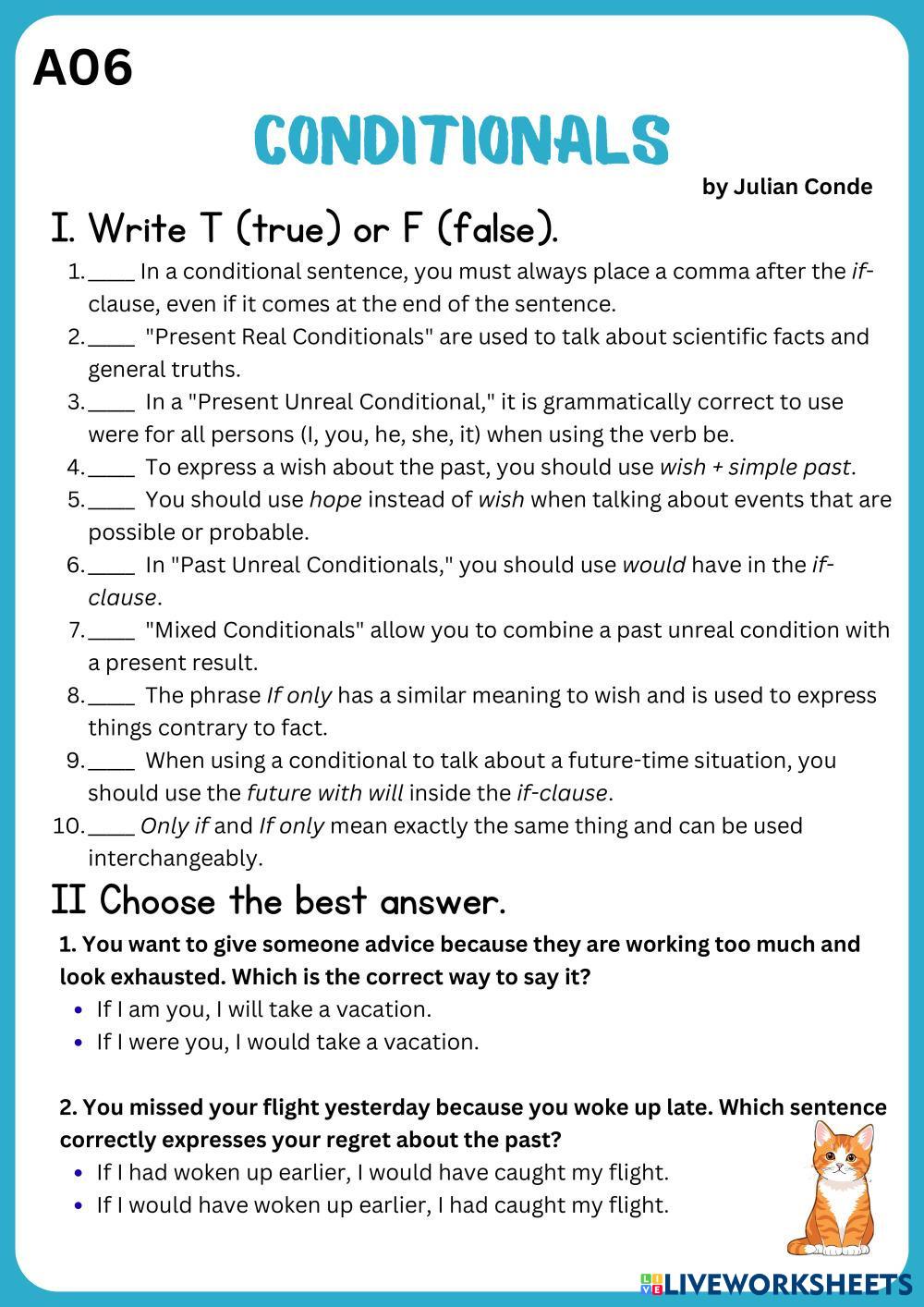 Created byJulián Ysaias Conde Borjas ESL English A1 Grammar English Author's Instructions . My Google Classroom Courses × 0 classes selected (0 students total) Quick Access Select all classes (0 classes) All Classes Loading courses... Cancel Share Share to selected Course __COURSE_NAME__ __STUDENT_NAME__ (__STUDENT_EMAIL__) A06 Unit 22 Conditionals Download Worksheet Validation Check my answers Emails my answers to my teacher Full name Group/level School subject Teacher's email or key code Close Submit Validating worksheet... (12) Your answers have been sent to your teacher. Good luck! OK We encountered an error submitting your answers. Please try again. OK Advertisement | Go Ad Free Created byJulián Ysaias Conde Borjas ESL English A1 Grammar English Author's Instructions . Explore Worksheets Unit 2 lesson c ESL A1 Unit 2 lesson c Grammar - ESL Classroom Vocabulary. Irregular verbs ESL A1 Irregular verbs Grammar - ESL English as a second language Simple Past & Past Participle forms of Irregular Verbs Main content: Irregular verbs Other contents: Past simple, Present Perfect IRREGULAR VERBS SHAPE IT 2 ESL A1 IRREGULAR VERBS SHAPE IT 2 Grammar - ESL FILL IN THE BLANK BELB 7.2 Present Continuous (positive) ESL A1 BELB 7.2 Present Continuous (positive) Grammar - ESL Complete the worksheet.