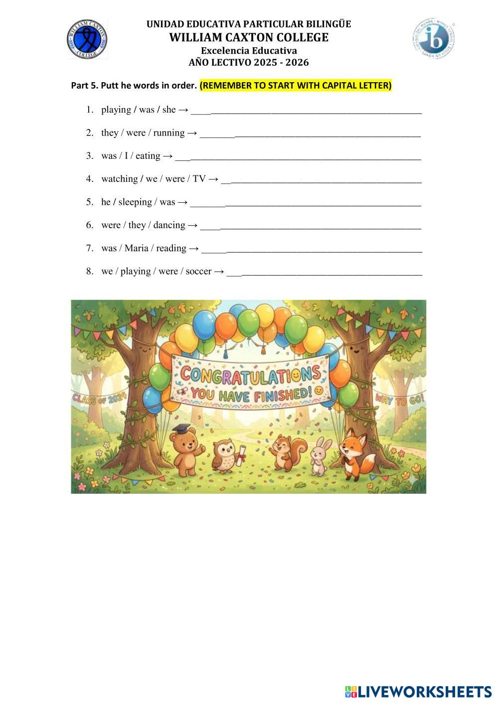 Created by gabiru28 ESL A1 Grammar English Author's Instructions Read very carefuly the instructions and solve the exercises. Remember to start a sentence with capital letter. Remember to use WAS / WERE + VERB + ING My Google Classroom Courses × 0 classes selected (0 students total) Quick Access Select all classes (0 classes) All Classes Loading courses... Cancel Share Share to selected Course __COURSE_NAME__ __STUDENT_NAME__ (__STUDENT_EMAIL__) Past Progressive or Past Continuous Download Worksheet Validation Check my answers Emails my answers to my teacher Full name Group/level School subject Teacher's email or key code Close Submit Validating worksheet... (12) Your answers have been sent to your teacher. Good luck! OK We encountered an error submitting your answers. Please try again. OK Advertisement | Go Ad Free Created by gabiru28 ESL A1 Grammar English Author's Instructions Read very carefuly the instructions and solve the exercises. Remember to start a sentence with capital letter. Remember to use WAS / WERE + VERB + ING Explore Worksheets Test ESL A1 Test Grammar - ESL Lisez et completez par la forme convenable! Unit 2 lesson c ESL A1 Unit 2 lesson c Grammar - ESL Classroom Vocabulary. Irregular verbs ESL A1 Irregular verbs Grammar - ESL English as a second language Simple Past & Past Participle forms of Irregular Verbs Main content: Irregular verbs Other contents: Past simple, Present Perfect A06 Unit 22 Conditionals ESL A1 A06 Unit 22 Conditionals Grammar - ESL .