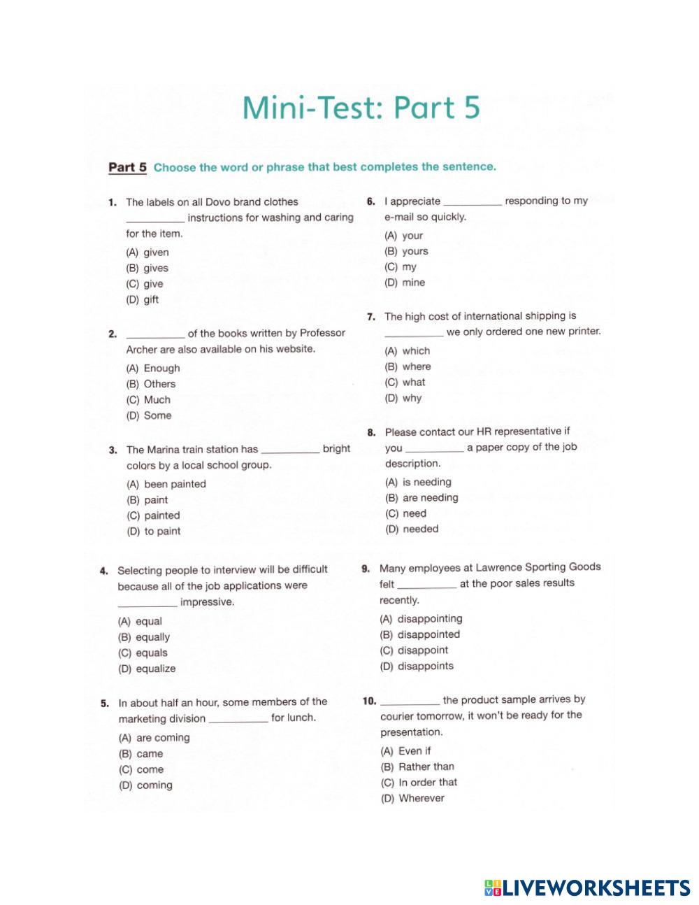 Created byThi Nguyet Nguyen ESL English B1 Grammar English Author's Instructions Choose the correct answer My Google Classroom Courses × 0 classes selected (0 students total) Quick Access Select all classes (0 classes) All Classes Loading courses... Cancel Share Share to selected Course __COURSE_NAME__ __STUDENT_NAME__ (__STUDENT_EMAIL__) Mini Test Part 5 Download Worksheet Validation Check my answers Emails my answers to my teacher Full name Group/level School subject Teacher's email or key code Close Submit Validating worksheet... (12) Your answers have been sent to your teacher. Good luck! OK We encountered an error submitting your answers. Please try again. OK Advertisement | Go Ad Free Created byThi Nguyet Nguyen ESL English B1 Grammar English Author's Instructions Choose the correct answer Explore Worksheets Present Perfect Simple - positive and negative ESL B1 Present Perfect Simple - positive and negative Grammar - ESL English as a second language Worksheet on present perfect simple Main content: Present perfect Other contents: present perfect simple, form, positive, negative Mini Test Part 6 ESL B1 Mini Test Part 6 Grammar - ESL Choose the correct answer Lesson 15 - Complete Sentences ESL B1 Lesson 15 - Complete Sentences Grammar - ESL Choose the correct answer Lesson 15 - Relative Pronouns & Relative Adverbs ESL B1 Lesson 15 - Relative Pronouns & Relative Adverbs Grammar - ESL Choose the correct answer