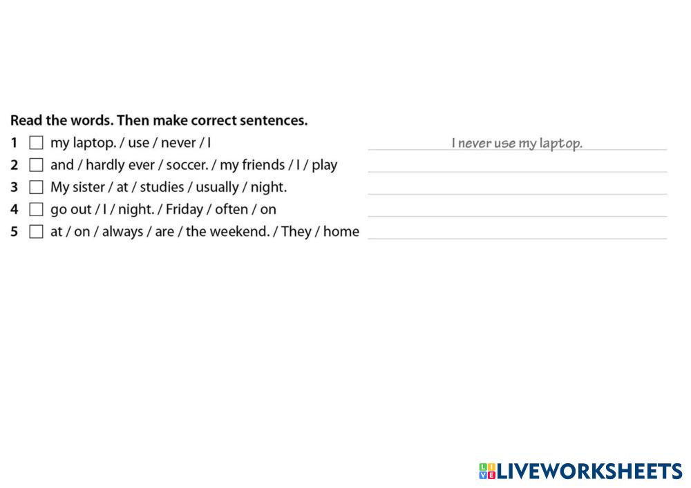 Created byLuisa Gladys Peña Huamán ESL English A1 Grammar English Author's Instructions Read carefully and complete the exercise. My Google Classroom Courses × 0 classes selected (0 students total) Quick Access Select all classes (0 classes) All Classes Loading courses... Cancel Share Share to selected Course __COURSE_NAME__ __STUDENT_NAME__ (__STUDENT_EMAIL__) Exercise 16 Week 6 Download Worksheet Validation Check my answers Emails my answers to my teacher Full name Group/level School subject Teacher's email or key code Close Submit Validating worksheet... (12) Your answers have been sent to your teacher. Good luck! OK We encountered an error submitting your answers. Please try again. OK Advertisement | Go Ad Free Created byLuisa Gladys Peña Huamán ESL English A1 Grammar English Author's Instructions Read carefully and complete the exercise. Explore Worksheets Routine or now ESL A1 Routine or now Grammar - ESL Decide if the sentence describes a routine or an action happening now. Write an SP (simple present) or P (progressive) in front of the sentence ADVERBS OF FREQUENCY BY EFC ESL A1 ADVERBS OF FREQUENCY BY EFC Grammar - ESL READ AND FOLLOW THE INSTRUCTIONS. Present Continuous - Grammar Friends ESL A1 Present Continuous - Grammar Friends Grammar - ESL ... Seasons, weather and clothes ESL A1 Seasons, weather and clothes Grammar - ESL Read each part carefully and solve the exercises