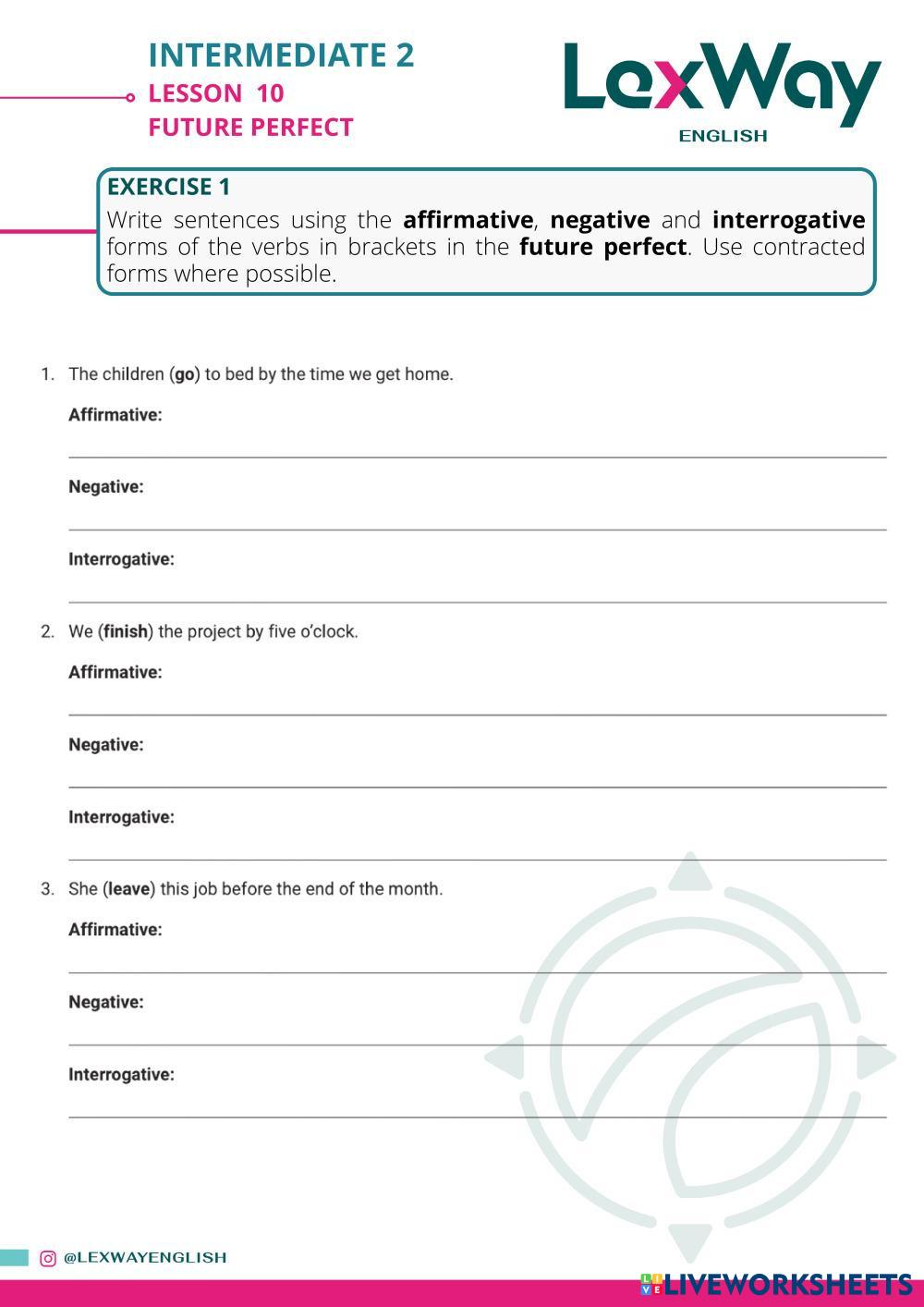 Created byLexWay English ESL English B2 Grammar English Author's Instructions Students will practice the use of Future Perfect My Google Classroom Courses × 0 classes selected (0 students total) Quick Access Select all classes (0 classes) All Classes Loading courses... Cancel Share Share to selected Course __COURSE_NAME__ __STUDENT_NAME__ (__STUDENT_EMAIL__) I2 - Lesson 10 - Future Perfect Download Worksheet Validation Check my answers Emails my answers to my teacher Full name Group/level School subject Teacher's email or key code Close Submit Validating worksheet... (12) Your answers have been sent to your teacher. Good luck! OK We encountered an error submitting your answers. Please try again. OK Advertisement | Go Ad Free Created byLexWay English ESL English B2 Grammar English Author's Instructions Students will practice the use of Future Perfect Explore Worksheets preposition practice: to, in, of, for, at ESL B2 preposition practice: to, in, of, for, at Grammar - ESL fill out the gaps High Note 4, Unit 6a, Modal verbs ESL B2 High Note 4, Unit 6a, Modal verbs Grammar - ESL Unit 6a, modal verbs Verb Patterns 2 Gerund Infinitives with Objects ESL B2 Verb Patterns 2 Gerund Infinitives with Objects Grammar - ESL Task one: Cloze exercise Task Two: Sentence transformations Verb Patterns 1 Gerunds and Infinitives 2 Tasks ESL B2 Verb Patterns 1 Gerunds and Infinitives 2 Tasks Grammar - ESL Task one - read and choose the gerund or the infinitve Task two - Sentence transformations