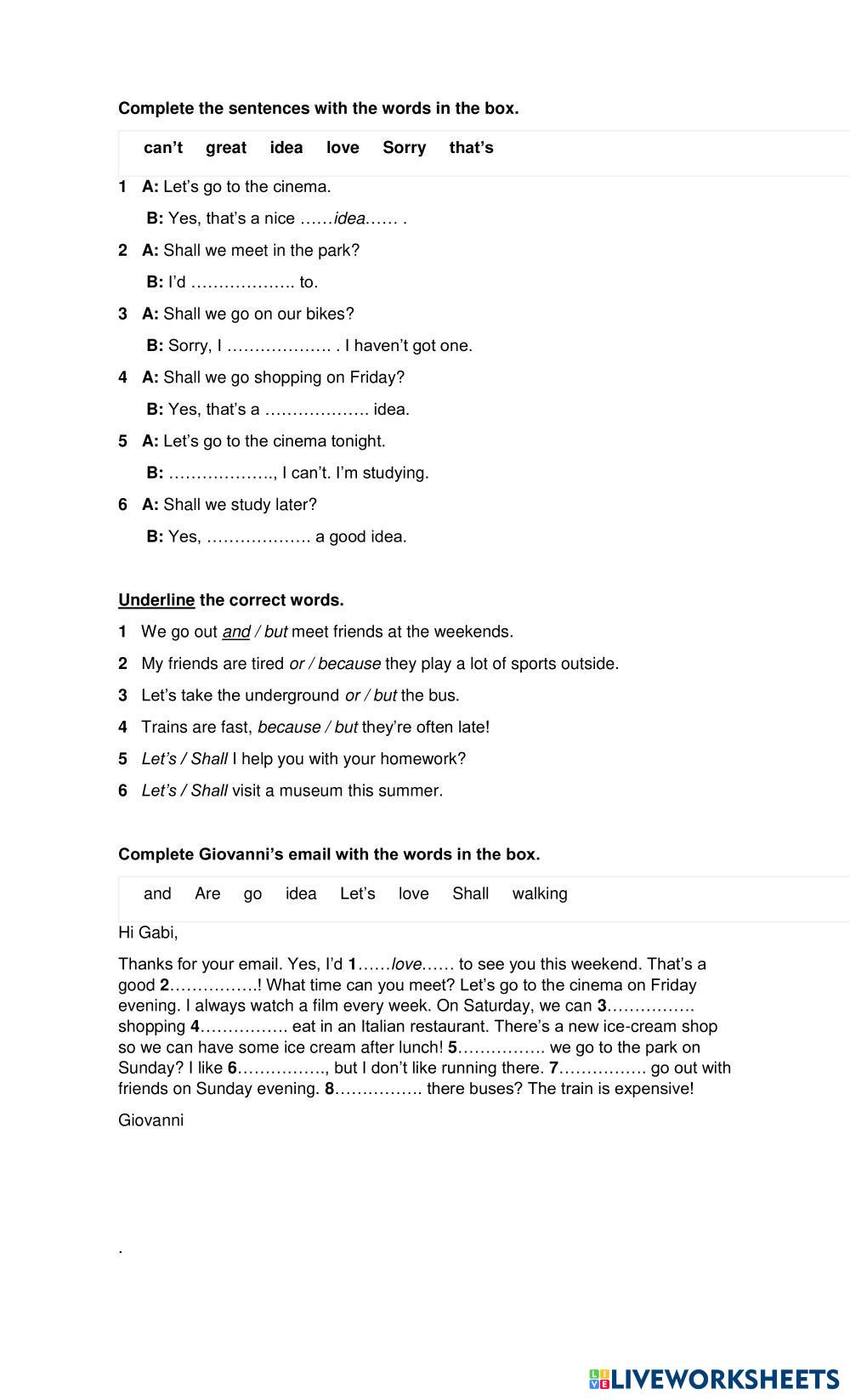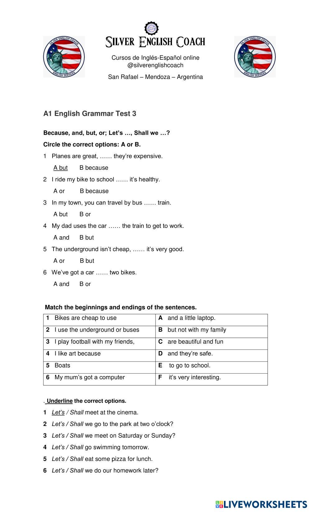 Created bySilver English Coach ESL English A1 Grammar English Author's Instructions Complete the following test My Google Classroom Courses × 0 classes selected (0 students total) Quick Access Select all classes (0 classes) All Classes Loading courses... Cancel Share Share to selected Course __COURSE_NAME__ __STUDENT_NAME__ (__STUDENT_EMAIL__) A1 Grammar test N° 3 - because,but,and,etc Download Worksheet Validation Check my answers Emails my answers to my teacher Full name Group/level School subject Teacher's email or key code Close Submit Validating worksheet... (12) Your answers have been sent to your teacher. Good luck! OK We encountered an error submitting your answers. Please try again. OK Advertisement | Go Ad Free Created bySilver English Coach ESL English A1 Grammar English Author's Instructions Complete the following test Explore Worksheets Was or were ESL A1 Was or were Grammar - ESL English as a second language positive, negative, questions Main content: Past simple Other contents: verb to be WHO OR WHAT ESL A1 WHO OR WHAT Grammar - ESL FOLLOW INSTRUCTIONS QUESTION WORDS ESL A1 QUESTION WORDS Grammar - ESL FOLLOW INSTRUCTIONS Vocabulary: Adjectives | Grammar: There be (affirmative/Negative) ESL A1 Vocabulary: Adjectives | Grammar: There be (affirmative/Negative) Grammar - ESL 1. Match (Connect) 2. Complete the sentences using There Be