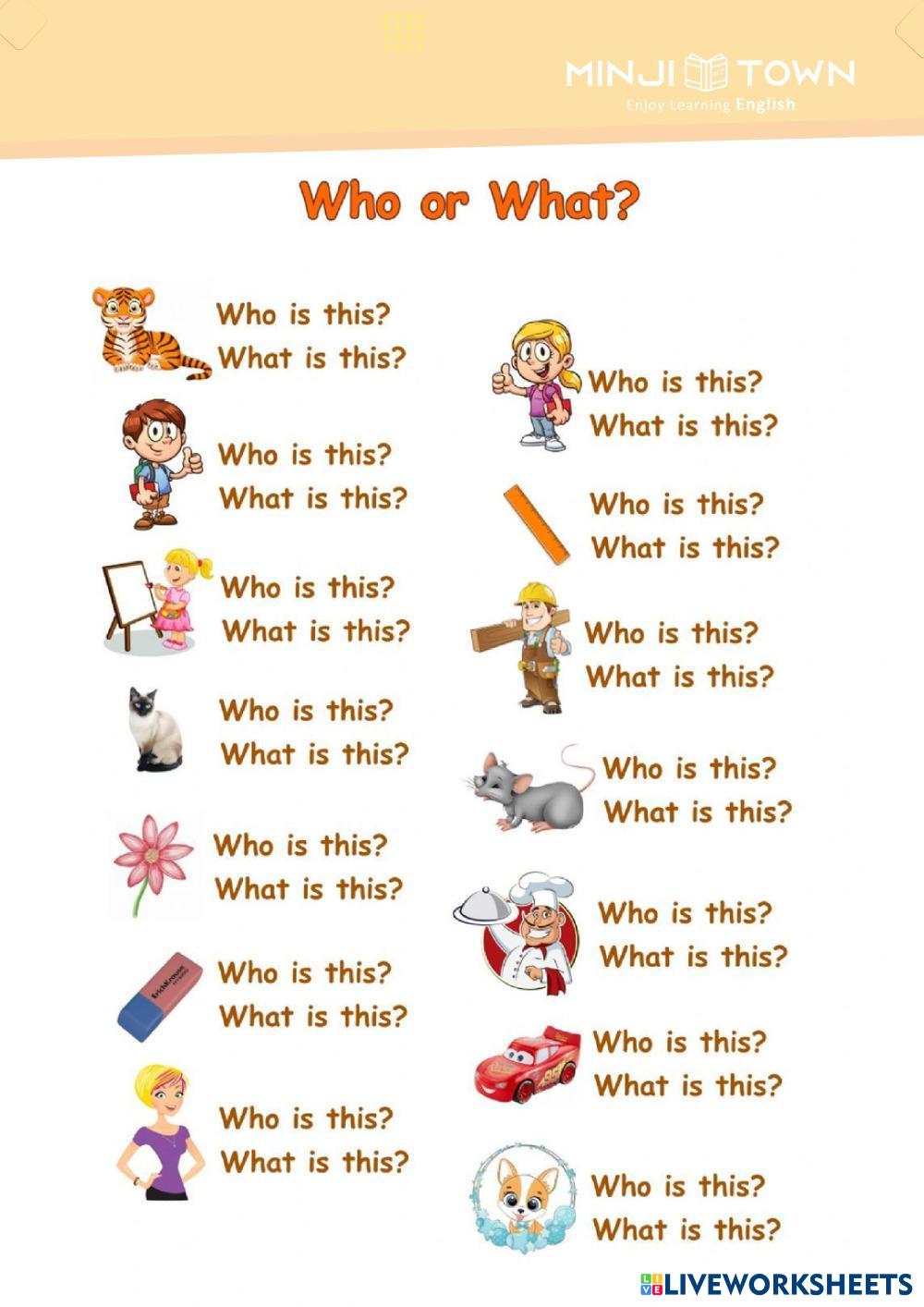 Created byJennifer Ibarra ESL English A1 Grammar English Author's Instructions FOLLOW INSTRUCTIONS My Google Classroom Courses × 0 classes selected (0 students total) Quick Access Select all classes (0 classes) All Classes Loading courses... Cancel Share Share to selected Course __COURSE_NAME__ __STUDENT_NAME__ (__STUDENT_EMAIL__) WHO OR WHAT Download Worksheet Validation Check my answers Emails my answers to my teacher Full name Group/level School subject Teacher's email or key code Close Submit Validating worksheet... (12) Your answers have been sent to your teacher. Good luck! OK We encountered an error submitting your answers. Please try again. OK Advertisement | Go Ad Free Created byJennifer Ibarra ESL English A1 Grammar English Author's Instructions FOLLOW INSTRUCTIONS Explore Worksheets Was or were ESL A1 Was or were Grammar - ESL English as a second language positive, negative, questions Main content: Past simple Other contents: verb to be A1 Grammar test N° 3 - because,but,and,etc ESL A1 A1 Grammar test N° 3 - because,but,and,etc Grammar - ESL Complete the following test QUESTION WORDS ESL A1 QUESTION WORDS Grammar - ESL FOLLOW INSTRUCTIONS Vocabulary: Adjectives | Grammar: There be (affirmative/Negative) ESL A1 Vocabulary: Adjectives | Grammar: There be (affirmative/Negative) Grammar - ESL 1. Match (Connect) 2. Complete the sentences using There Be
