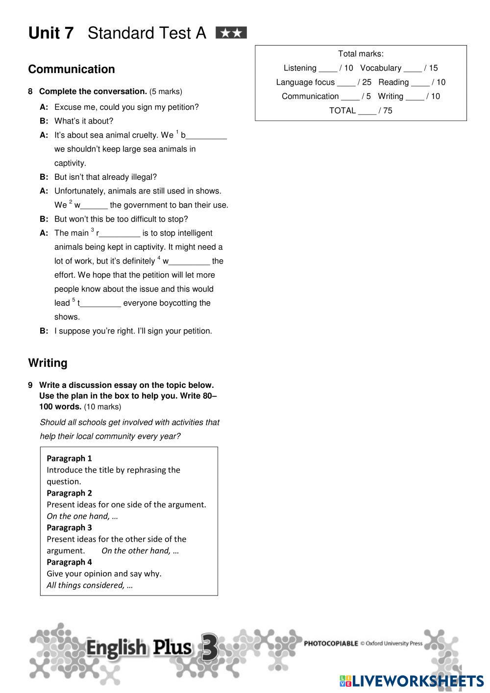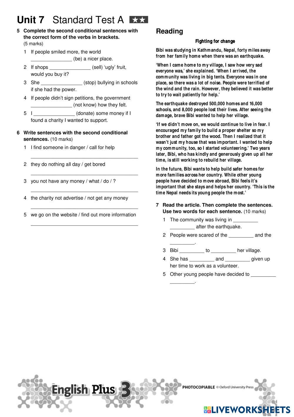 Created by michilzhirkov ESL English B1 Grammar English Author's Instructions Take the test on Unit 7 My Google Classroom Courses × 0 classes selected (0 students total) Quick Access Select all classes (0 classes) All Classes Loading courses... Cancel Share Share to selected Course __COURSE_NAME__ __STUDENT_NAME__ (__STUDENT_EMAIL__) Unit 7 Test Assessment Download Worksheet Validation Check my answers Emails my answers to my teacher Full name Group/level School subject Teacher's email or key code Close Submit Validating worksheet... (12) Your answers have been sent to your teacher. Good luck! OK We encountered an error submitting your answers. Please try again. OK Advertisement | Go Ad Free Created by michilzhirkov ESL English B1 Grammar English Author's Instructions Take the test on Unit 7 Explore Worksheets Bigger! Stronger! Faster! ESL B1 Bigger! Stronger! Faster! Grammar - ESL Do the tasks What's the matter? ESL B1 What's the matter? Grammar - ESL Do the tasks Past Simple vs Present Perfect ESL B1 Past Simple vs Present Perfect Grammar - ESL English as a second language by anmafan Main content: Present perfect or past simple Present Perfect with Environment Vocabulary ESL B1 Present Perfect with Environment Vocabulary Grammar - ESL This B1-level ESL worksheet helps your students practice their knowledge of the Present Perfect while learning English vocabulary about the environment.