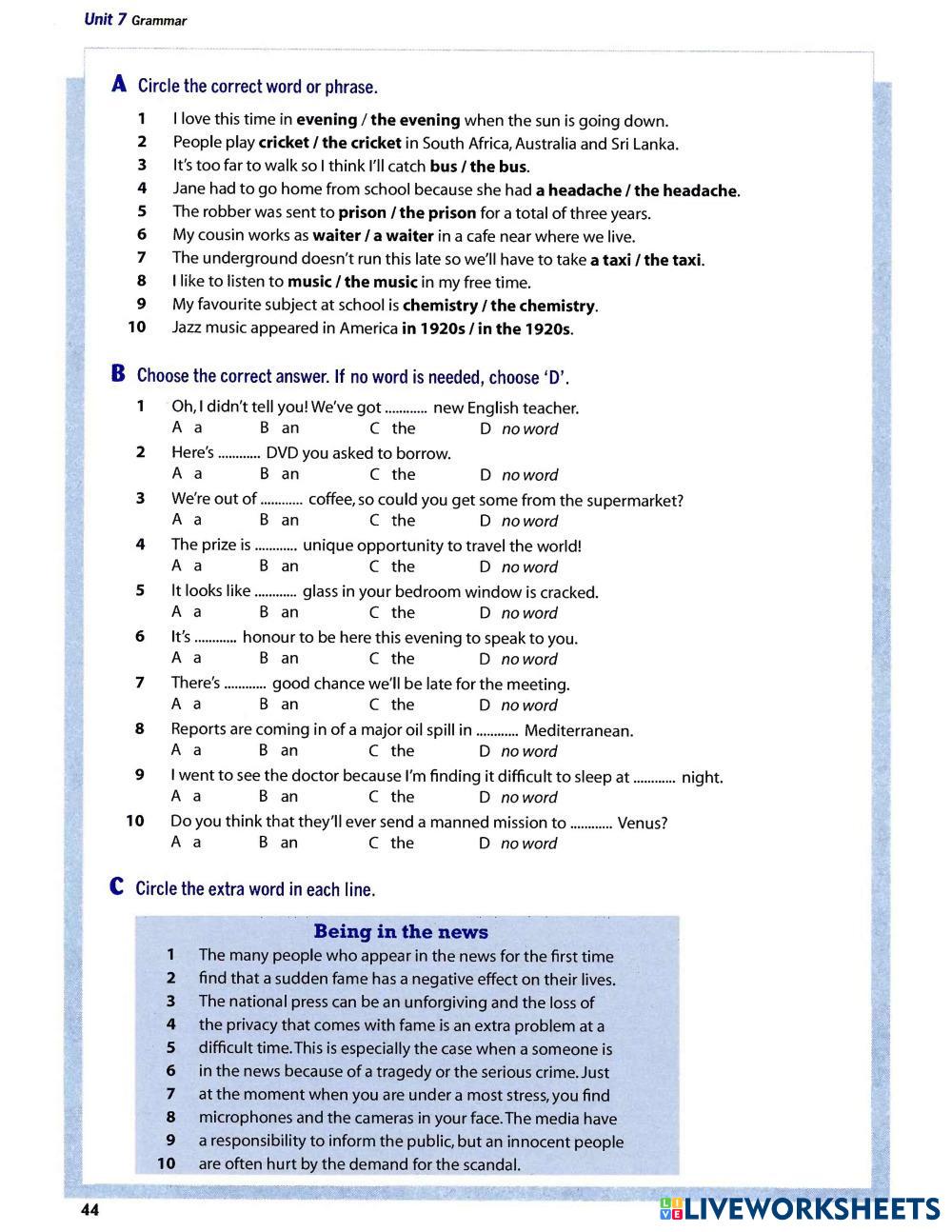 Created byNguyễn Thị Mai Thục ESL English B2 Grammar English Author's Instructions Des B2. U7. Articles, Countable and Uncountable Nouns, and Quantifiers (P1) My Google Classroom Courses × 0 classes selected (0 students total) Quick Access Select all classes (0 classes) All Classes Loading courses... Cancel Share Share to selected Course __COURSE_NAME__ __STUDENT_NAME__ (__STUDENT_EMAIL__) Des B2. U7. Articles, Countable and Uncountable Nouns, and Quantifiers (P1) Download Worksheet Validation Check my answers Emails my answers to my teacher Full name Group/level School subject Teacher's email or key code Close Submit Validating worksheet... (12) Your answers have been sent to your teacher. Good luck! OK We encountered an error submitting your answers. Please try again. OK Advertisement | Go Ad Free Created byNguyễn Thị Mai Thục ESL English B2 Grammar English Author's Instructions Des B2. U7. Articles, Countable and Uncountable Nouns, and Quantifiers (P1) Explore Worksheets Des B2. U9. Conditional sentences (P1) ESL B2 Des B2. U9. Conditional sentences (P1) Grammar - ESL Des B2. U9. Conditional sentences (P1) Should or Shouldn't? - Environment Vocabulary ESL B2 Should or Shouldn't? - Environment Vocabulary Grammar - ESL In this B2-level ESL worksheet, your students must complete the sentences using "should" or "shouldn't" in the context of environmental protection. Des B2. U7. Articles, Countable and Uncountable Nouns, and Quantifiers (P2) ESL B2 Des B2. U7. Articles, Countable and Uncountable Nouns, and Quantifiers (P2) Grammar - ESL Des B2. U7. Articles, Countable and Uncountable Nouns, and Quantifiers (P2) Des B2. U5. Future time or present tenses in time clauses or prepositions of time and place (P1) ESL B2 Des B2. U5. Future time or present tenses in time clauses or prepositions of time and place (P1) Grammar - ESL Des B2. U5. Future time or present tenses in time clauses or prepositions of time and place (P1)