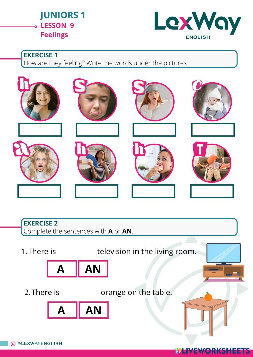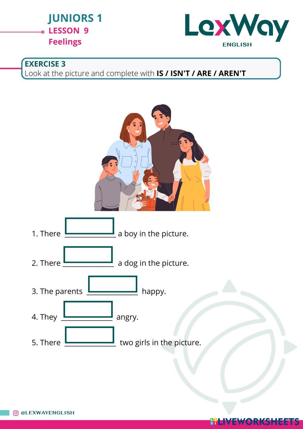 Created byLexWay English ESL English A1 Grammar English Author's Instructions Students will practice the vocabulary of feelings and its grammar. My Google Classroom Courses × 0 classes selected (0 students total) Quick Access Select all classes (0 classes) All Classes Loading courses... Cancel Share Share to selected Course __COURSE_NAME__ __STUDENT_NAME__ (__STUDENT_EMAIL__) JR1 - Lesson 09 - Feelings Download Worksheet Validation Check my answers Emails my answers to my teacher Full name Group/level School subject Teacher's email or key code Close Submit Validating worksheet... (12) Your answers have been sent to your teacher. Good luck! OK We encountered an error submitting your answers. Please try again. OK Advertisement | Go Ad Free Created byLexWay English ESL English A1 Grammar English Author's Instructions Students will practice the vocabulary of feelings and its grammar. Explore Worksheets B2 - Lesson 14 - Quantifiers & Containers ESL A1 B2 - Lesson 14 - Quantifiers & Containers Grammar - ESL Quantifiers (a lot of, much, many, a few, a little) Vocabulary (food containers) Irregular verbs ESL A1 Irregular verbs Grammar - ESL English as a second language Simple Past & Past Participle forms of Irregular Verbs Main content: Irregular verbs Other contents: Past simple, Present Perfect Was or were ESL A1 Was or were Grammar - ESL English as a second language positive, negative, questions Main content: Past simple Other contents: verb to be JR1 - Lesson 10 - Feelings 2 ESL A1 JR1 - Lesson 10 - Feelings 2 Grammar - ESL Students will revise feelings vocabulary and verb to be.