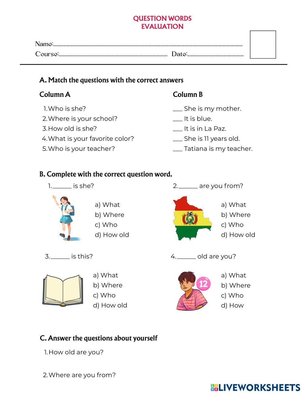 Created by tatianaquentachambi ESL Simple English A1 Grammar English Author's Instructions READ THE INTRUCTIONS My Google Classroom Courses × 0 classes selected (0 students total) Quick Access Select all classes (0 classes) All Classes Loading courses... Cancel Share Share to selected Course __COURSE_NAME__ __STUDENT_NAME__ (__STUDENT_EMAIL__) QUESTION WORDS 1F Download Worksheet Validation Check my answers Emails my answers to my teacher Full name Group/level School subject Teacher's email or key code Close Submit Validating worksheet... (12) Your answers have been sent to your teacher. Good luck! OK We encountered an error submitting your answers. Please try again. OK Advertisement | Go Ad Free Created by tatianaquentachambi ESL Simple English A1 Grammar English Author's Instructions READ THE INTRUCTIONS Explore Worksheets Cover unit 7 ESL A1 Cover unit 7 Grammar - ESL Unit 7 i have got/ i haven't got (pets) ESL A1 i have got/ i haven't got (pets) Grammar - ESL Escribe oraciones con have got y haven't got, a la vez que repasamos el vocabulario Classroom rules ESL A1 Classroom rules Grammar - ESL Read the classroom rules and choose must or mustn't Level 6 Quiz ESL A1 Level 6 Quiz Grammar - ESL Setelah mempelajari Bab 5, M mari bersenang-senang mengerjakan soal-soal berikut!