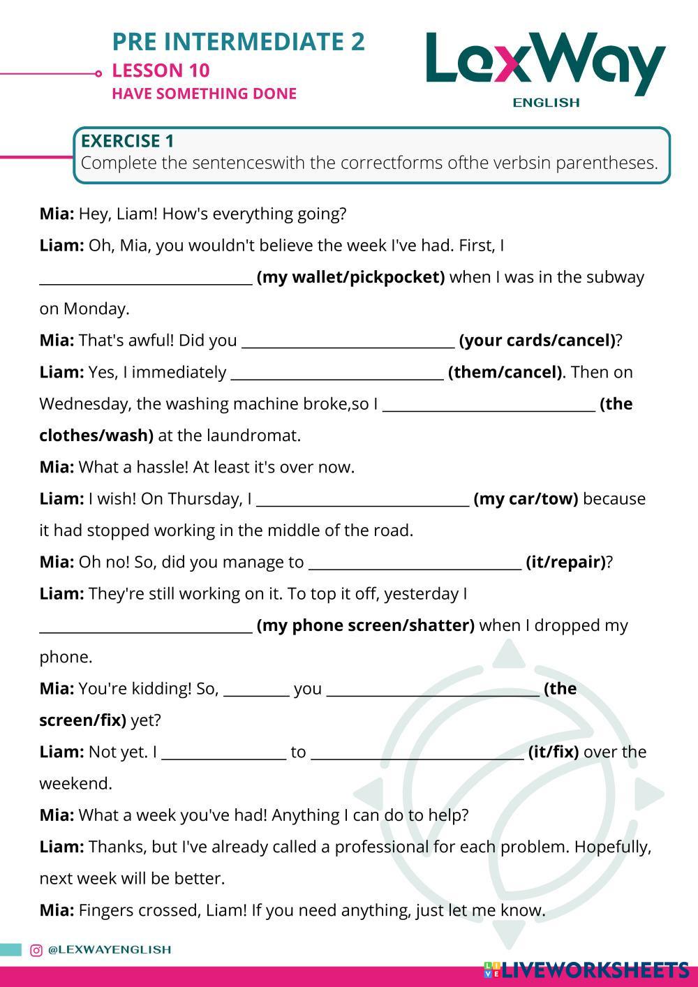 Created byLexWay English ESL English B1 Grammar English Author's Instructions Students will practice the use of the causative (have something done) My Google Classroom Courses × 0 classes selected (0 students total) Quick Access Select all classes (0 classes) All Classes Loading courses... Cancel Share Share to selected Course __COURSE_NAME__ __STUDENT_NAME__ (__STUDENT_EMAIL__) PI2 - Lesson 10 - Have Something Done Download Worksheet Validation Check my answers Emails my answers to my teacher Full name Group/level School subject Teacher's email or key code Close Submit Validating worksheet... (12) Your answers have been sent to your teacher. Good luck! OK We encountered an error submitting your answers. Please try again. OK Advertisement | Go Ad Free Created byLexWay English ESL English B1 Grammar English Author's Instructions Students will practice the use of the causative (have something done) Explore Worksheets Present simple vs present continuous ESL B1 Present simple vs present continuous Grammar - ESL English as a second language Present simple vs continuous grammar exercises Main content: Present simple and present continuous Defining & Non-defining ESL B1 Defining & Non-defining Grammar - ESL . Past Simple vs Present Perfect ESL B1 Past Simple vs Present Perfect Grammar - ESL English as a second language by anmafan Main content: Present perfect or past simple Present Perfect Simple - positive and negative ESL B1 Present Perfect Simple - positive and negative Grammar - ESL English as a second language Worksheet on present perfect simple Main content: Present perfect Other contents: present perfect simple, form, positive, negative