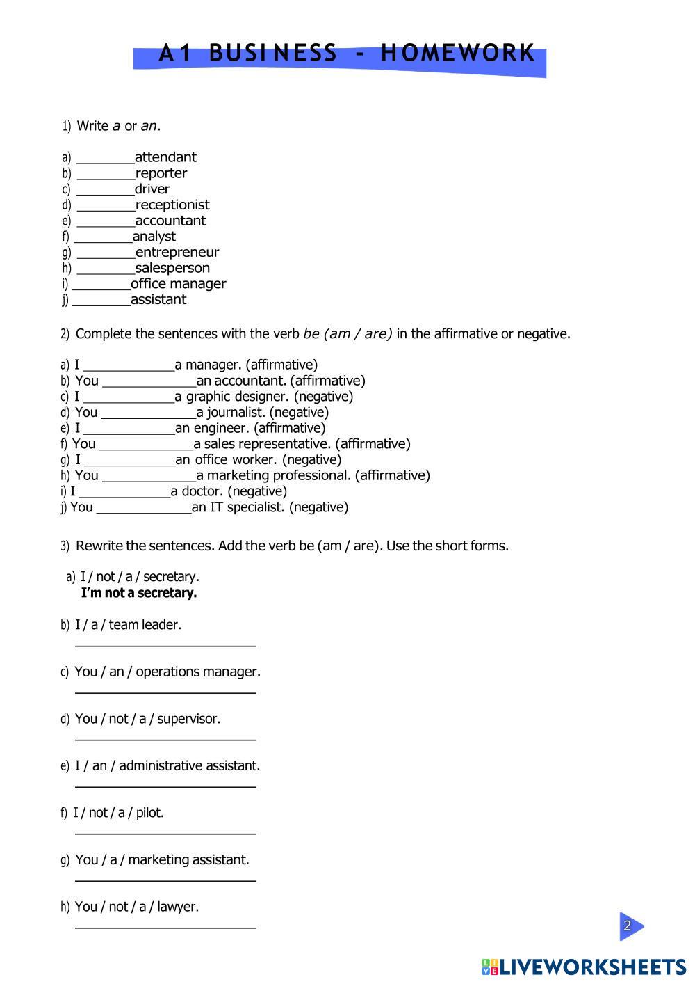 Created by Hosana ESL English A1 Grammar English Author's Instructions hOMEWORK My Google Classroom Courses × 0 classes selected (0 students total) Quick Access Select all classes (0 classes) All Classes Loading courses... Cancel Share Share to selected Course __COURSE_NAME__ __STUDENT_NAME__ (__STUDENT_EMAIL__) 1 - HW What´s your job Download Worksheet Validation Check my answers Emails my answers to my teacher Full name Group/level School subject Teacher's email or key code Close Submit Validating worksheet... (12) Your answers have been sent to your teacher. Good luck! OK We encountered an error submitting your answers. Please try again. OK Advertisement | Go Ad Free Created by Hosana ESL English A1 Grammar English Author's Instructions hOMEWORK Explore Worksheets BS5-11B ESL A1 BS5-11B Grammar - ESL Complete the sentences with past simple. Irregular verbs ESL A1 Irregular verbs Grammar - ESL English as a second language Simple Past & Past Participle forms of Irregular Verbs Main content: Irregular verbs Other contents: Past simple, Present Perfect COURSEBOOK UNIT 6 ESL A1 COURSEBOOK UNIT 6 Grammar - ESL Coursebook Unit 6 Was or were ESL A1 Was or were Grammar - ESL English as a second language positive, negative, questions Main content: Past simple Other contents: verb to be