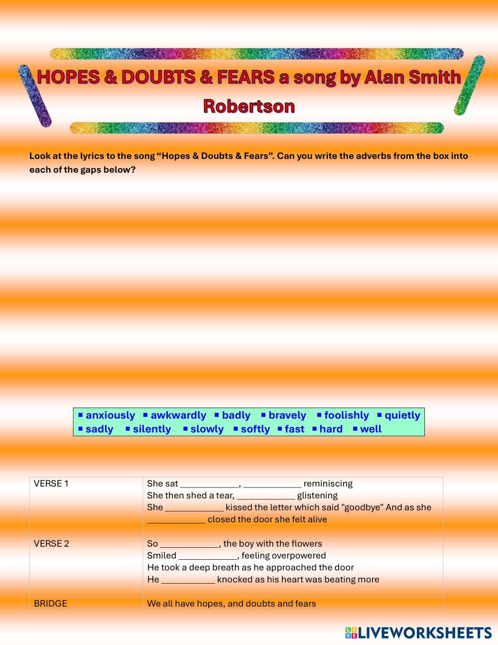Look at the lyrics to the song “Hopes & Doubts & Fears”. Can you write the adverbs from the box into each of the gaps below?