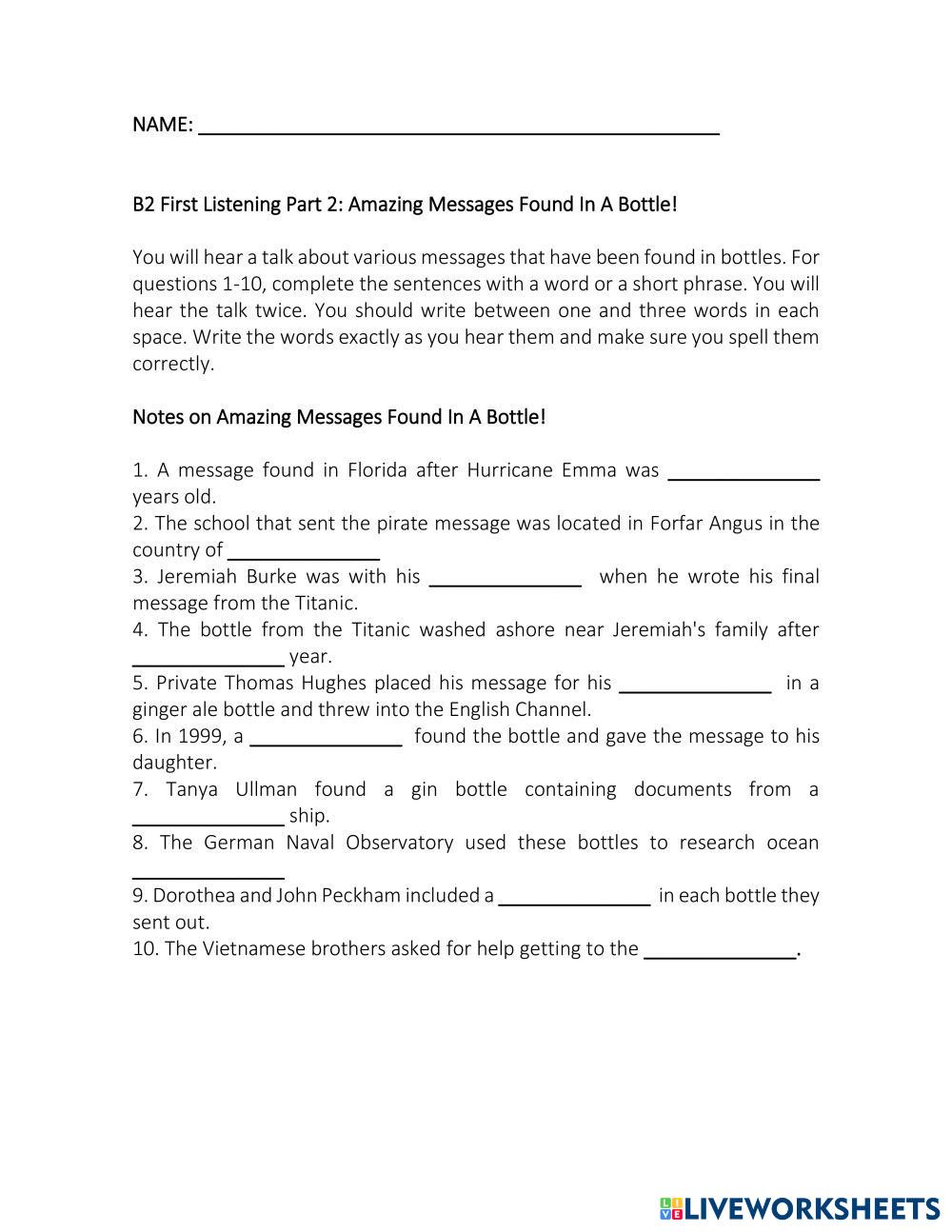 Created by jxy83 ESL Spanish B1-Intermediate Listening English Author's Instructions Listen and answer. My Google Classroom Courses × 0 classes selected (0 students total) Quick Access Select all classes (0 classes) All Classes Loading courses... Cancel Share Share to selected Course __COURSE_NAME__ __STUDENT_NAME__ (__STUDENT_EMAIL__) Listening Part 2 Messages in a bottle Download Worksheet Validation Check my answers Emails my answers to my teacher Full name Group/level School subject Teacher's email or key code Close Submit Validating worksheet... (12) Your answers have been sent to your teacher. Good luck! OK We encountered an error submitting your answers. Please try again. OK Advertisement | Go Ad Free Created by jxy83 ESL Spanish B1-Intermediate Listening English Author's Instructions Listen and answer. Explore Worksheets 2nd Term Listening Exam ESL B1-Intermediate 2nd Term Listening Exam Listening - ESL Listen and answer. FCE Listening Part 2: Responsible Shopping ESL B1-Intermediate FCE Listening Part 2: Responsible Shopping Listening - ESL Listen and answer. escritura ESL B1-Intermediate escritura Listening - ESL Lee y responde C9 U9 - Fill in the blanks - listening comprehension ESL B1-Intermediate C9 U9 - Fill in the blanks - listening comprehension Listening - ESL Listen to the audio and fill in the blanks.