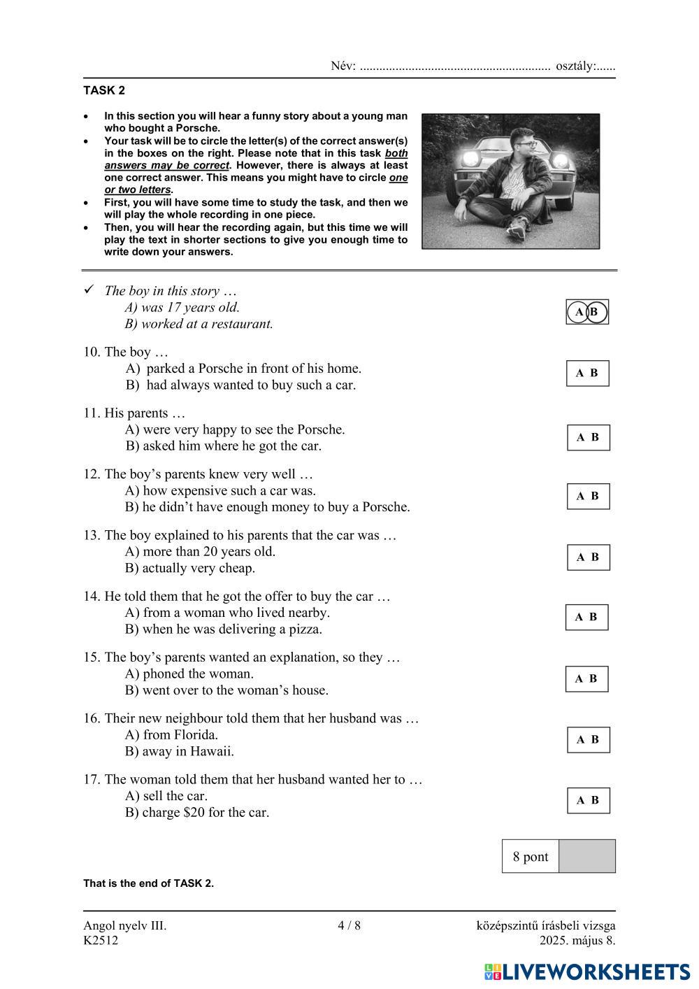Created by Angol24_7 ESL Hungarian B1-Intermediate Listening English Author's Instructions Listening My Google Classroom Courses × 0 classes selected (0 students total) Quick Access Select all classes (0 classes) All Classes Loading courses... Cancel Share Share to selected Course __COURSE_NAME__ __STUDENT_NAME__ (__STUDENT_EMAIL__) KÖZÉP - 2025. május - task 2 Download Worksheet Validation Check my answers Emails my answers to my teacher Full name Group/level School subject Teacher's email or key code Close Submit Validating worksheet... (12) Your answers have been sent to your teacher. Good luck! OK We encountered an error submitting your answers. Please try again. OK Advertisement | Go Ad Free Created by Angol24_7 ESL Hungarian B1-Intermediate Listening English Author's Instructions Listening Explore Worksheets KÖZÉP - 2025. október ESL B1-Intermediate KÖZÉP - 2025. október Listening - ESL listening KÖZÉP - 2025. október ESL B1-Intermediate KÖZÉP - 2025. október Listening - ESL listening KÖZÉP - 2025 október - listening ESL B1-Intermediate KÖZÉP - 2025 október - listening Listening - ESL listening KÖZÉP - 2025. május - task 3 ESL B1-Intermediate KÖZÉP - 2025. május - task 3 Listening - ESL Listening