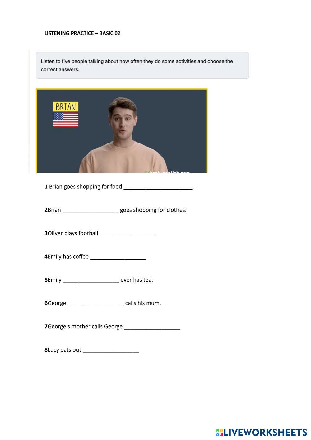 Created by MissGloriaP ESL English A1 Listening English Author's Instructions LISTENG TO THE AUDIO IN CLASS AND ANSWER THE QUESTIONS My Google Classroom Courses × 0 classes selected (0 students total) Quick Access Select all classes (0 classes) All Classes Loading courses... Cancel Share Share to selected Course __COURSE_NAME__ __STUDENT_NAME__ (__STUDENT_EMAIL__) LISTENING BASIC 02 Download Worksheet Validation Check my answers Emails my answers to my teacher Full name Group/level School subject Teacher's email or key code Close Submit Validating worksheet... (12) Your answers have been sent to your teacher. Good luck! OK We encountered an error submitting your answers. Please try again. OK Advertisement | Go Ad Free Created by MissGloriaP ESL English A1 Listening English Author's Instructions LISTENG TO THE AUDIO IN CLASS AND ANSWER THE QUESTIONS Explore Worksheets Fracciones - unir con flechas ESL A1 Fracciones - unir con flechas Listening - ESL Ejercicio de unir con flechas para practicar las fracciones, su representación y su lectura. Para niños y niñas de 3º o 4º de primaria. Verb to be ESL A1 Verb to be Listening - ESL A worksheet to practise the verb to BE in the present simple tense. This worksheet is copyrighted by Alenka, published with permission. Thanks a lot!! Greetings Rodrigo LST ESL A1 Greetings Rodrigo LST Listening - ESL Listen and check. Fun for starter unit 8 clothes listening ESL A1 Fun for starter unit 8 clothes listening Listening - ESL Listen and tick