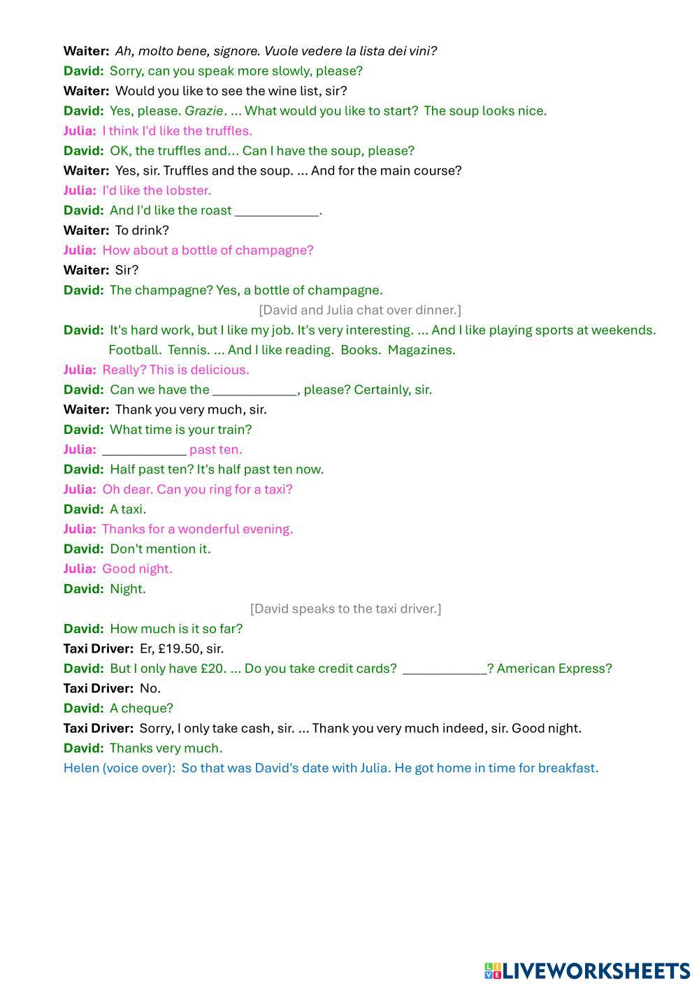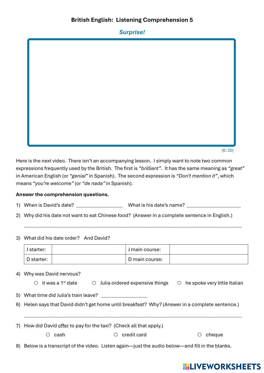 Created by Cadmus ESL English, British B2 Listening English Author's Instructions Students watch a video and answer questions. My Google Classroom Courses × 0 classes selected (0 students total) Quick Access Select all classes (0 classes) All Classes Loading courses... Cancel Share Share to selected Course __COURSE_NAME__ __STUDENT_NAME__ (__STUDENT_EMAIL__) British English: Listening Comprehension 5 Download Worksheet Validation Check my answers Emails my answers to my teacher Full name Group/level School subject Teacher's email or key code Close Submit Validating worksheet... (12) Your answers have been sent to your teacher. Good luck! OK We encountered an error submitting your answers. Please try again. OK Advertisement | Go Ad Free Created by Cadmus ESL English, British B2 Listening English Author's Instructions Students watch a video and answer questions. Explore Worksheets British English: Listening Comprehension 4 ESL B2 British English: Listening Comprehension 4 Listening - ESL Students watch a short video and answer questions. SONG ESL B2 SONG Listening - ESL AONG Moment of Surrender - U2 ESL B2 Moment of Surrender - U2 Listening - ESL Listen to the song and do the activities. Then reflect on it and discuss its themes. B2 Listening Unit 5 ESL B2 B2 Listening Unit 5 Listening - ESL Write on the answer sheet