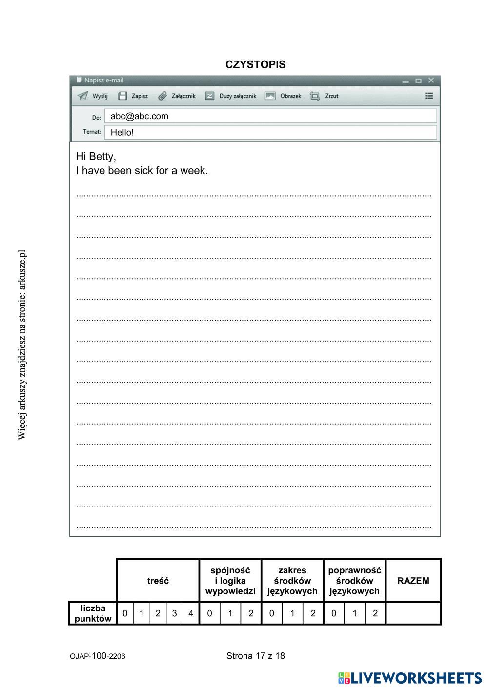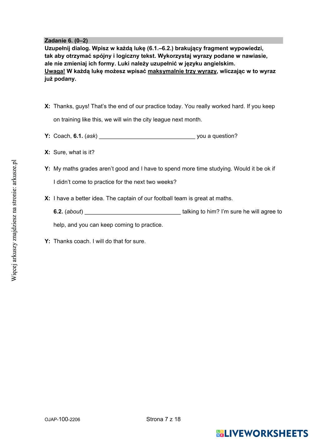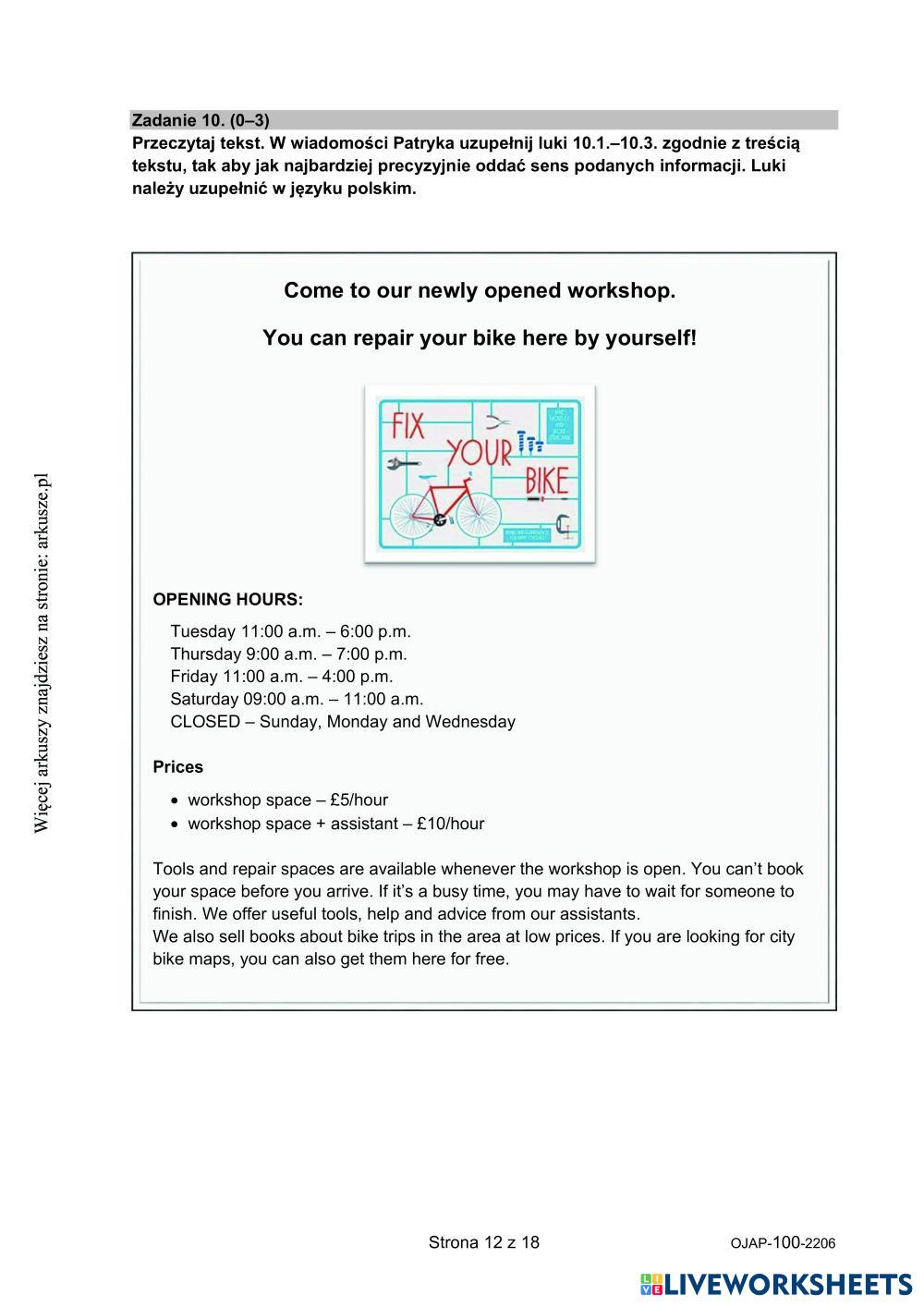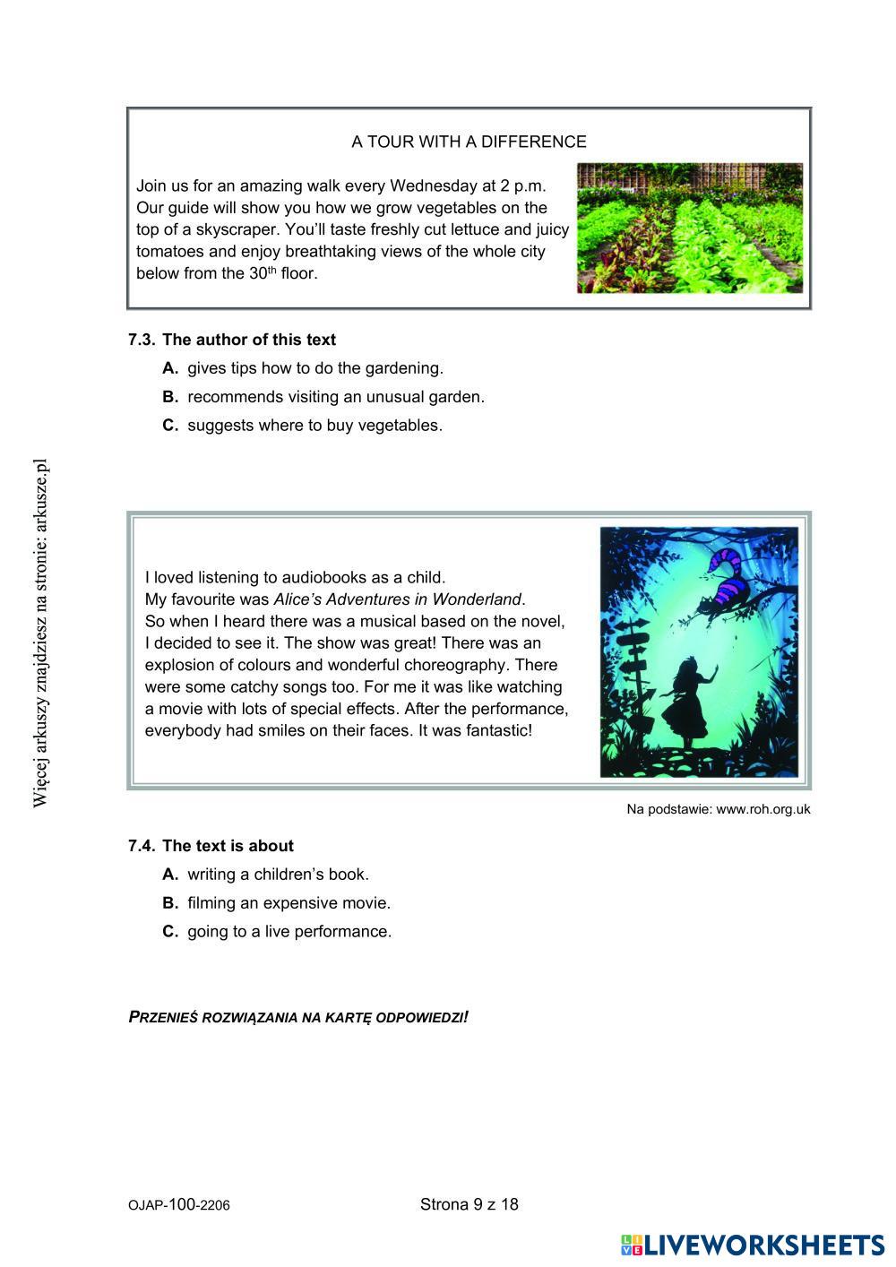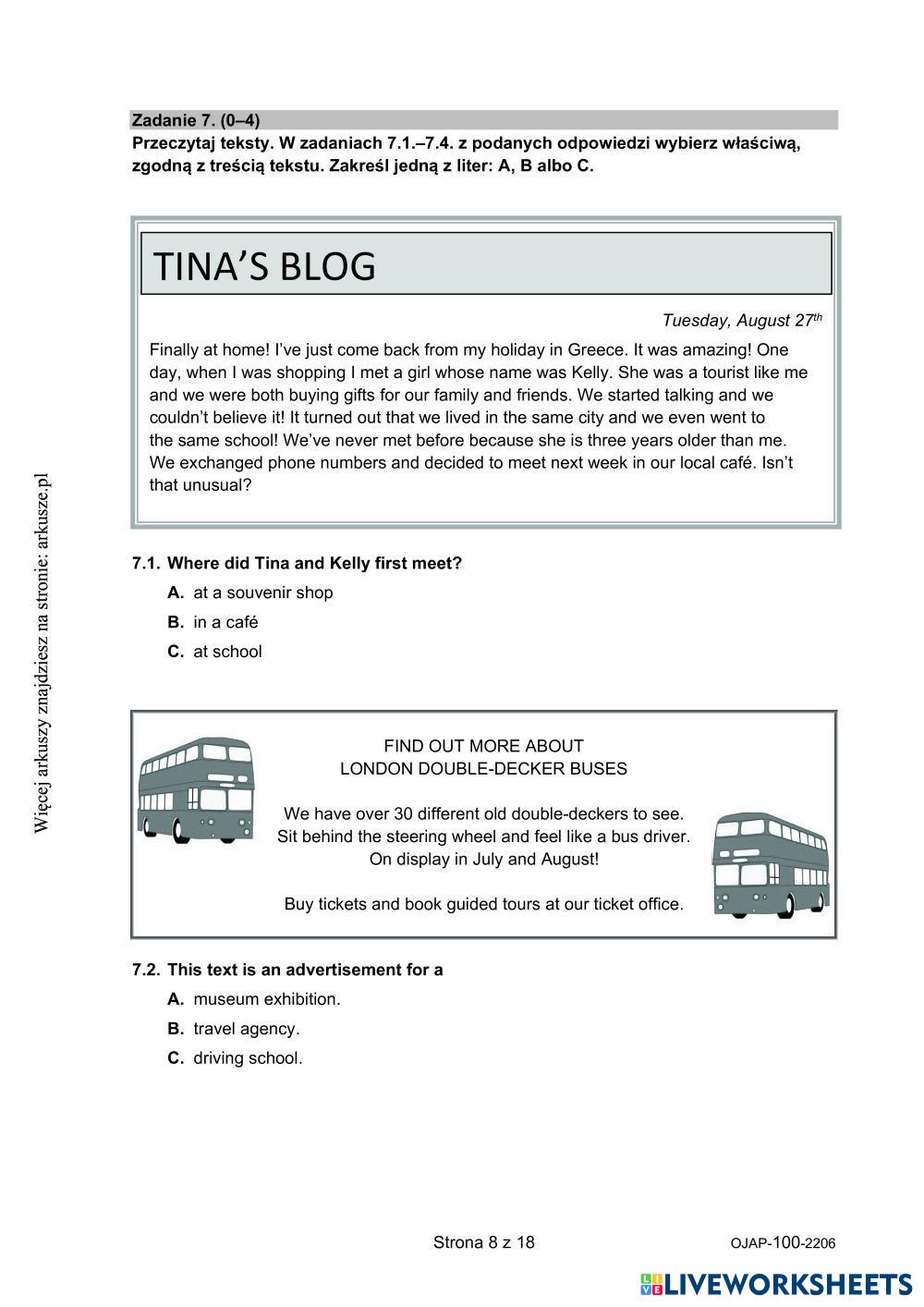 Created byPatrycja Perlik ESL English A2 Listening English Author's Instructions Follow the instructions in the file. My Google Classroom Courses × 0 classes selected (0 students total) Quick Access Select all classes (0 classes) All Classes Loading courses... Cancel Share Share to selected Course __COURSE_NAME__ __STUDENT_NAME__ (__STUDENT_EMAIL__) Egzamin czerwiec 2022 Download Worksheet Validation Check my answers Emails my answers to my teacher Full name Group/level School subject Teacher's email or key code Close Submit Validating worksheet... (12) Your answers have been sent to your teacher. Good luck! OK We encountered an error submitting your answers. Please try again. OK Advertisement | Go Ad Free Created byPatrycja Perlik ESL English A2 Listening English Author's Instructions Follow the instructions in the file. Explore Worksheets ENGLISH DIAGNOSTIC TEST LEVEL 4 ACB SCHOOL ESL A2 ENGLISH DIAGNOSTIC TEST LEVEL 4 ACB SCHOOL Listening - ESL Estimado(a) estudiante: Lee atentamente las siguientes indicaciones antes de comenzar el examen: Este examen tiene como propósito conocer tu nivel actual de inglés al inicio del año escolar. No te preocupes si no sabes todas las respuestas; lo importante es que intentes resolver cada actividad. La evaluación mide tres competencias del área de inglés: Lee diversos tipos de textos en inglés. Escribe diversos tipos de textos en inglés. Se comunica oralmente en inglés. Lee con atención cada pregunta o consigna antes de responder. Responde en los espacios indicados. En la parte de lectura, deberás comprender textos cortos y responder preguntas. En la parte de escritura, redactarás oraciones o un texto breve siguiendo las indicaciones. En la parte de comunicación oral, participarás en una breve actividad con el docente o responderás preguntas en inglés. Usa únicamente tu conocimiento. No está permitido copiar ni usar dispositivos electrónicos. Si tienes alguna duda sobre las instrucciones, levanta la mano y consulta al docente. Administra bien tu tiempo para poder responder todas las preguntas. FLYERS LISTENING TEST ESL A2 FLYERS LISTENING TEST Listening - ESL Look at the pictures. Read the instructions carefully. Listen and complete. [DICTATION]CAM 19 - TEST 2 - PART 4 Tardigrades ESL A2 [DICTATION]CAM 19 - TEST 2 - PART 4 Tardigrades Listening - ESL CAM 19 - TEST 2 - PART 4 Tardigrades Dilemmas ESL A2 Dilemmas Listening - ESL Choose True/False