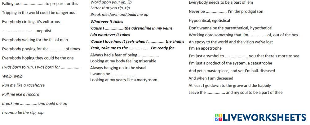 Created byElena Semybalamut ESL English B2 Listening English Author's Instructions listen and fill out the gaps My Google Classroom Courses × 0 classes selected (0 students total) Quick Access Select all classes (0 classes) All Classes Loading courses... Cancel Share Share to selected Course __COURSE_NAME__ __STUDENT_NAME__ (__STUDENT_EMAIL__) whatever it takes Download Worksheet Validation Check my answers Emails my answers to my teacher Full name Group/level School subject Teacher's email or key code Close Submit Validating worksheet... (12) Your answers have been sent to your teacher. Good luck! OK We encountered an error submitting your answers. Please try again. OK Advertisement | Go Ad Free Created byElena Semybalamut ESL English B2 Listening English Author's Instructions listen and fill out the gaps Explore Worksheets How do animals do that: Whale songs and cool canines ESL B2 How do animals do that: Whale songs and cool canines Listening - ESL Listen and answer. [Dictation]CAM 20 - TEST 1 - PART 1 Restaurant Recommendations ESL B2 [Dictation]CAM 20 - TEST 1 - PART 1 Restaurant Recommendations Listening - ESL Write ONE WORD ONLY for each answer. [TEST] CAM 19 - TEST 2 - PART 4 Tardigrades ESL B2 [TEST] CAM 19 - TEST 2 - PART 4 Tardigrades Listening - ESL Tardigrades listening B2 FIRST PART 2 ESL B2 listening B2 FIRST PART 2 Listening - ESL listening B2 FIRST PART 2 SPORTS