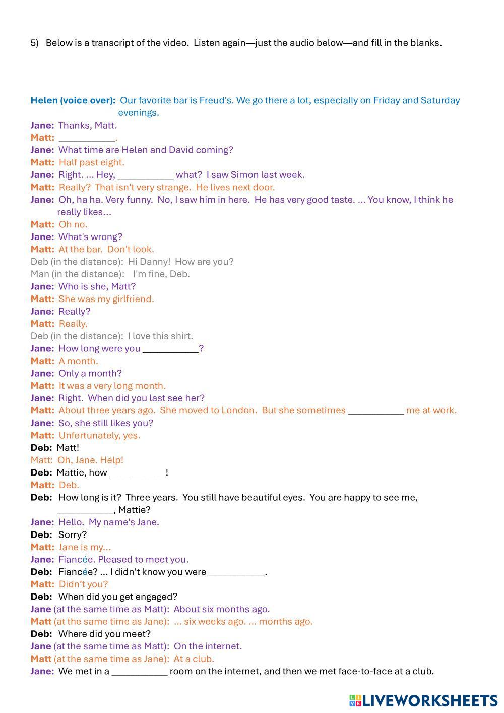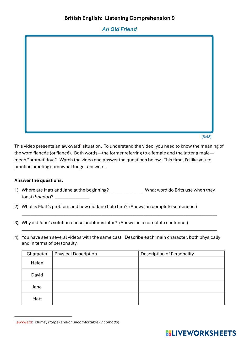 Created by Cadmus ESL B2 Listening English Author's Instructions Students watch the video and answer the questions. My Google Classroom Courses × 0 classes selected (0 students total) Quick Access Select all classes (0 classes) All Classes Loading courses... Cancel Share Share to selected Course __COURSE_NAME__ __STUDENT_NAME__ (__STUDENT_EMAIL__) British English: Listening Comprehension 9 Download Worksheet Validation Check my answers Emails my answers to my teacher Full name Group/level School subject Teacher's email or key code Close Submit Validating worksheet... (12) Your answers have been sent to your teacher. Good luck! OK We encountered an error submitting your answers. Please try again. OK Advertisement | Go Ad Free Created by Cadmus ESL B2 Listening English Author's Instructions Students watch the video and answer the questions. Explore Worksheets British English: Listening Comprehension 10 ESL B2 British English: Listening Comprehension 10 Listening - ESL Students watch a video and answer questions. Includes a lesson on linking in British English. B2 Listening Test (How to improve your memory) ESL B2 B2 Listening Test (How to improve your memory) Listening - ESL Listen and complete exercises British English: Listening Comprehension 8 ESL B2 British English: Listening Comprehension 8 Listening - ESL Students watch a video and answer comprehension questions. How do animals do that: Whale songs and cool canines ESL B2 How do animals do that: Whale songs and cool canines Listening - ESL Listen and answer.