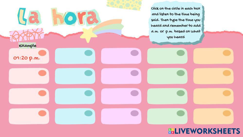 Click on the circle in each box and listen to the time being said. Then type the time you heard and remember to add a.m. or p.m. based on what you heard.