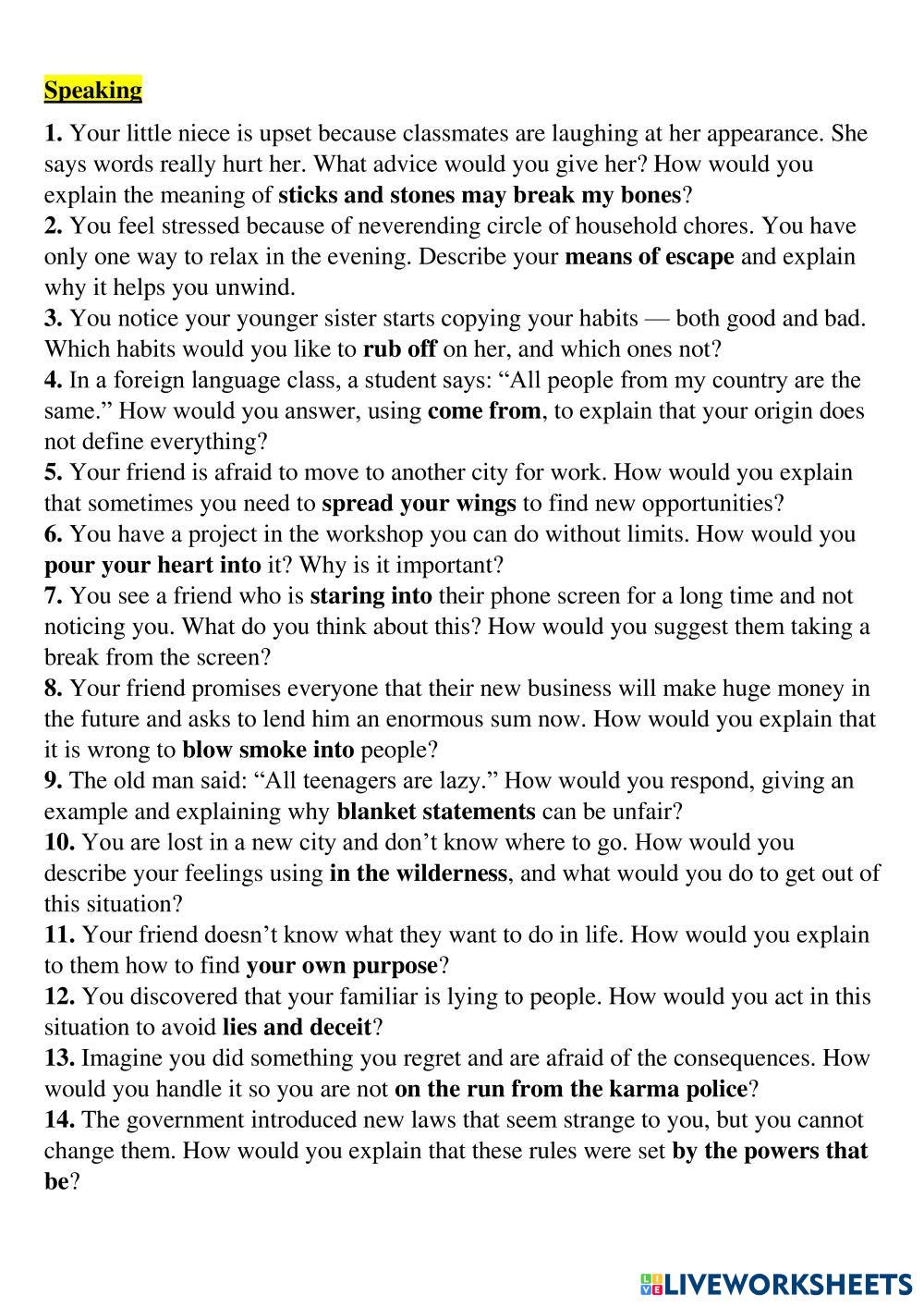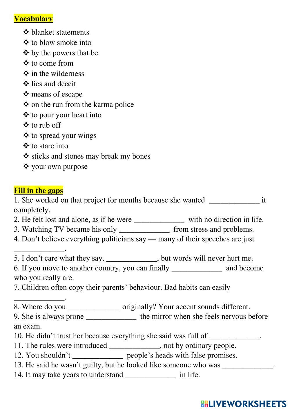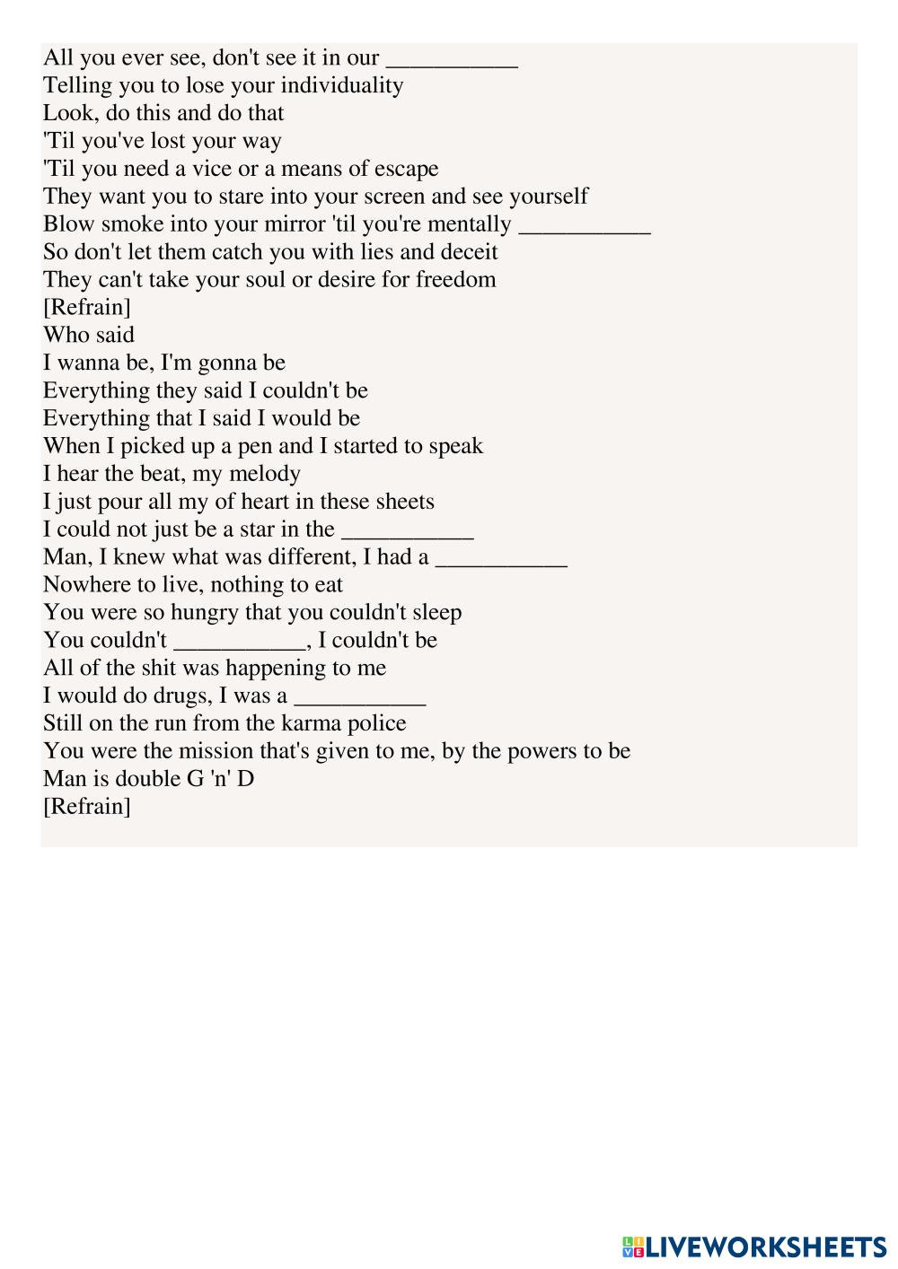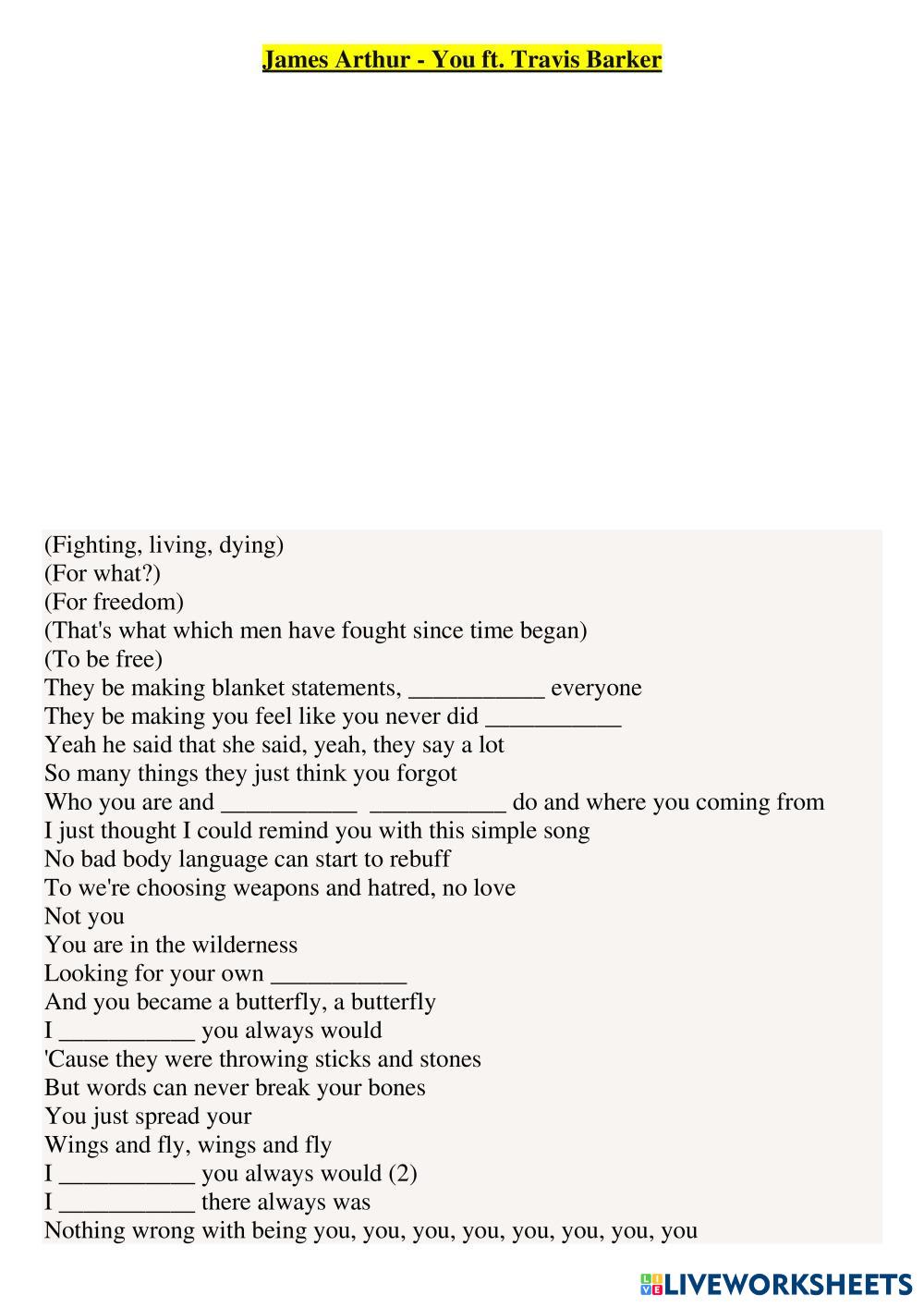 Created byViolet Arefieva ESL English C1 Listening English Author's Instructions Listen to the song and do tasks My Google Classroom Courses × 0 classes selected (0 students total) Quick Access Select all classes (0 classes) All Classes Loading courses... Cancel Share Share to selected Course __COURSE_NAME__ __STUDENT_NAME__ (__STUDENT_EMAIL__) James Arthur - You ft. Travis Barker Download Worksheet Validation Check my answers Emails my answers to my teacher Full name Group/level School subject Teacher's email or key code Close Submit Validating worksheet... (12) Your answers have been sent to your teacher. Good luck! OK We encountered an error submitting your answers. Please try again. OK Advertisement | Go Ad Free Created byViolet Arefieva ESL English C1 Listening English Author's Instructions Listen to the song and do tasks Explore Worksheets You Are Valued and Appreciated – A Gentle Reminder You Matter More Than You Know ESL C1 You Are Valued and Appreciated – A Gentle Reminder You Matter More Than You Know Listening - ESL Listen to the song and do tasks CAE Trainer 1 Listening Part 4 ESL C1 CAE Trainer 1 Listening Part 4 Listening - ESL Leer las instrucciones y rellenar los campos necesarios. Una vez que hayas terminado, las respuestas se enviaran de forma automatica a tu profesor si has incluido la dirección de email. INCLUDE YOUR FULL NAME! CAE Trainer 1 Listening Part 1 ESL C1 CAE Trainer 1 Listening Part 1 Listening - ESL Leer las instrucciones y rellenar los campos necesarios. Una vez que hayas terminado, las respuestas se enviaran de forma automatica a tu profesor si has incluido la dirección de email. Dance Gavin Dance - Man Of The Year ESL C1 Dance Gavin Dance - Man Of The Year Listening - ESL Listen to the song and do tasks