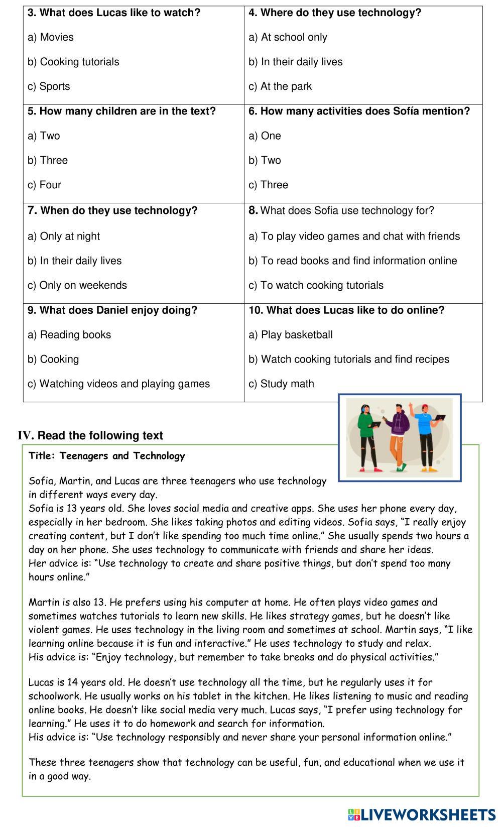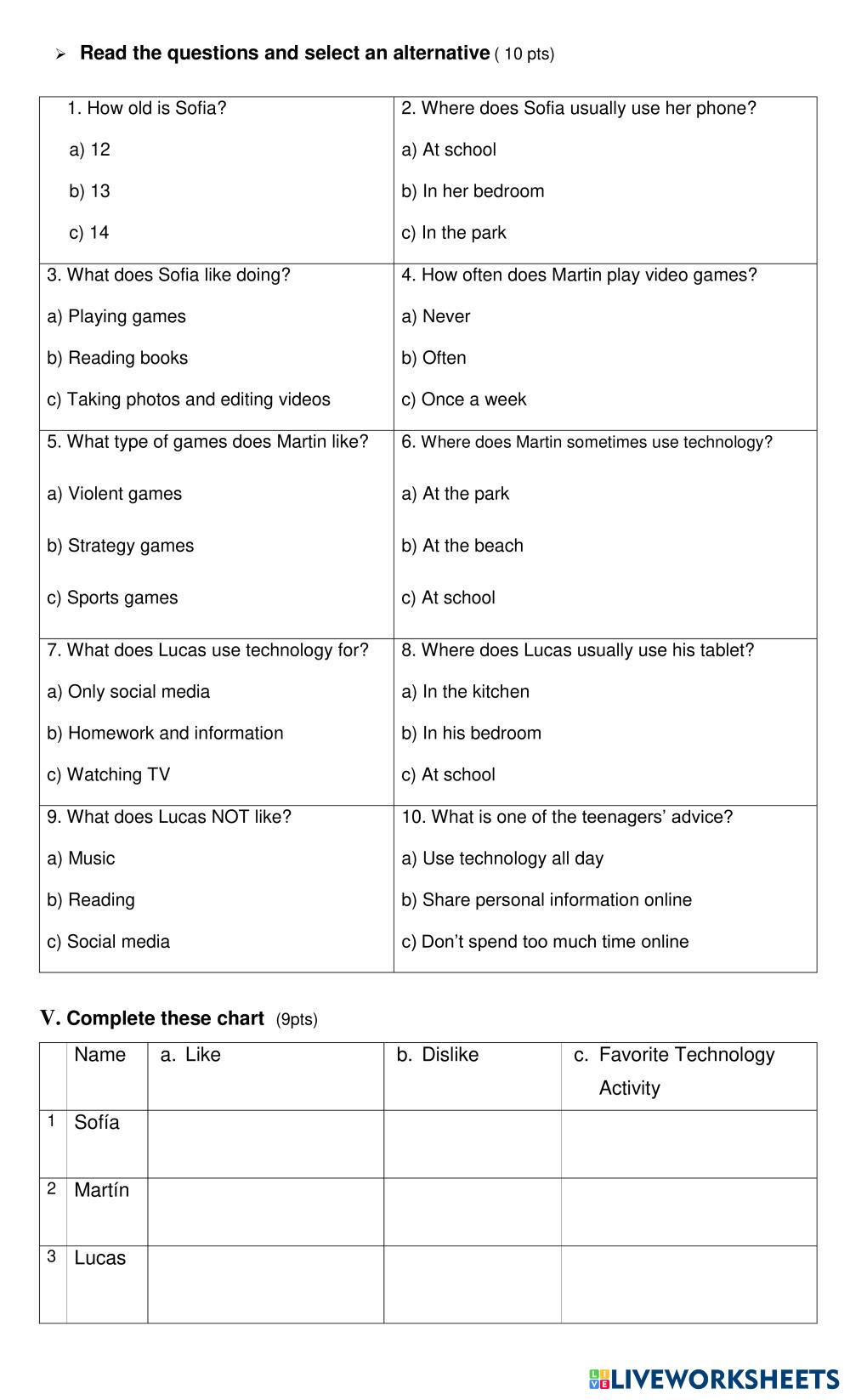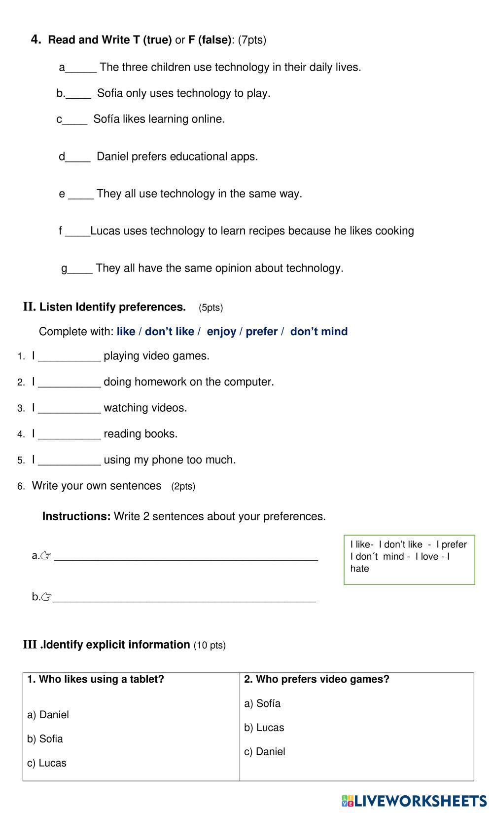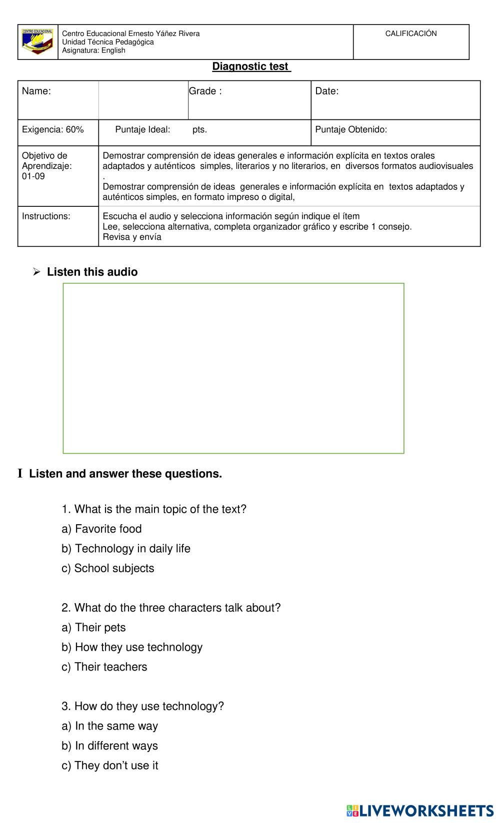 Created byvirna caniupil ESL English A2 Listening English Author's Instructions Escuchar y seleccionar información Leer texto relacionado con el uso de tecnología . My Google Classroom Courses × 0 classes selected (0 students total) Quick Access Select all classes (0 classes) All Classes Loading courses... Cancel Share Share to selected Course __COURSE_NAME__ __STUDENT_NAME__ (__STUDENT_EMAIL__) Diagnostic test Download Worksheet Validation Check my answers Emails my answers to my teacher Full name Group/level School subject Teacher's email or key code Close Submit Validating worksheet... (12) Your answers have been sent to your teacher. Good luck! OK We encountered an error submitting your answers. Please try again. OK Advertisement | Go Ad Free Created byvirna caniupil ESL English A2 Listening English Author's Instructions Escuchar y seleccionar información Leer texto relacionado con el uso de tecnología . Explore Worksheets Diagnostic Test 8th ESL A2 Diagnostic Test 8th Listening - ESL Escuchar , seleccionar información Leer , completar un organizador gráfico Gerund or Infinitives? (with a song) ESL A2 Gerund or Infinitives? (with a song) Listening - ESL Fill the blanks according to the song Listening A2 Key ESL A2 Listening A2 Key Listening - ESL Complete the listening according to the instructions given by the teacher. A2 Key for Schools Sample Test Listening (PV1 - 2022) ESL A2 A2 Key for Schools Sample Test Listening (PV1 - 2022) Listening - ESL Follow the instructions
