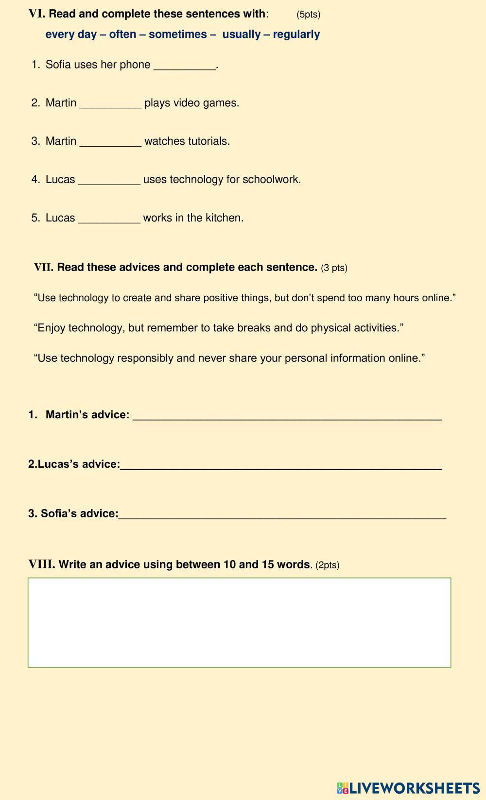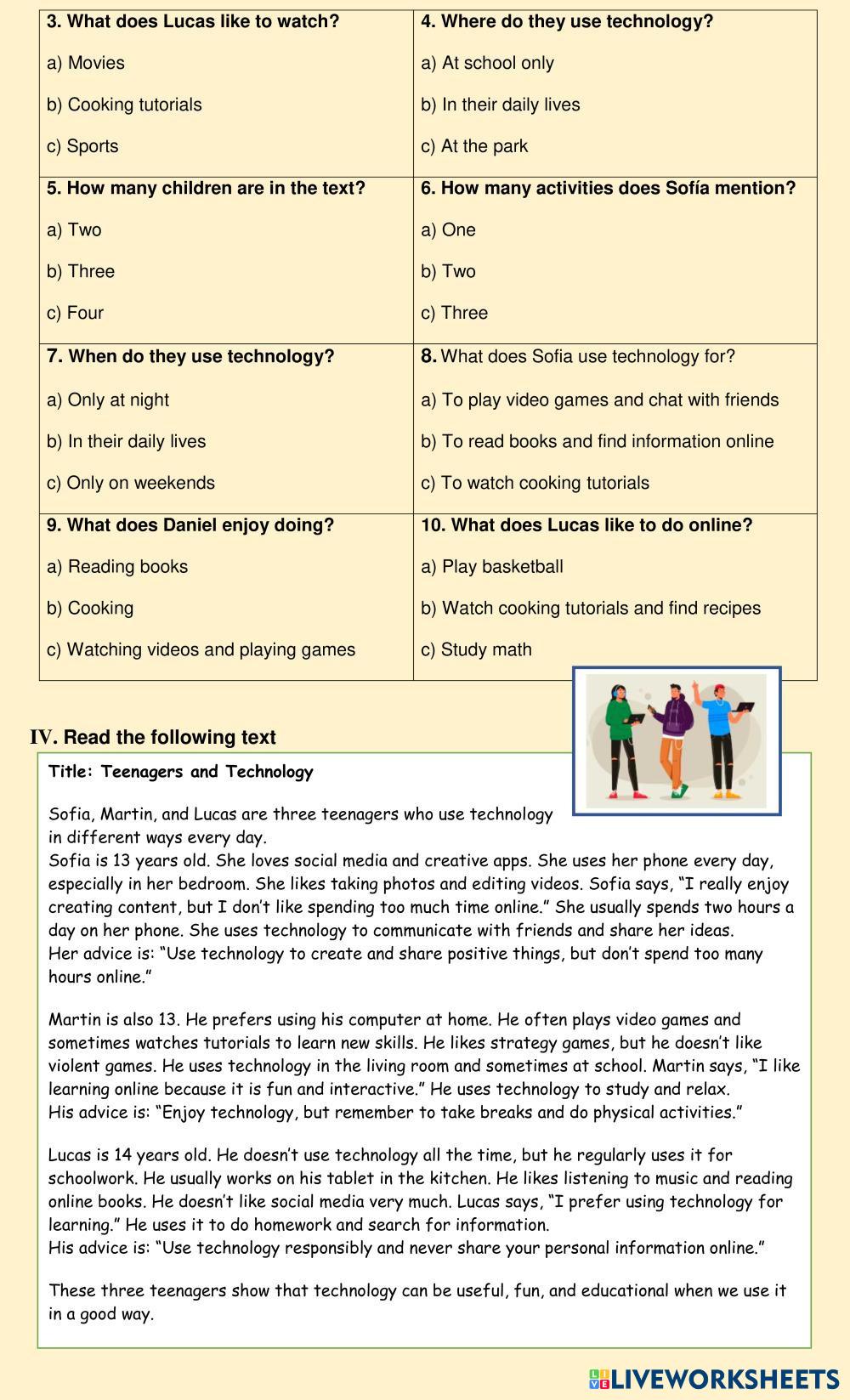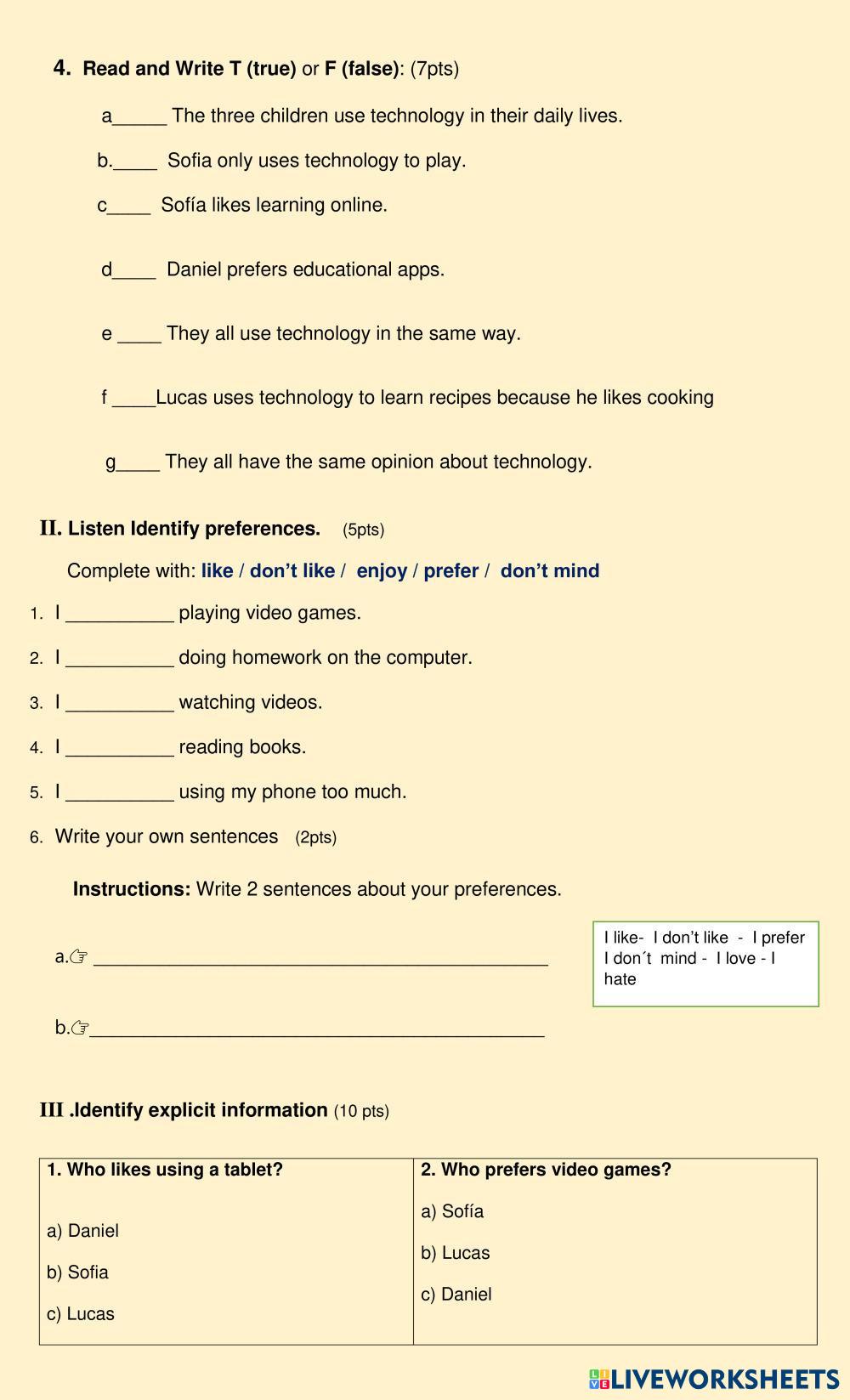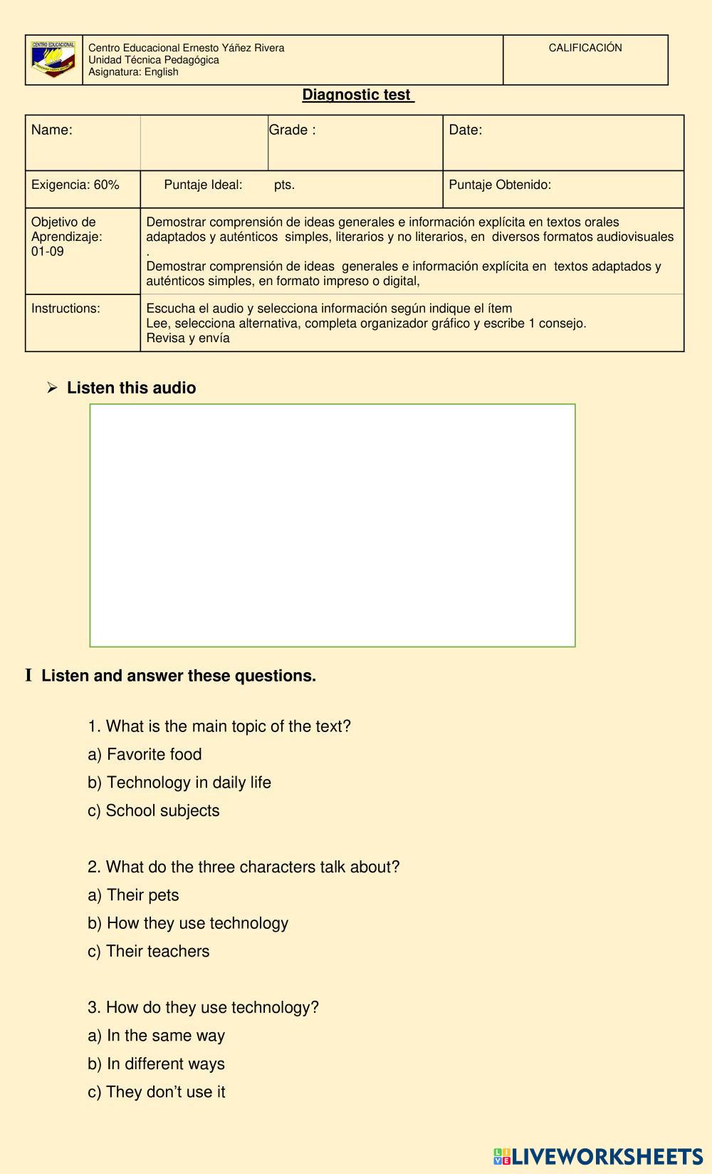 Created byvirna caniupil ESL English A2 Listening English Author's Instructions Escuchar , seleccionar información Leer , completar un organizador gráfico My Google Classroom Courses × 0 classes selected (0 students total) Quick Access Select all classes (0 classes) All Classes Loading courses... Cancel Share Share to selected Course __COURSE_NAME__ __STUDENT_NAME__ (__STUDENT_EMAIL__) Diagnostic Test 8th Download Worksheet Validation Check my answers Emails my answers to my teacher Full name Group/level School subject Teacher's email or key code Close Submit Validating worksheet... (12) Your answers have been sent to your teacher. Good luck! OK We encountered an error submitting your answers. Please try again. OK Advertisement | Go Ad Free Created byvirna caniupil ESL English A2 Listening English Author's Instructions Escuchar , seleccionar información Leer , completar un organizador gráfico Explore Worksheets Gerund or Infinitives? (with a song) ESL A2 Gerund or Infinitives? (with a song) Listening - ESL Fill the blanks according to the song Listening A2 Key ESL A2 Listening A2 Key Listening - ESL Complete the listening according to the instructions given by the teacher. Diagnostic test ESL A2 Diagnostic test Listening - ESL Escuchar y seleccionar información Leer texto relacionado con el uso de tecnología . A2 Key for Schools Sample Test Listening (PV1 - 2022) ESL A2 A2 Key for Schools Sample Test Listening (PV1 - 2022) Listening - ESL Follow the instructions