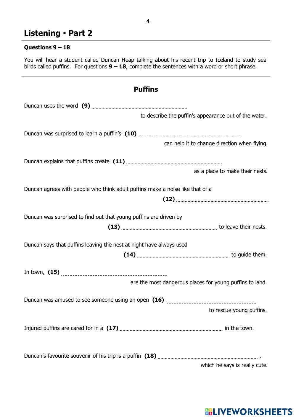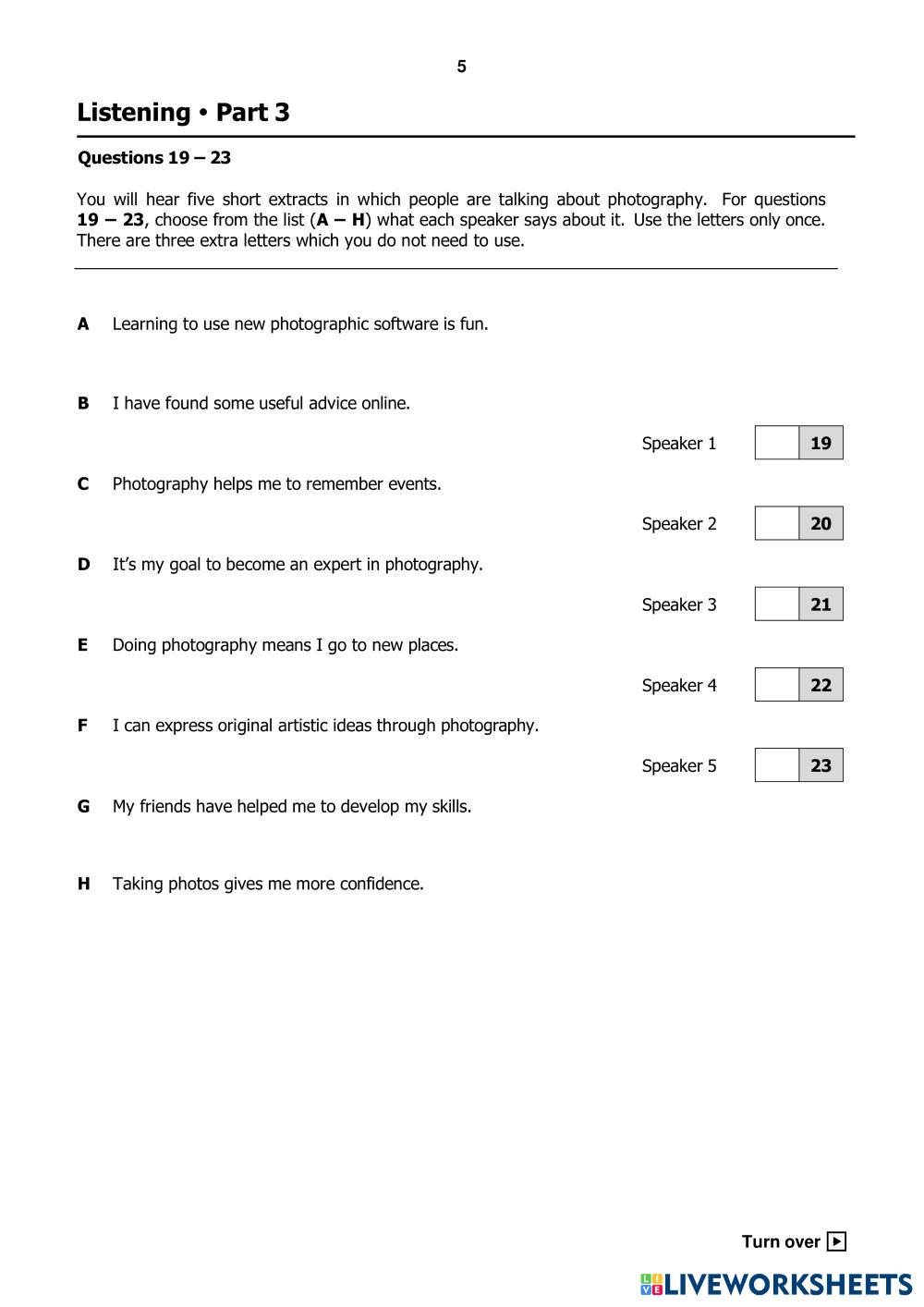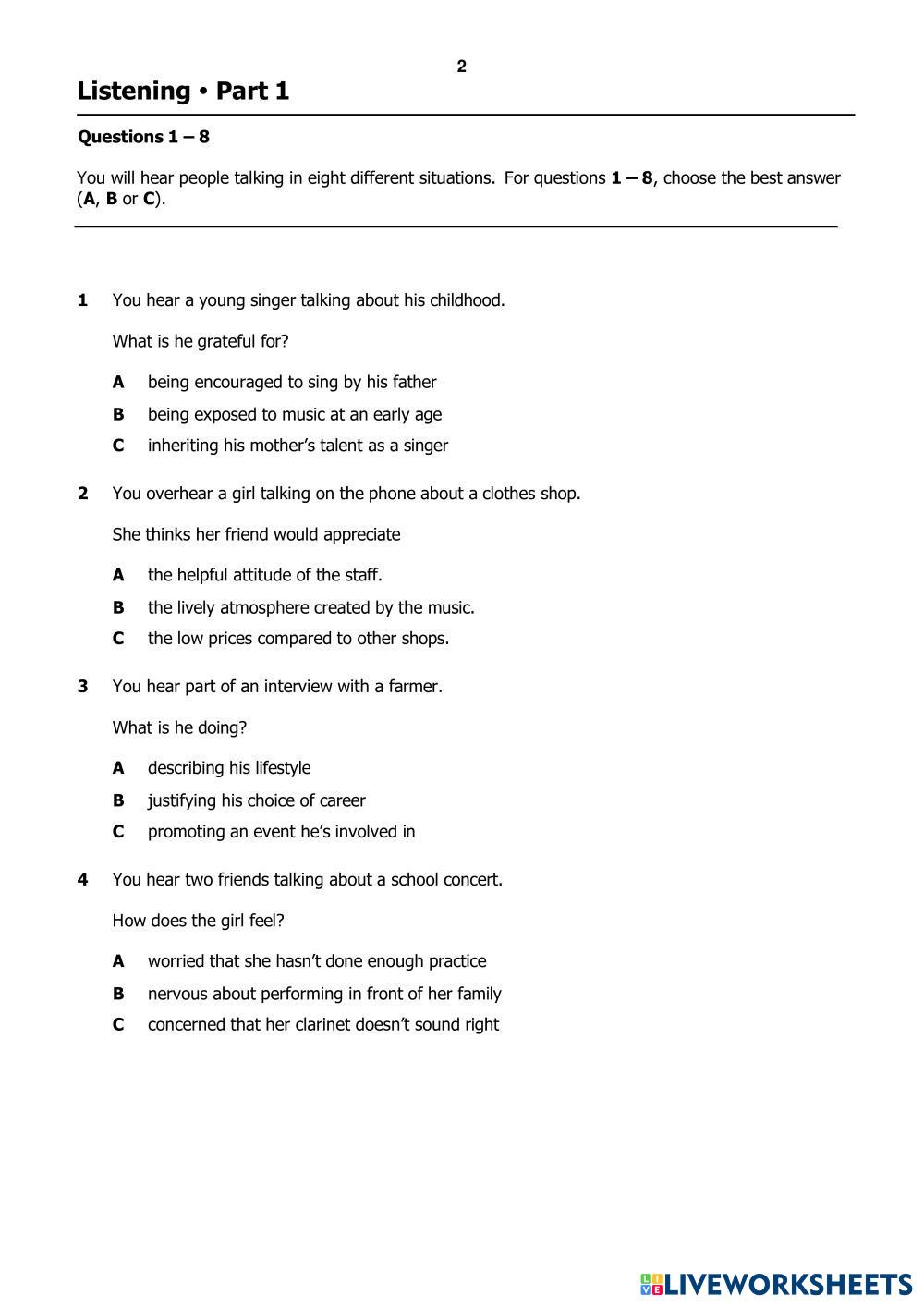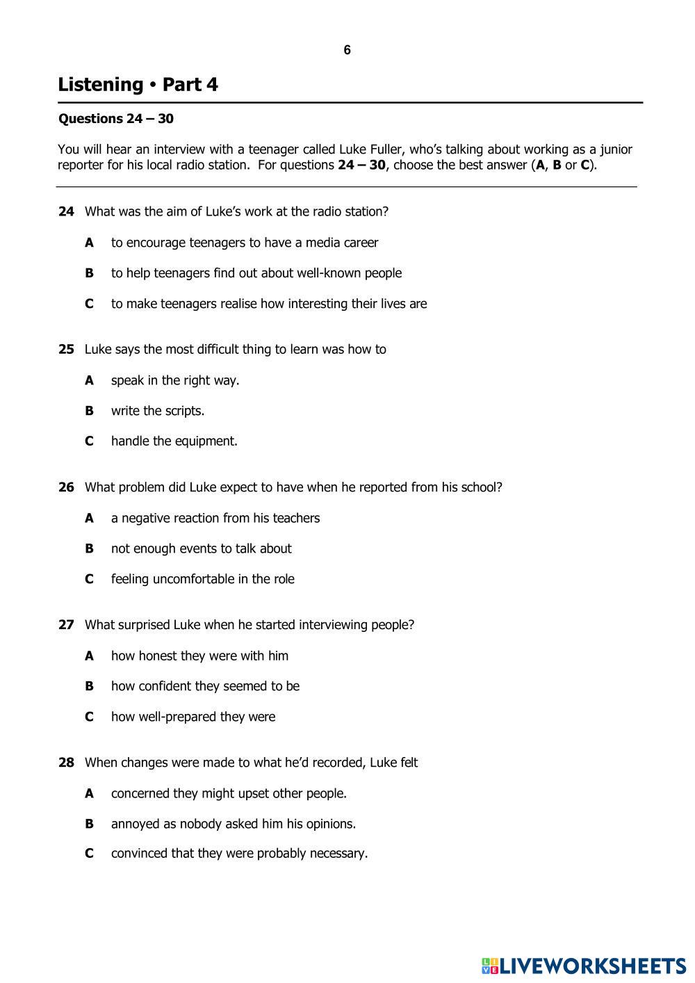 Created by Belle12 ESL English B2 Listening English Author's Instructions Follow the instructions My Google Classroom Courses × 0 classes selected (0 students total) Quick Access Select all classes (0 classes) All Classes Loading courses... Cancel Share Share to selected Course __COURSE_NAME__ __STUDENT_NAME__ (__STUDENT_EMAIL__) B2 First for Schools paper 1 Listening (2022) Download Worksheet Validation Check my answers Emails my answers to my teacher Full name Group/level School subject Teacher's email or key code Close Submit Validating worksheet... (12) Your answers have been sent to your teacher. Good luck! OK We encountered an error submitting your answers. Please try again. OK Advertisement | Go Ad Free Created by Belle12 ESL English B2 Listening English Author's Instructions Follow the instructions Explore Worksheets [Test] CAM 19 - TEST 4 - PART 3 BOOK PRESERVATION AND TREASURED MEMORIES ESL B2 [Test] CAM 19 - TEST 4 - PART 3 BOOK PRESERVATION AND TREASURED MEMORIES Listening - ESL Section 3 - Questions 21–25 Choose the correct letter, A, B or C. [Dictation] CAM 19 - TEST 4 - PART 3: BOOK PRESERVATION AND TREASURED MEMORIES ESL B2 [Dictation] CAM 19 - TEST 4 - PART 3: BOOK PRESERVATION AND TREASURED MEMORIES Listening - ESL CAM 19 - TEST 4 - PART 3 BOOK PRESERVATION AND TREASURED MEMORIES [Dictation] CAM 20 - TEST 3 - PART 1 - Furniture Rental Companies ESL B2 [Dictation] CAM 20 - TEST 3 - PART 1 - Furniture Rental Companies Listening - ESL Fill the blank with ONE word Listening test B2 ESL B2 Listening test B2 Listening - ESL Mock test listening
