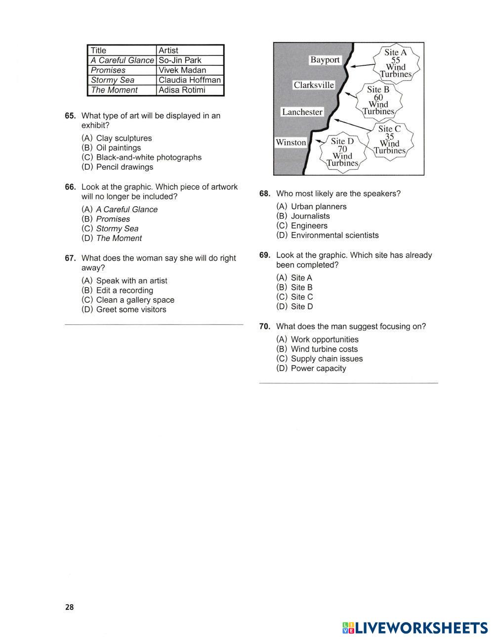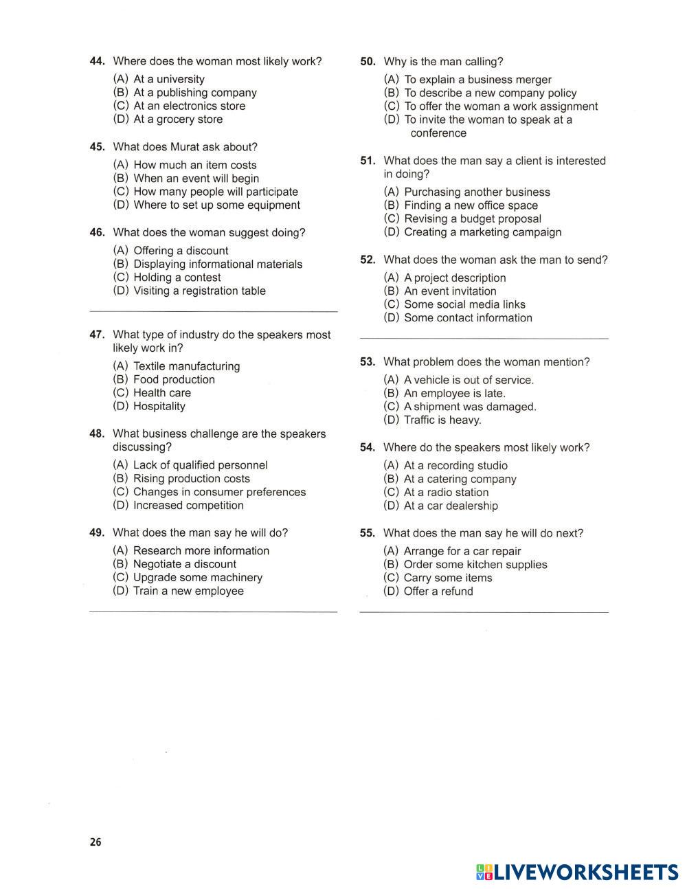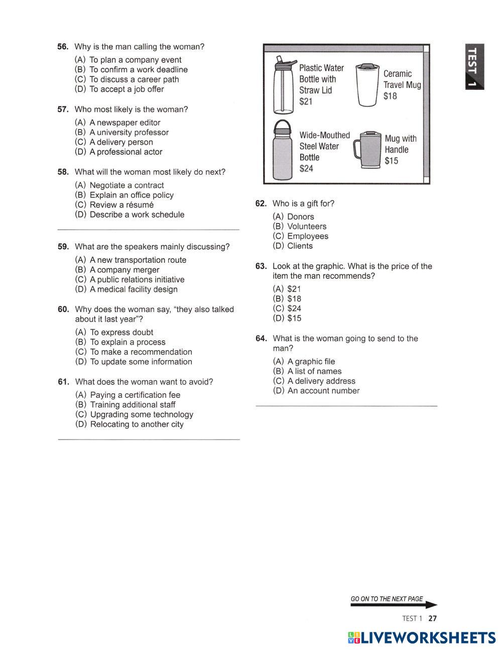 Created by arielnguyen1 ESL B2 Listening English Author's Instructions làm không hiểu thì hỏi My Google Classroom Courses × 0 classes selected (0 students total) Quick Access Select all classes (0 classes) All Classes Loading courses... Cancel Share Share to selected Course __COURSE_NAME__ __STUDENT_NAME__ (__STUDENT_EMAIL__) TOEIC LISTENING TEST 1 Download Worksheet Validation Check my answers Emails my answers to my teacher Full name Group/level School subject Teacher's email or key code Close Submit Validating worksheet... (12) Your answers have been sent to your teacher. Good luck! OK We encountered an error submitting your answers. Please try again. OK Advertisement | Go Ad Free Created by arielnguyen1 ESL B2 Listening English Author's Instructions làm không hiểu thì hỏi Explore Worksheets [Dictation] CAM 20 - TEST 3 - PART 1 - Furniture Rental Companies ESL B2 [Dictation] CAM 20 - TEST 3 - PART 1 - Furniture Rental Companies Listening - ESL Fill the blank with ONE word Listening test B2 ESL B2 Listening test B2 Listening - ESL Mock test listening B2 First for Schools paper 1 Listening (2022) ESL B2 B2 First for Schools paper 1 Listening (2022) Listening - ESL Follow the instructions Pearson Edexcel ESL Listening Modular Mock Test -1 ESL B2 Pearson Edexcel ESL Listening Modular Mock Test -1 Listening - ESL iG ESL - Question paper Modular 2