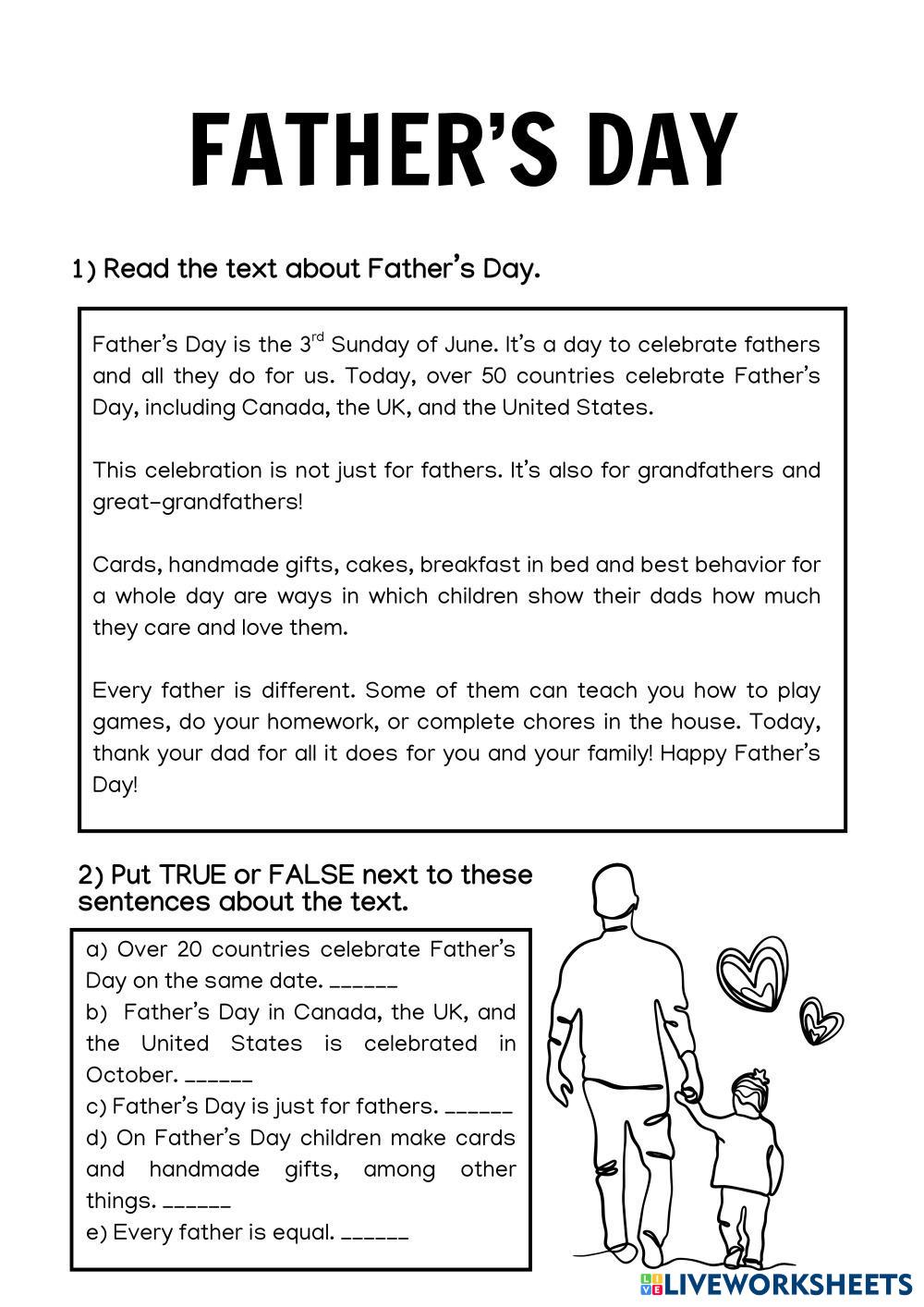 This ESL worksheet offers a reading comprehension activity for kids about Father's Day. After reading a short text, they must choose whether the sentences are true or false.