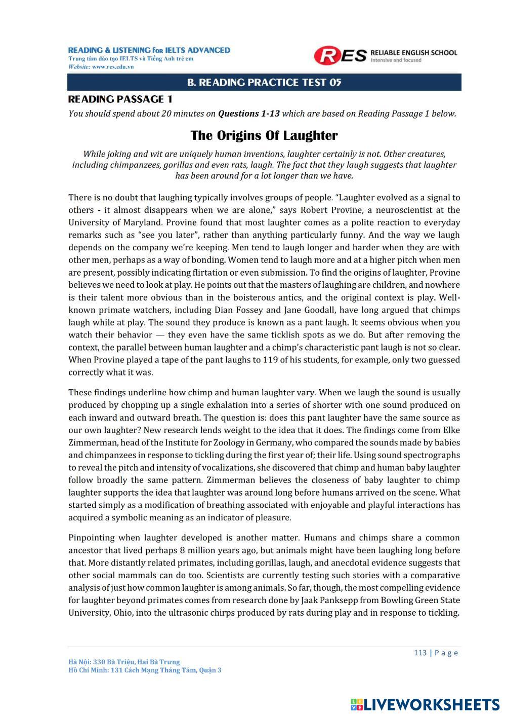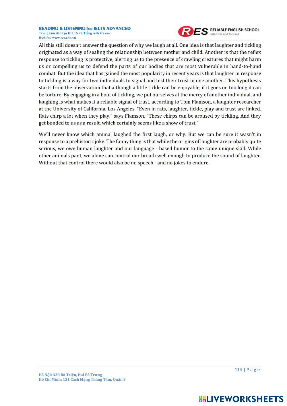 Created byUIA ESL English C1 Reading English Author's Instructions Work within 1 hour only My Google Classroom Courses × 0 classes selected (0 students total) Quick Access Select all classes (0 classes) All Classes Loading courses... Cancel Share Share to selected Course __COURSE_NAME__ __STUDENT_NAME__ (__STUDENT_EMAIL__) Lesson 5 Reading Practice Test 5 Download Worksheet Validation Check my answers Emails my answers to my teacher Full name Group/level School subject Teacher's email or key code Close Submit Validating worksheet... (12) Your answers have been sent to your teacher. Good luck! OK We encountered an error submitting your answers. Please try again. OK Advertisement | Go Ad Free Created byUIA ESL English C1 Reading English Author's Instructions Work within 1 hour only Explore Worksheets Module G practice - The Placebo Effect ESL C1 Module G practice - The Placebo Effect Reading - ESL Read and answer IELTS 6.5-7.5 (1) Final/ Reading ESL C1 IELTS 6.5-7.5 (1) Final/ Reading Reading - ESL IELTS 6.5-7.5 (1) Final/ Reading toefl reading Toltec philosophy ESL C1 toefl reading Toltec philosophy Reading - ESL fill out the gaps C1 Reading Test 1 ESL C1 C1 Reading Test 1 Reading - ESL Read the text and answer the questions