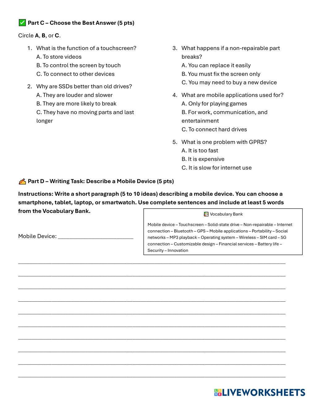 Explains the characteristics of different mobile devices such as non-repairable components, unusable hardware, touchscreens, and solid-state units by answering questions about key details and restating key elements.