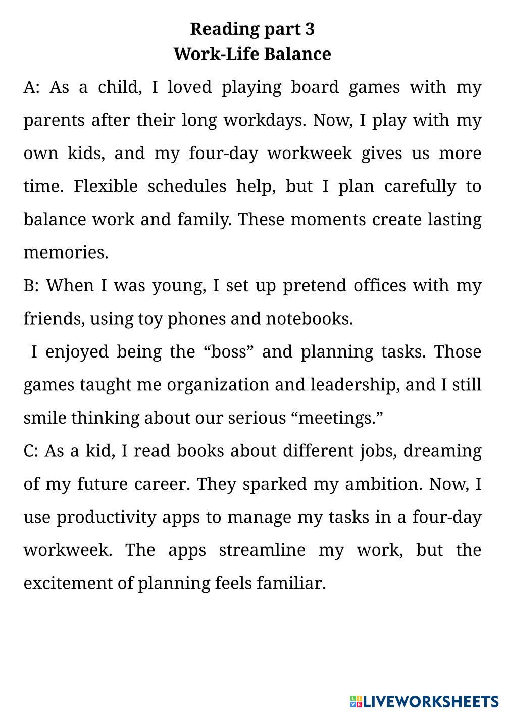 Created byTú Nguyễn ESL Vietnamese B2-Upper Intermediate Reading English Author's Instructions Choose My Google Classroom Courses × 0 classes selected (0 students total) Quick Access Select all classes (0 classes) All Classes Loading courses... Cancel Share Share to selected Course __COURSE_NAME__ __STUDENT_NAME__ (__STUDENT_EMAIL__) Reading Part 3 update Download Worksheet Validation Check my answers Emails my answers to my teacher Full name Group/level School subject Teacher's email or key code Close Submit Validating worksheet... (12) Your answers have been sent to your teacher. Good luck! OK We encountered an error submitting your answers. Please try again. OK Advertisement | Go Ad Free Created byTú Nguyễn ESL Vietnamese B2-Upper Intermediate Reading English Author's Instructions Choose Explore Worksheets Reading 2-11 ESL B2-Upper Intermediate Reading 2-11 Reading - ESL Choose AEF 3 - The ticket inspector ESL B2-Upper Intermediate AEF 3 - The ticket inspector Reading - ESL Fill in the blanks with NO MORE THAN 4 WORDS for each. Reading 26.10 ESL B2-Upper Intermediate Reading 26.10 Reading - ESL Choose Tổng ôn Reading Part 2 (2) ESL B2-Upper Intermediate Tổng ôn Reading Part 2 (2) Reading - ESL Choose