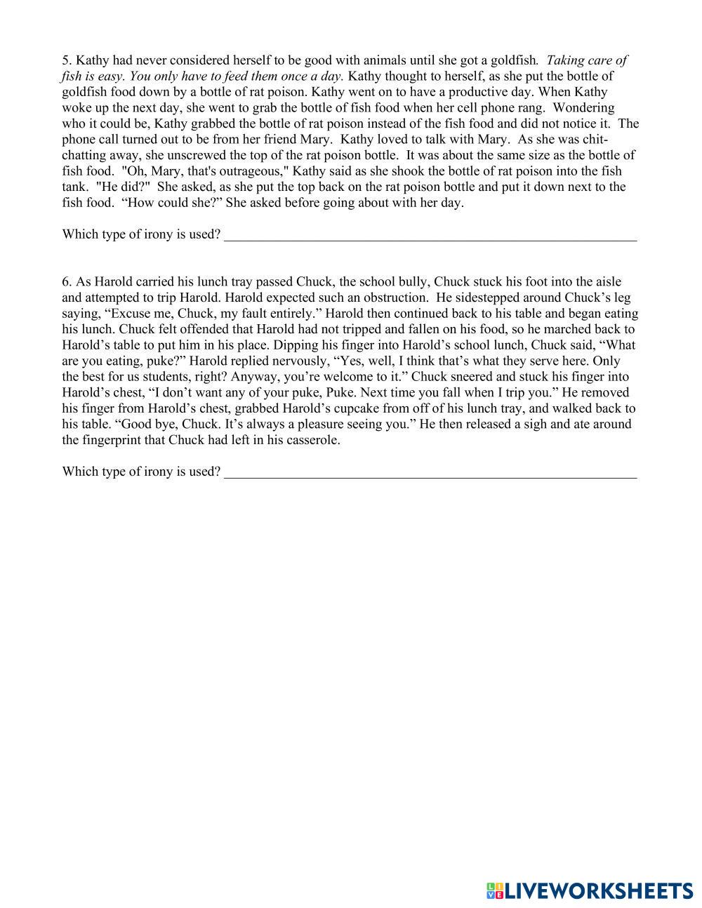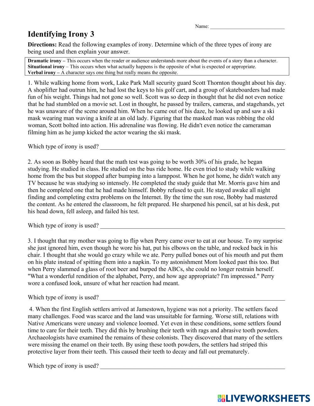 Directions: Read the following examples of irony. Determine which of the three types of irony are being used and then explain your answer.