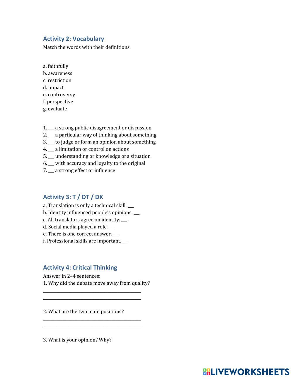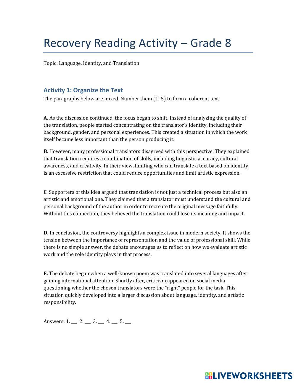 Created byJeiferson Rodriguez Vargas ESL English B1 Reading English Author's Instructions Please read and complete the exercise My Google Classroom Courses × 0 classes selected (0 students total) Quick Access Select all classes (0 classes) All Classes Loading courses... Cancel Share Share to selected Course __COURSE_NAME__ __STUDENT_NAME__ (__STUDENT_EMAIL__) Language, Identity, and Translation Download Worksheet Validation Check my answers Emails my answers to my teacher Full name Group/level School subject Teacher's email or key code Close Submit Validating worksheet... (12) Your answers have been sent to your teacher. Good luck! OK We encountered an error submitting your answers. Please try again. OK Advertisement | Go Ad Free Created byJeiferson Rodriguez Vargas ESL English B1 Reading English Author's Instructions Please read and complete the exercise Explore Worksheets Scrambled Request ESL B1 Scrambled Request Reading - ESL Place the sentence parts in correct order to show a dialogue between a tenant and a landlord. Chemistry in everyday life ESL B1 Chemistry in everyday life Reading - ESL Read the text and do the tasks Practice Bagrut C ESL B1 Practice Bagrut C Reading - ESL Read this passage and answer the questions. The world's second largest city ESL B1 The world's second largest city Reading - ESL Read the text and answer the questions.