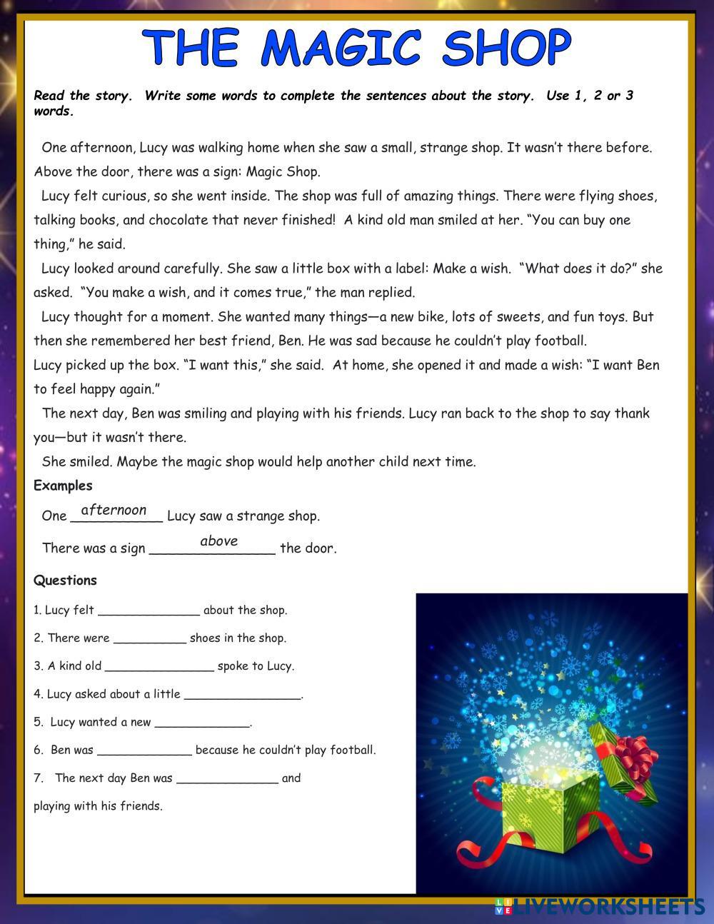 Created by estherlee76 ESL English A2 Reading English Author's Instructions Read the story and answer the questions. My Google Classroom Courses × 0 classes selected (0 students total) Quick Access Select all classes (0 classes) All Classes Loading courses... Cancel Share Share to selected Course __COURSE_NAME__ __STUDENT_NAME__ (__STUDENT_EMAIL__) The Magic Shop A2 Shopping Download Worksheet Validation Check my answers Emails my answers to my teacher Full name Group/level School subject Teacher's email or key code Close Submit Validating worksheet... (12) Your answers have been sent to your teacher. Good luck! OK We encountered an error submitting your answers. Please try again. OK Advertisement | Go Ad Free Created by estherlee76 ESL English A2 Reading English Author's Instructions Read the story and answer the questions. Explore Worksheets Inbal's Blog ESL A2 Inbal's Blog Reading - ESL Read the text and answer the questions. Relationship ESL A2 Relationship Reading - ESL Read and match the definitions. Flyers6t3read ESL A2 Flyers6t3read Reading - ESL Reading materials Tom's BIrthday A2 Reader Shopping ESL A2 Tom's BIrthday A2 Reader Shopping Reading - ESL Read the story and answer the questions.