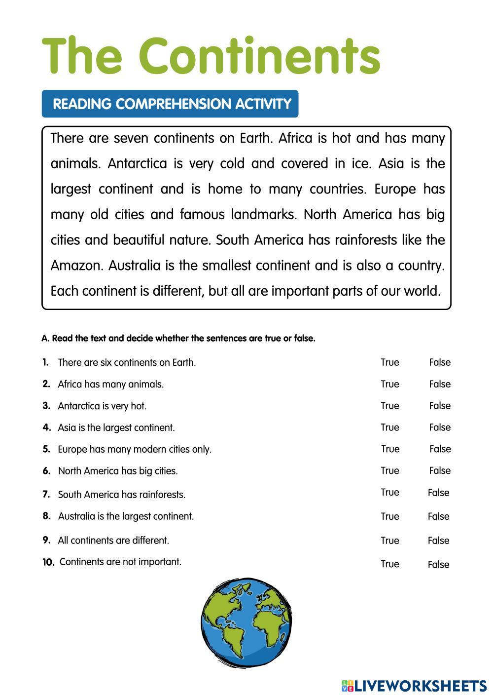 Created by WorksheetsByValentina ESL English A2 Reading English Author's Instructions This A2-level ESL worksheet offers a reading comprehension activity about the continents. My Google Classroom Courses × 0 classes selected (0 students total) Quick Access Select all classes (0 classes) All Classes Loading courses... Cancel Share Share to selected Course __COURSE_NAME__ __STUDENT_NAME__ (__STUDENT_EMAIL__) The Continents: A2 ESL Reading Comprehension Download Worksheet Validation Check my answers Emails my answers to my teacher Full name Group/level School subject Teacher's email or key code Close Submit Validating worksheet... (12) Your answers have been sent to your teacher. Good luck! OK We encountered an error submitting your answers. Please try again. OK Advertisement | Go Ad Free Created by WorksheetsByValentina ESL English A2 Reading English Author's Instructions This A2-level ESL worksheet offers a reading comprehension activity about the continents. Explore Worksheets Reading comprehension ESL A2 Reading comprehension Reading - ESL Choose the right answer Homework 05: Monsters University ESL A2 Homework 05: Monsters University Reading - ESL Choose the right answer 3. 1. SUMMER SCHOOL ESL A2 3. 1. SUMMER SCHOOL Reading - ESL Please complete the exercises that we previously worked on in the classroom. Product dvelopment reading ESL A2 Product dvelopment reading Reading - ESL Read and choose the correct option