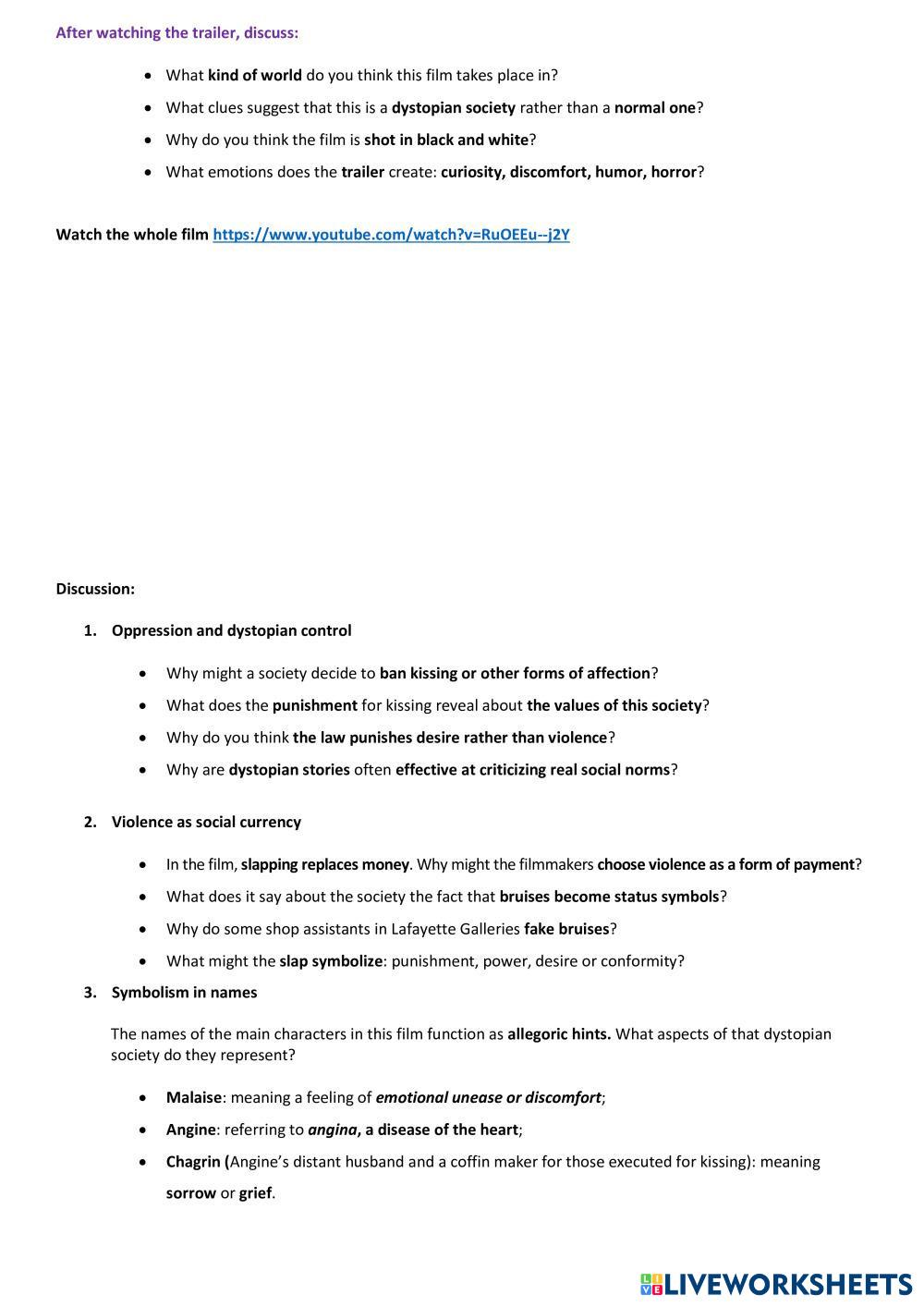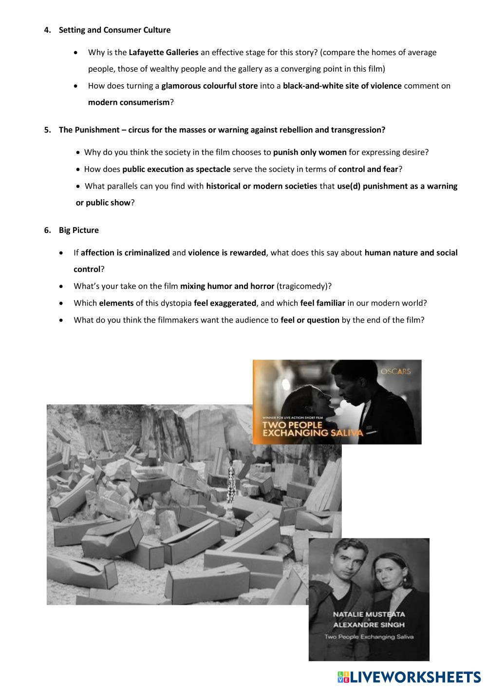 Created by Delilah ESL English B2 Speaking English Author's Instructions Video based discussion My Google Classroom Courses × 0 classes selected (0 students total) Quick Access Select all classes (0 classes) All Classes Loading courses... Cancel Share Share to selected Course __COURSE_NAME__ __STUDENT_NAME__ (__STUDENT_EMAIL__) Speaking: And the Oscar goes to… Two people exchanging saliva Download Worksheet Validation Check my answers Emails my answers to my teacher Full name Group/level School subject Teacher's email or key code Close Submit Validating worksheet... (12) Your answers have been sent to your teacher. Good luck! OK We encountered an error submitting your answers. Please try again. OK Advertisement | Go Ad Free Created by Delilah ESL English B2 Speaking English Author's Instructions Video based discussion Explore Worksheets [DICTATION]CAM 19 - TEST 3 - PART 4 Microplastics ESL B2 [DICTATION]CAM 19 - TEST 3 - PART 4 Microplastics Speaking - ESL CAM 19 - TEST 3 - PART 4 Microplastics THE COLORS OF SPACE UNIT 3 ESL B2 THE COLORS OF SPACE UNIT 3 Speaking - ESL . 2 Sighseeing ESL B2 2 Sighseeing Speaking - ESL • Practise showing people round a town or city • Discuss different festivals and carnivals • Share your feelings about future developments where you live Guided Mediation Task: How to deal with customers' complaints ESL B2 Guided Mediation Task: How to deal with customers' complaints Speaking - ESL Watch the video and read the notes. Do the spoken and written mediation tasks and remember that you can't copy-paste info from the source text.