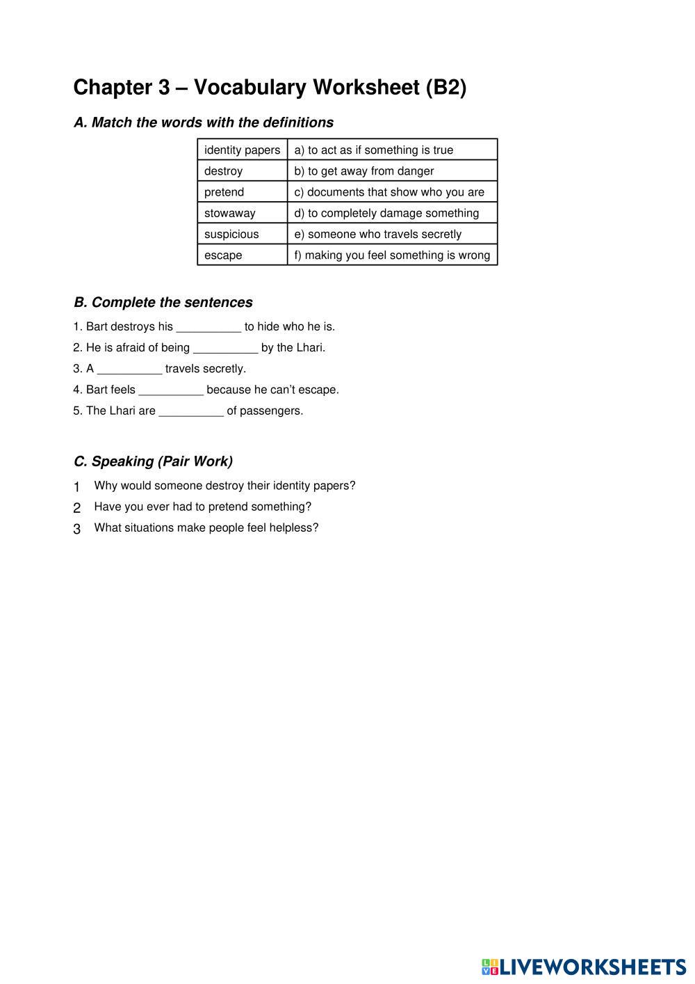 Created byBelen Zan ESL English B2 Speaking English Author's Instructions . My Google Classroom Courses × 0 classes selected (0 students total) Quick Access Select all classes (0 classes) All Classes Loading courses... Cancel Share Share to selected Course __COURSE_NAME__ __STUDENT_NAME__ (__STUDENT_EMAIL__) THE COLORS OF SPACE UNIT 3 Download Worksheet Validation Check my answers Emails my answers to my teacher Full name Group/level School subject Teacher's email or key code Close Submit Validating worksheet... (12) Your answers have been sent to your teacher. Good luck! OK We encountered an error submitting your answers. Please try again. OK Advertisement | Go Ad Free Created byBelen Zan ESL English B2 Speaking English Author's Instructions . Explore Worksheets [DICTATION]CAM 19 - TEST 3 - PART 4 Microplastics ESL B2 [DICTATION]CAM 19 - TEST 3 - PART 4 Microplastics Speaking - ESL CAM 19 - TEST 3 - PART 4 Microplastics 2 Sighseeing ESL B2 2 Sighseeing Speaking - ESL • Practise showing people round a town or city • Discuss different festivals and carnivals • Share your feelings about future developments where you live Speaking: And the Oscar goes to… Two people exchanging saliva ESL B2 Speaking: And the Oscar goes to… Two people exchanging saliva Speaking - ESL Video based discussion Guided Mediation Task: How to deal with customers' complaints ESL B2 Guided Mediation Task: How to deal with customers' complaints Speaking - ESL Watch the video and read the notes. Do the spoken and written mediation tasks and remember that you can't copy-paste info from the source text.