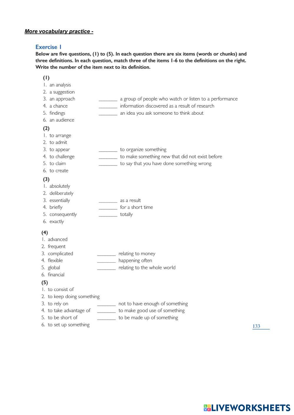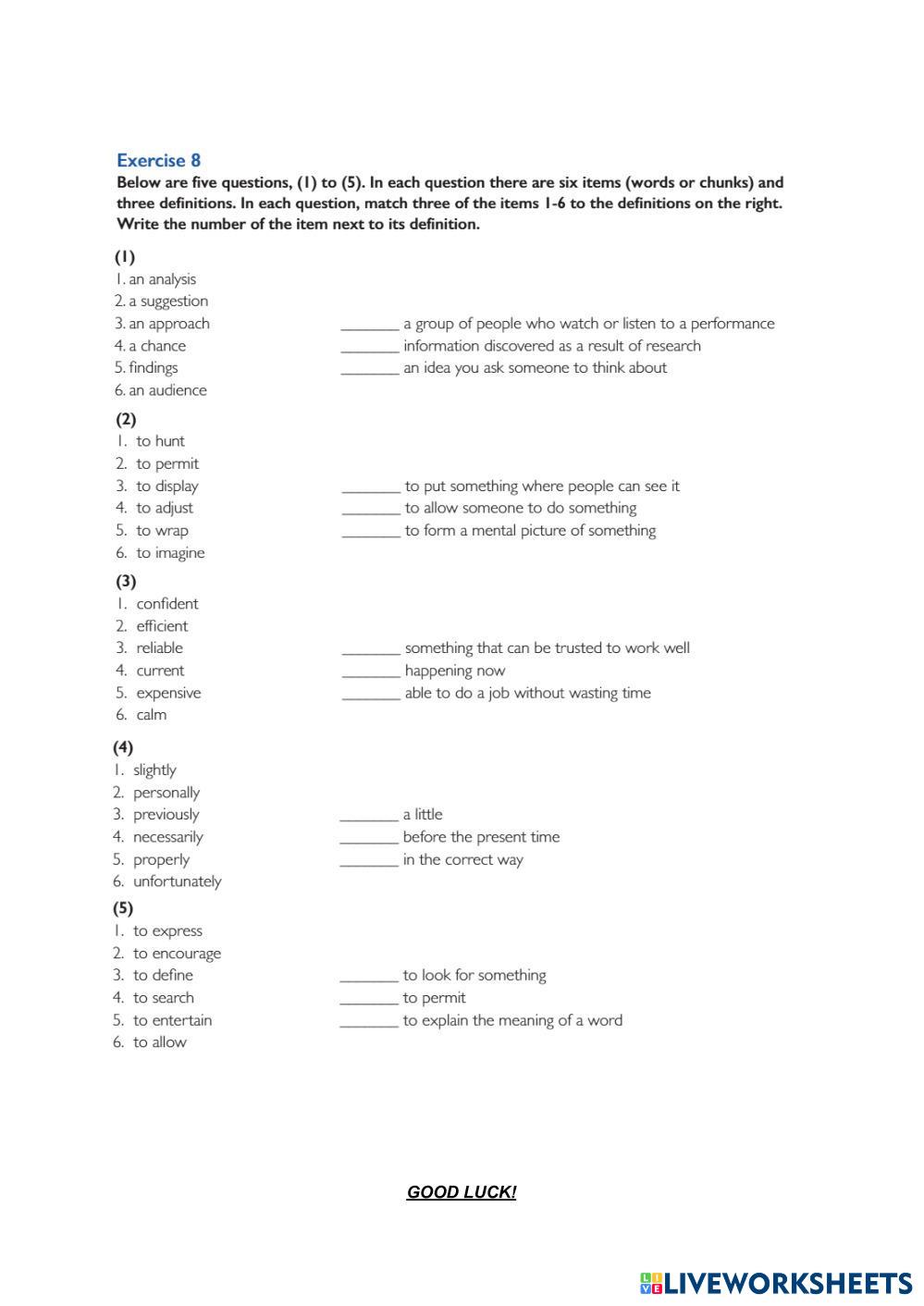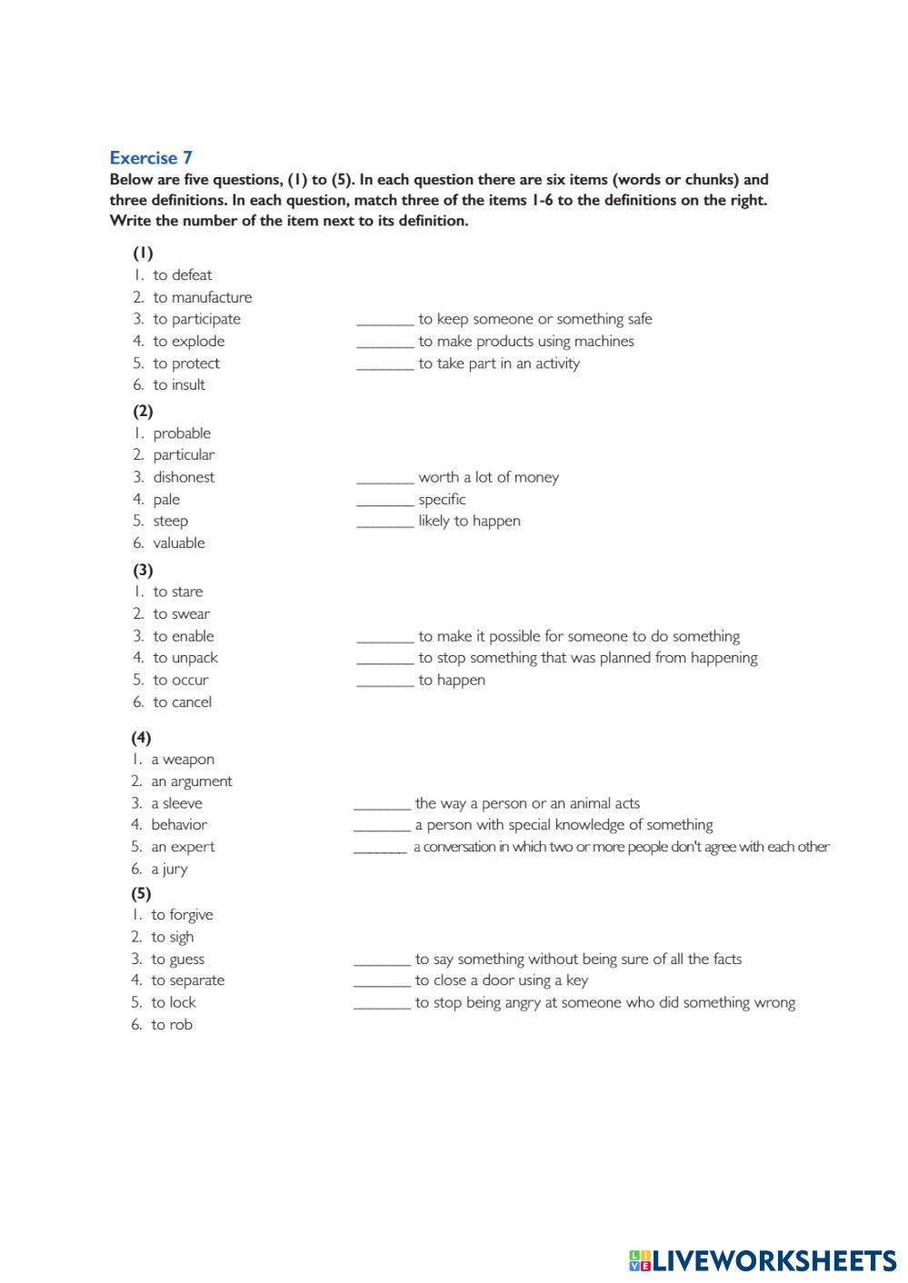 Write the number of the word / phrase on the left next to the correct definition on the right.