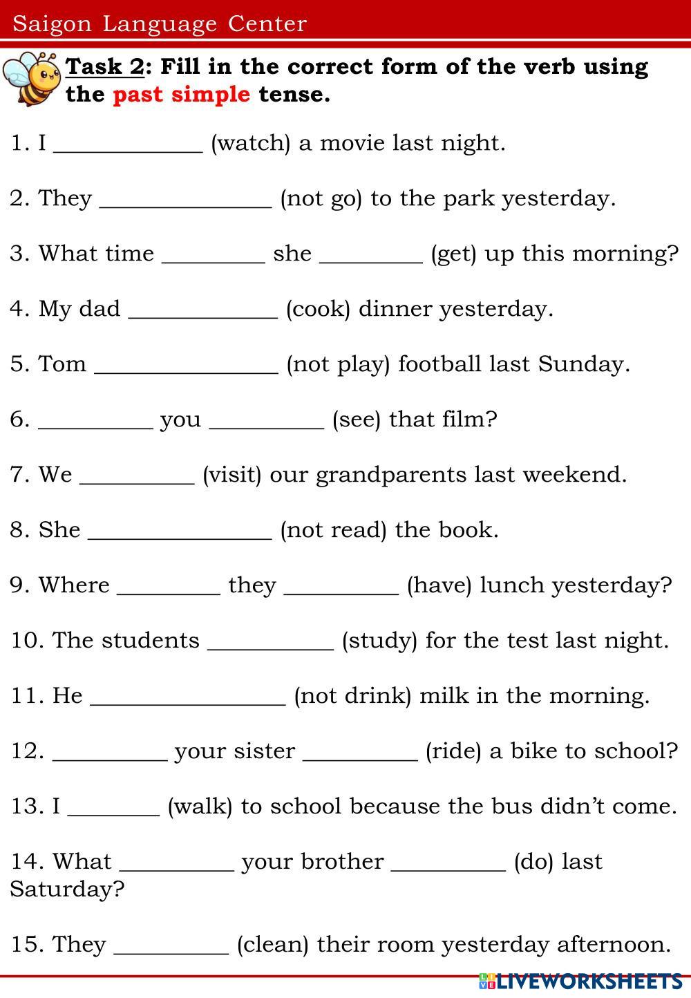 Created by Icy2002 ESL English A1 Vocabulary English Author's Instructions no My Google Classroom Courses × 0 classes selected (0 students total) Quick Access Select all classes (0 classes) All Classes Loading courses... Cancel Share Share to selected Course __COURSE_NAME__ __STUDENT_NAME__ (__STUDENT_EMAIL__) FFs2-Unit 14 Download Worksheet Validation Check my answers Emails my answers to my teacher Full name Group/level School subject Teacher's email or key code Close Submit Validating worksheet... (12) Your answers have been sent to your teacher. Good luck! OK We encountered an error submitting your answers. Please try again. OK Advertisement | Go Ad Free Created by Icy2002 ESL English A1 Vocabulary English Author's Instructions no Explore Worksheets Daily Routines ESL A1 Daily Routines Vocabulary - ESL English as a second language For practicing simple present with daily routines. Main content: Daily Routines Other contents: Simple present Academy Stars 3 Unit 1 test ESL A1 Academy Stars 3 Unit 1 test Vocabulary - ESL Read the instructions and do the test! Kids can 4! Unit 4 ESL A1 Kids can 4! Unit 4 Vocabulary - ESL Unit 4. Comparative and superlative ESL A1 Comparative and superlative Vocabulary - ESL English as a second language Main content: Comparatives and superlatives