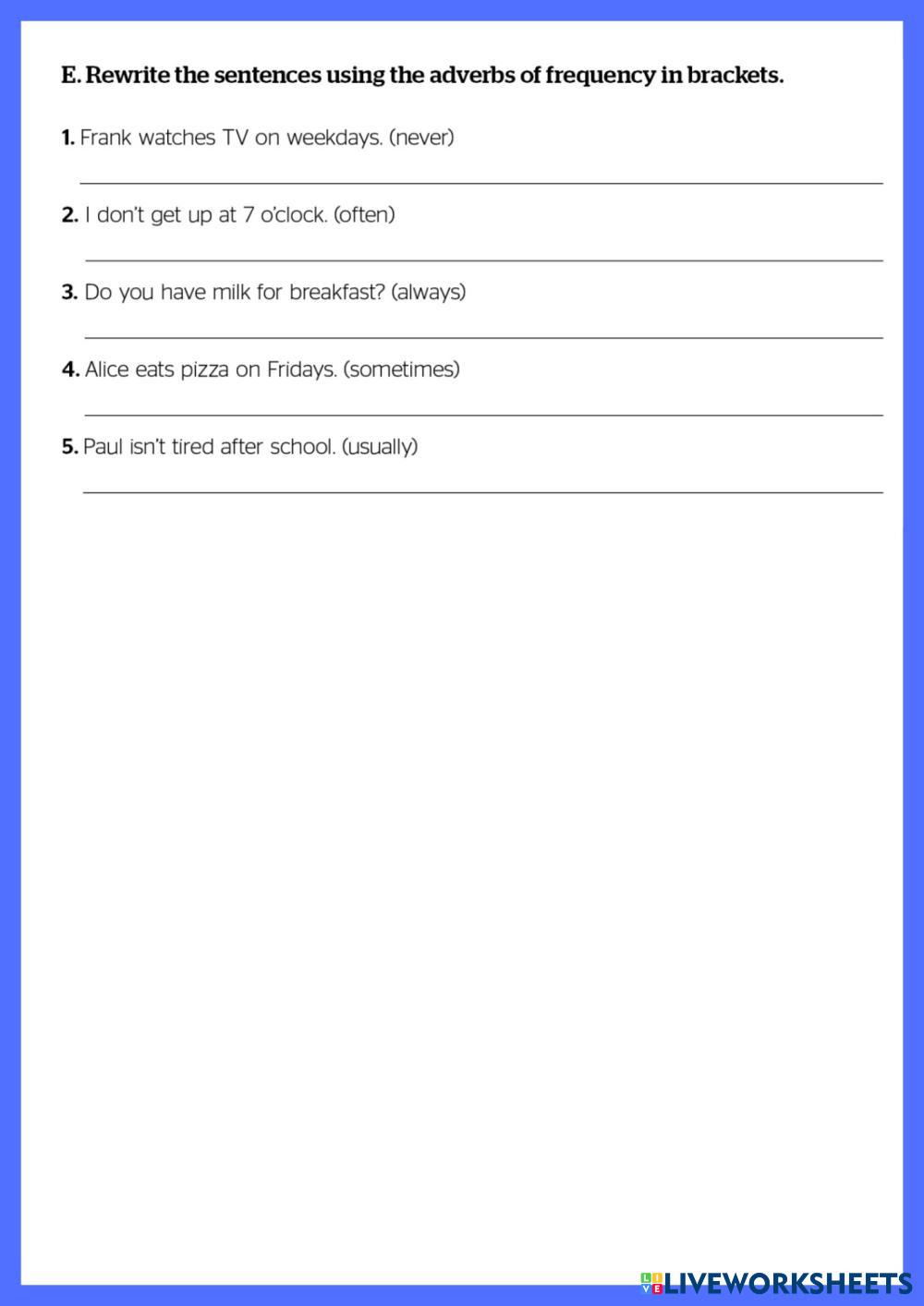 Created byYuliia Kharchenko ESL English A1 Vocabulary English Author's Instructions 6FBPWB1 My Google Classroom Courses × 0 classes selected (0 students total) Quick Access Select all classes (0 classes) All Classes Loading courses... Cancel Share Share to selected Course __COURSE_NAME__ __STUDENT_NAME__ (__STUDENT_EMAIL__) 6FBPWB1C Download Worksheet Validation Check my answers Emails my answers to my teacher Full name Group/level School subject Teacher's email or key code Close Submit Validating worksheet... (12) Your answers have been sent to your teacher. Good luck! OK We encountered an error submitting your answers. Please try again. OK Advertisement | Go Ad Free Created byYuliia Kharchenko ESL English A1 Vocabulary English Author's Instructions 6FBPWB1 Explore Worksheets Singular and Plural Noun ESL A1 Singular and Plural Noun Vocabulary - ESL Students should know how to classify the noun Irregular Plurals F- VES A1 ESL A1 Irregular Plurals F- VES A1 Vocabulary - ESL Look at the picture, read the sentences and complete with the correct form of the plural. Numbers 1-20 ESL A1 Numbers 1-20 Vocabulary - ESL English as a second language Number the words under the pictures Main content: Numbers Daily Routines ESL A1 Daily Routines Vocabulary - ESL English as a second language For practicing simple present with daily routines. Main content: Daily Routines Other contents: Simple present