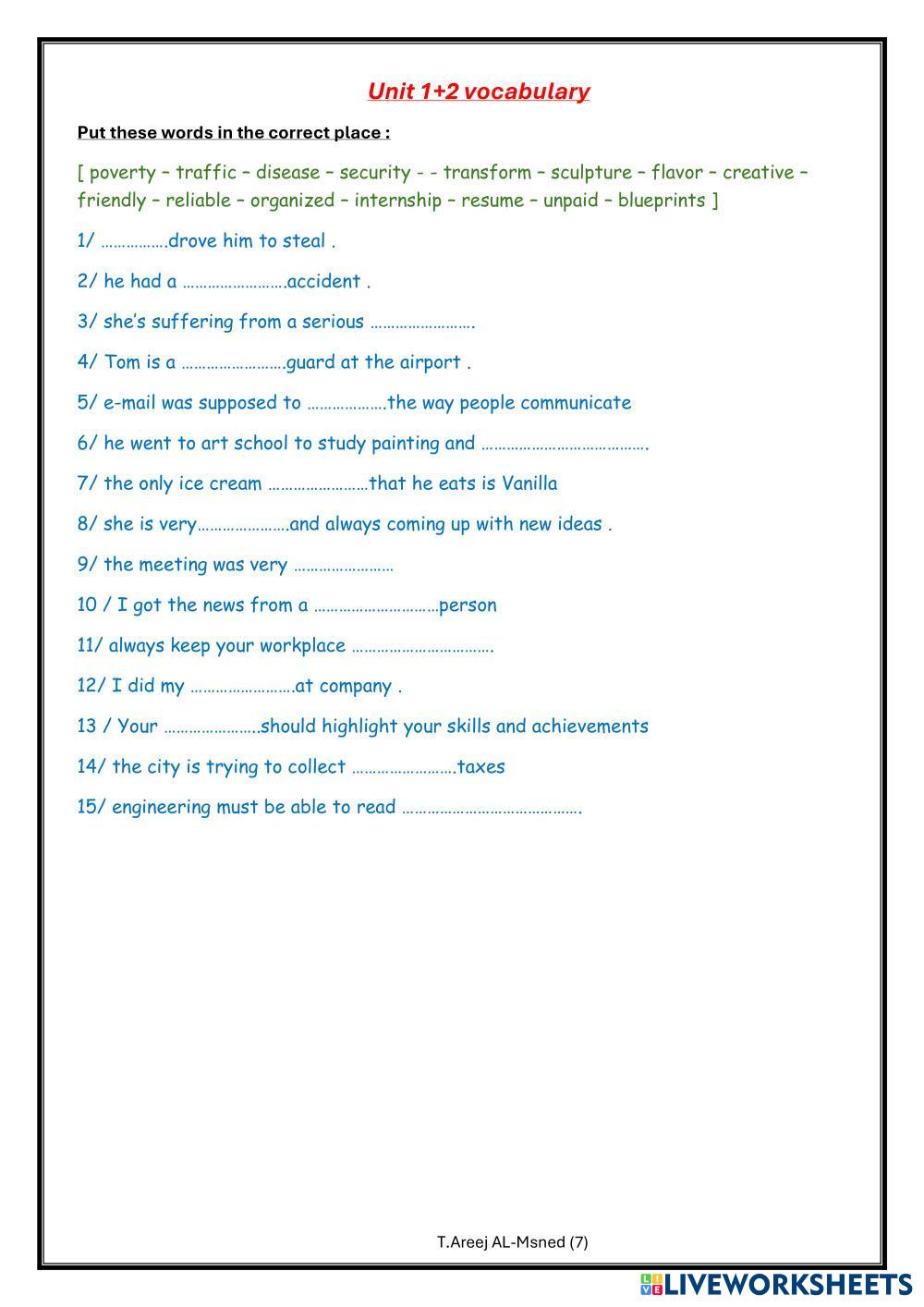 Created by AreejM ESL English B2-Upper Intermediate Vocabulary English Author's Instructions vocabulary My Google Classroom Courses × 0 classes selected (0 students total) Quick Access Select all classes (0 classes) All Classes Loading courses... Cancel Share Share to selected Course __COURSE_NAME__ __STUDENT_NAME__ (__STUDENT_EMAIL__) Mega 1 unit 1+ 2 vocabulary Download Worksheet Validation Check my answers Emails my answers to my teacher Full name Group/level School subject Teacher's email or key code Close Submit Validating worksheet... (12) Your answers have been sent to your teacher. Good luck! OK We encountered an error submitting your answers. Please try again. OK Advertisement | Go Ad Free Created by AreejM ESL English B2-Upper Intermediate Vocabulary English Author's Instructions vocabulary Explore Worksheets Vocabulary Revision 1 ESL B2-Upper Intermediate Vocabulary Revision 1 Vocabulary - ESL Do the Vocabulary exercises! On Screen B2 (Vocabulary) ESL B2-Upper Intermediate On Screen B2 (Vocabulary) Vocabulary - ESL on screen b2 EOT 1 Vocabulary Maze practice ESL B2-Upper Intermediate EOT 1 Vocabulary Maze practice Vocabulary - ESL Read the Text then choose the correct answer to complete the meaning of the sentence. B2 PRACTICE ESL B2-Upper Intermediate B2 PRACTICE Vocabulary - ESL GRAMMAR, VOCABULARY READING SKILL B2