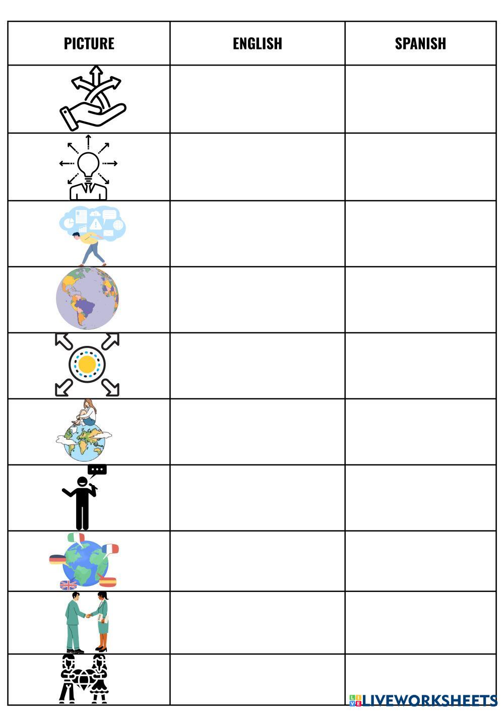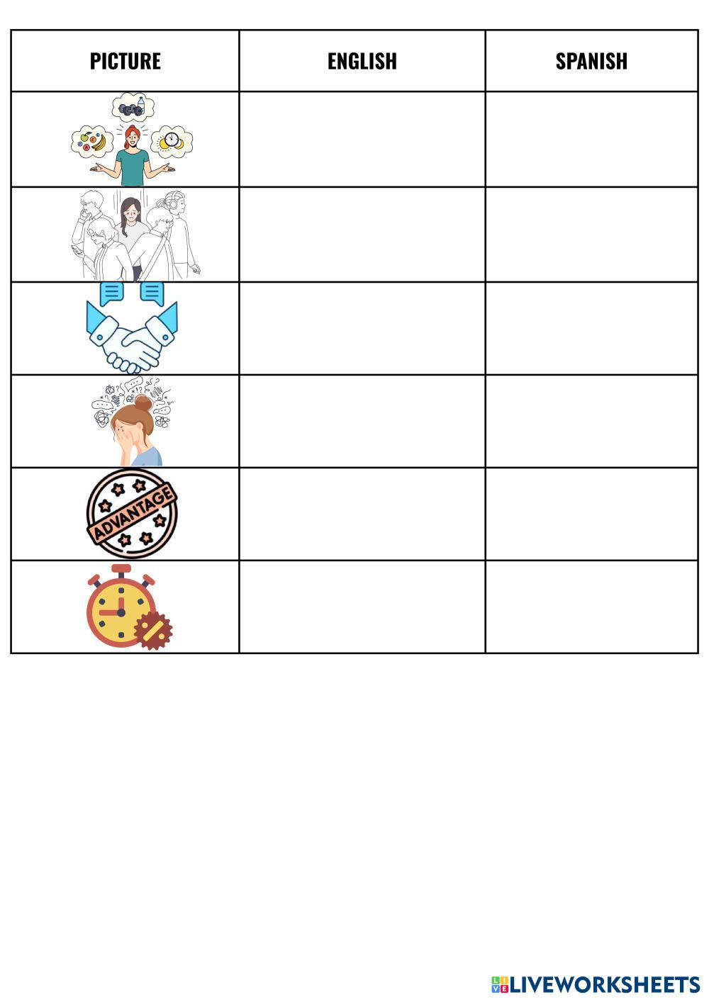 Escribe el sustantivo de cada imagen tanto en inglés como en español.