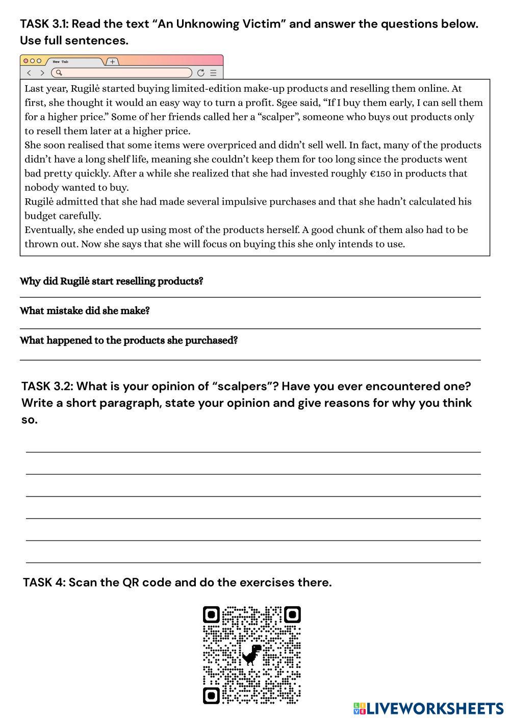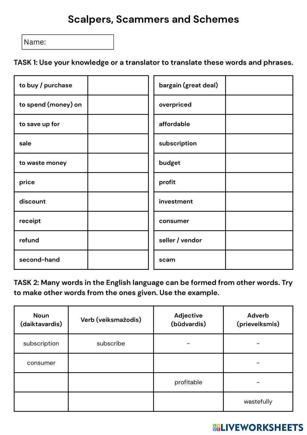 Created byeldariub . ESL English B1 Vocabulary English Author's Instructions Use your skills to do the tasks My Google Classroom Courses × 0 classes selected (0 students total) Quick Access Select all classes (0 classes) All Classes Loading courses... Cancel Share Share to selected Course __COURSE_NAME__ __STUDENT_NAME__ (__STUDENT_EMAIL__) Scalpers, Scammers and Schemes Download Worksheet Validation Check my answers Emails my answers to my teacher Full name Group/level School subject Teacher's email or key code Close Submit Validating worksheet... (12) Your answers have been sent to your teacher. Good luck! OK We encountered an error submitting your answers. Please try again. OK Advertisement | Go Ad Free Created byeldariub . ESL English B1 Vocabulary English Author's Instructions Use your skills to do the tasks Explore Worksheets Revision: Working life ESL B1 Revision: Working life Vocabulary - ESL - IRREGULAR VERBS PAST PARTICIPLE ESL B1 IRREGULAR VERBS PAST PARTICIPLE Vocabulary - ESL WRITE THE CORRECT FORM OF THE VERBS THE FOOD I LIKE ESL B1 THE FOOD I LIKE Vocabulary - ESL Write and fill the blanks Health and Illness - Vocabulary Worksheet ESL B1 Health and Illness - Vocabulary Worksheet Vocabulary - ESL This B1-level ESL worksheet contains English vocabulary about health and illness.