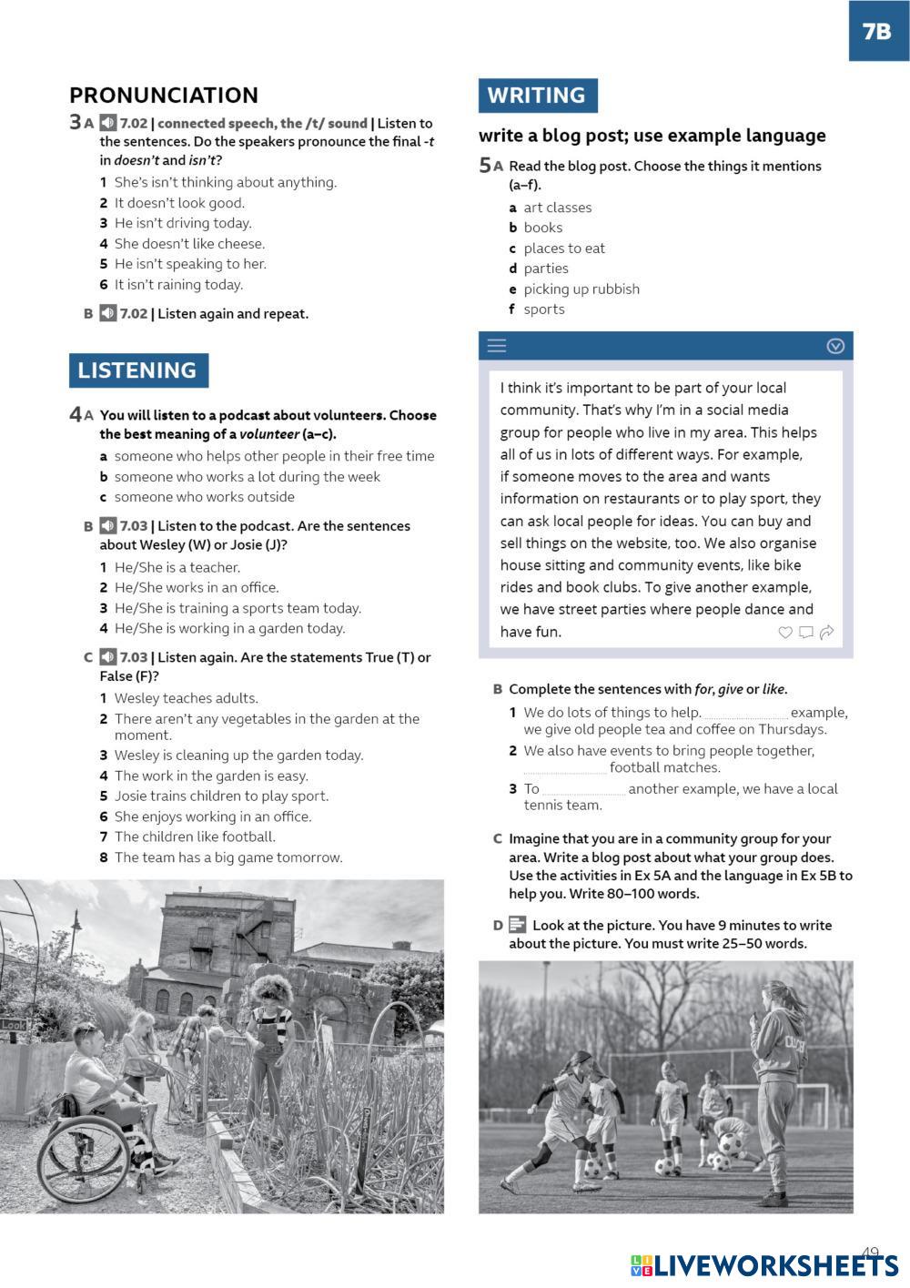Created by Aleks2020 ESL English A2 Vocabulary English Author's Instructions SPEAK OUT A2 Lesson 7B WB My Google Classroom Courses × 0 classes selected (0 students total) Quick Access Select all classes (0 classes) All Classes Loading courses... Cancel Share Share to selected Course __COURSE_NAME__ __STUDENT_NAME__ (__STUDENT_EMAIL__) SPEAK OUT A2 Lesson 7B WB Download Worksheet Validation Check my answers Emails my answers to my teacher Full name Group/level School subject Teacher's email or key code Close Submit Validating worksheet... (12) Your answers have been sent to your teacher. Good luck! OK We encountered an error submitting your answers. Please try again. OK Advertisement | Go Ad Free Created by Aleks2020 ESL English A2 Vocabulary English Author's Instructions SPEAK OUT A2 Lesson 7B WB Explore Worksheets Comparative and superlative ESL A2 Comparative and superlative Vocabulary - ESL English as a second language Main content: Comparatives and superlatives SPEAK OUT A2 Lesson 7A WB ESL A2 SPEAK OUT A2 Lesson 7A WB Vocabulary - ESL SPEAK OUT A2 Lesson 7A WB KB4 Reinforcement worksheet U4 AFTER SCHOOL CLUB ESL A2 KB4 Reinforcement worksheet U4 AFTER SCHOOL CLUB Vocabulary - ESL Students decide which verb goes with each picture. They use the information to complete the text. Match the pictures with the verbs. Use the information to complete the text. Shopping Items A2 Connect the word with the picture ESL A2 Shopping Items A2 Connect the word with the picture Vocabulary - ESL Connect the word to the picture.